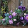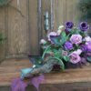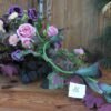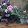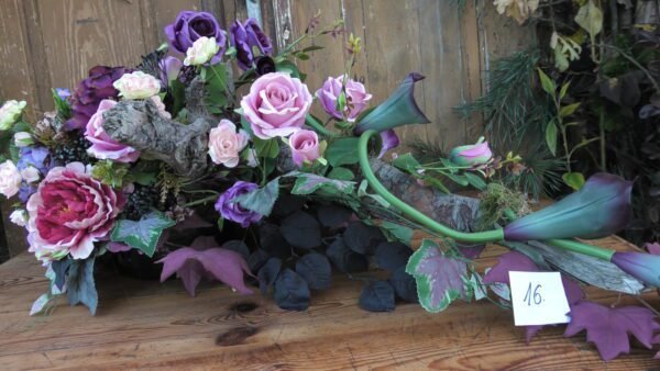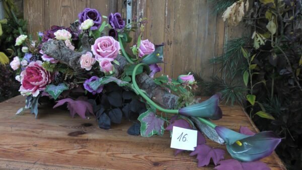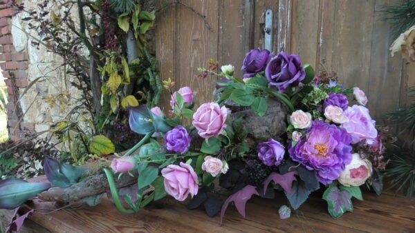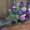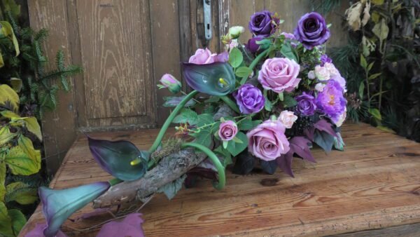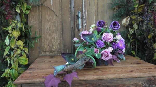 Kompozycja na korzeniu z kallami w kolorze różowo-fioletowym