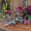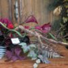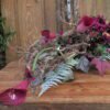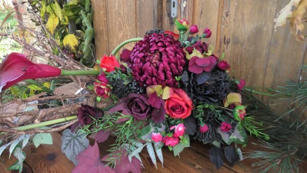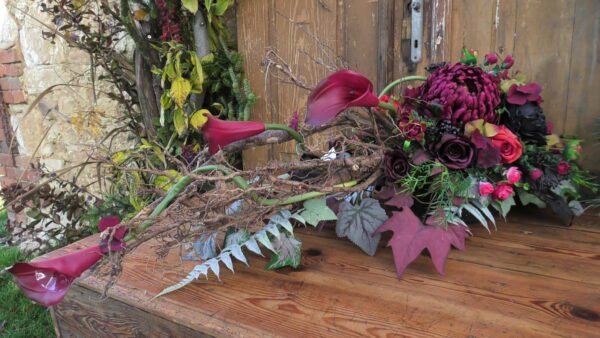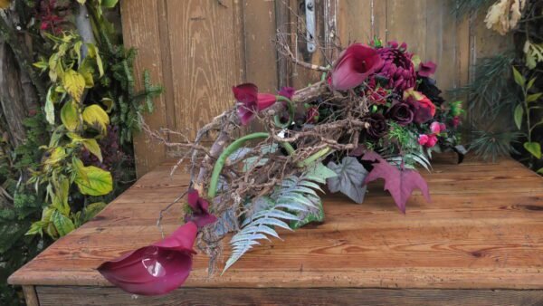 Kompozycja leżąca na korzeniu z chryzantemą i kallami w kolorystyce czerwonej i czarnej