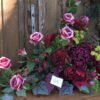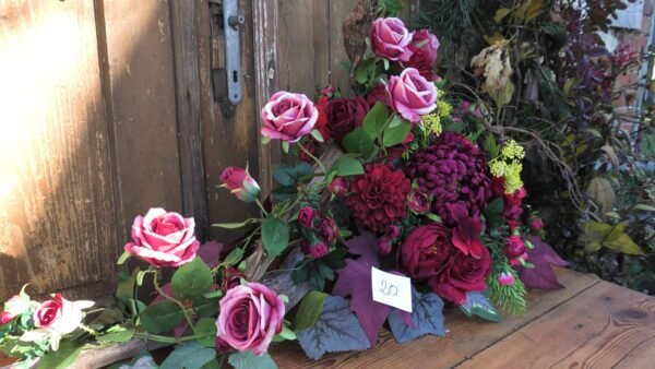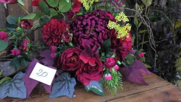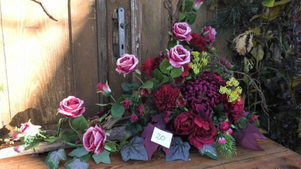 kompozycja stojąco-leżąca na korzeniu z różami i chryzantemą w kolorze czerwonym
