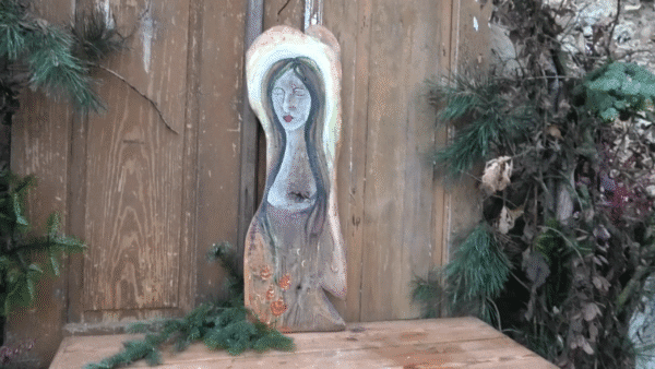 Duży anioł na starej desce z namalowanymi czerwonymi kwiatami