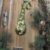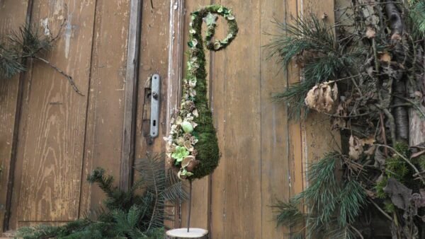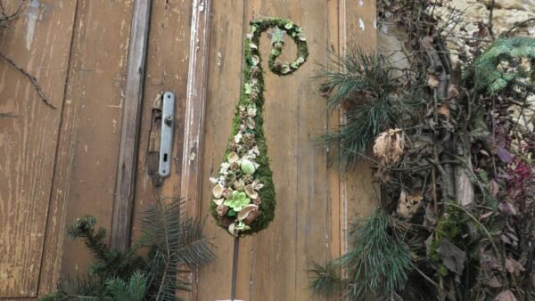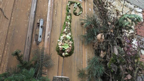 Choinka zrobiona z siana obtoczona zielonym mchem, wyklejona dekoracją z suszonych egzotycznych roślin z zakręconą końcówką.