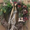 Wianek wypleciony z chmielu , udekorowany zielonymi gałązkami i suszonymi roślinami z kokardy zwisają różki koziołka.
