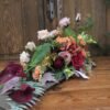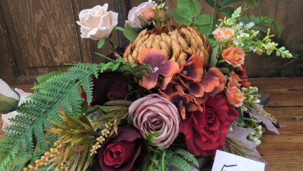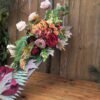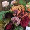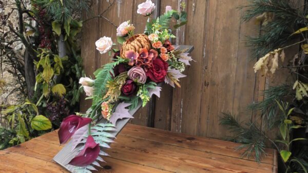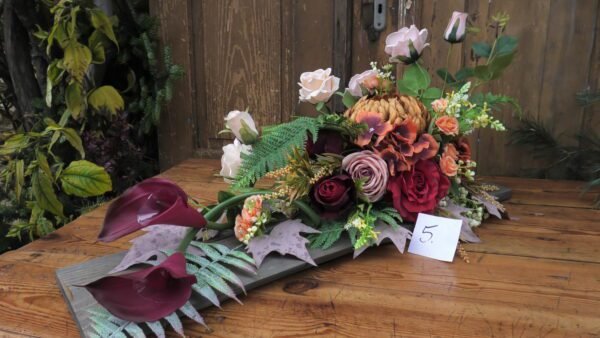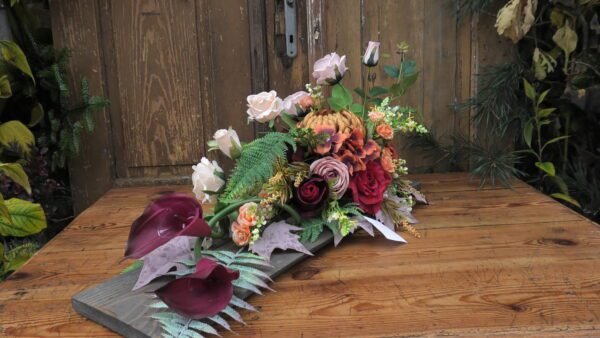 Kompozycja na desce w kolorze Czerwono-brązowym z dominującą chryzantemom i kallami