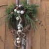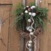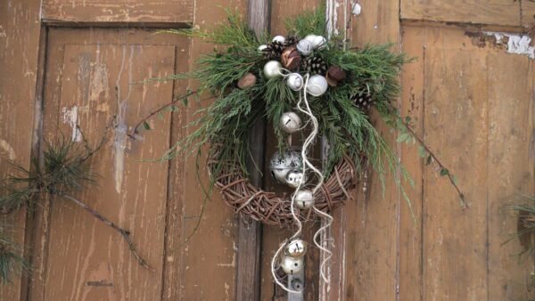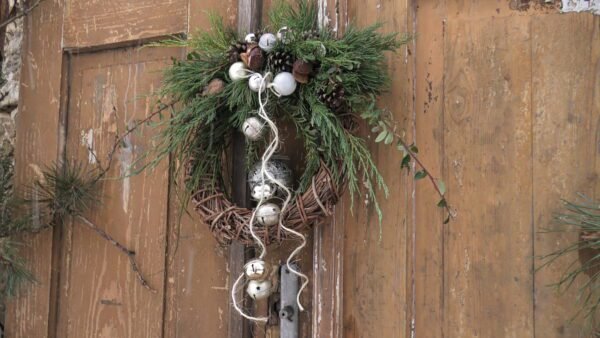 Wianek wypleciony z chmielu, udekorowany zielonymi gałązkami. Przyklejone plastikowe bombki i zwisające dzwonki.