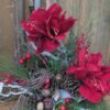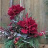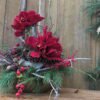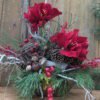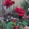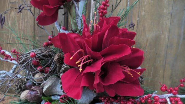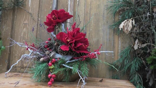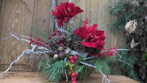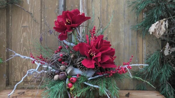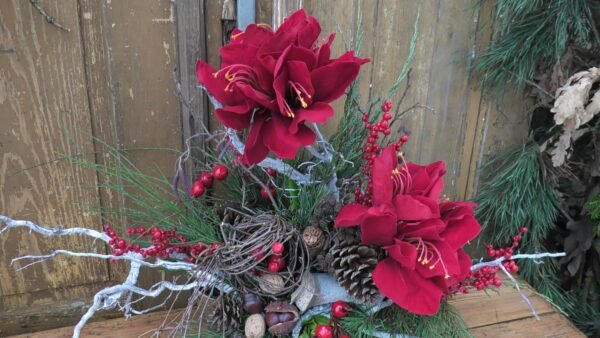 Kompozycja wykonana w obciążonej donicy ,na żywym stroiszu i korzeniach pomalowanych na biało. Dodatkowe dekoracje to sztuczna dzika róża i ogniki. Naturalne szyszki i owoce.