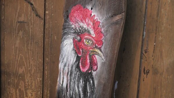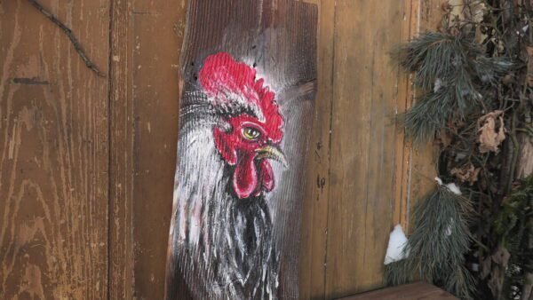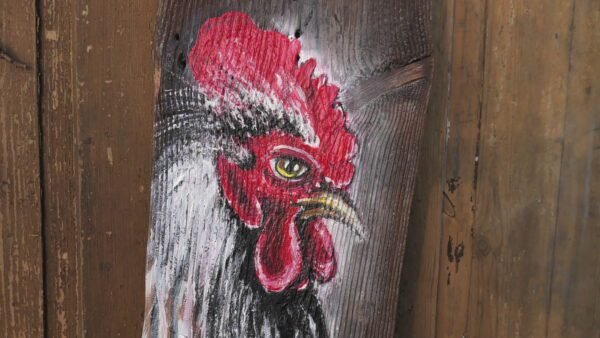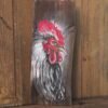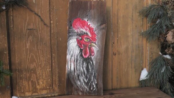 Kogut malowany akrylami na starej 100 letniej desce , zaimpregnowany werniksem i lakierem bezbarwnym.