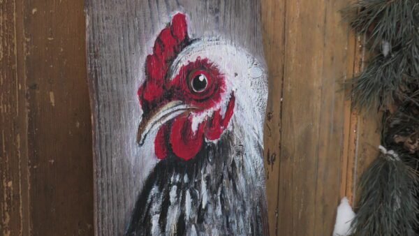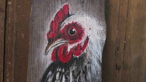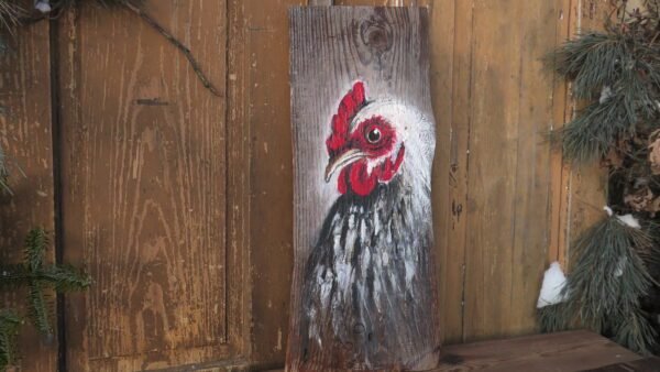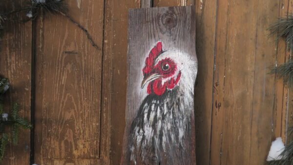 Kura malowana akrylami na starej 100 letniej desce , impregnowana werniksem i lakierem bezbarwnym.