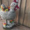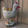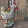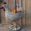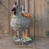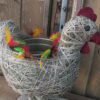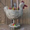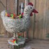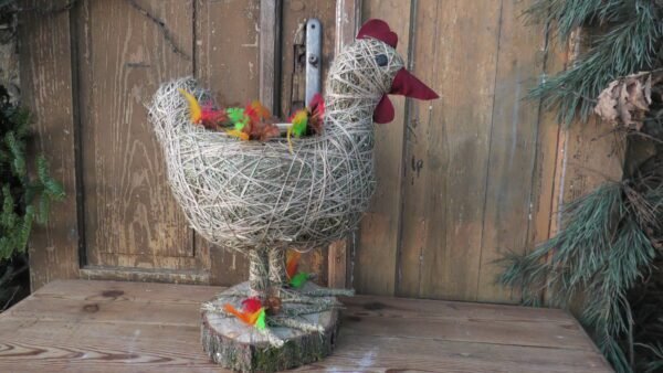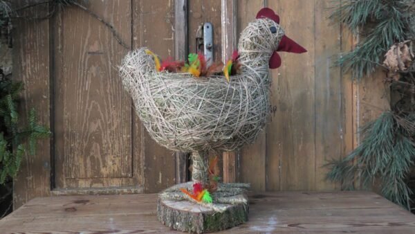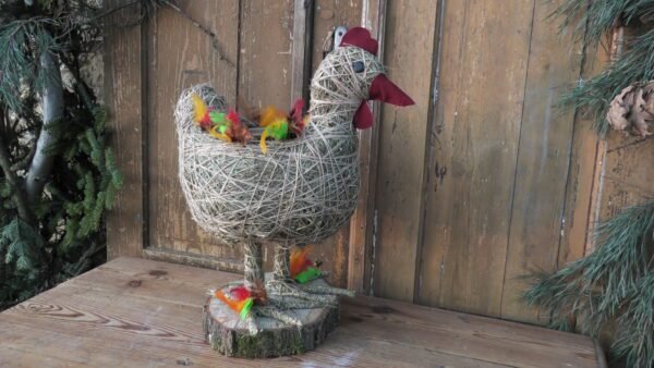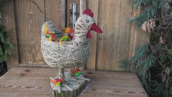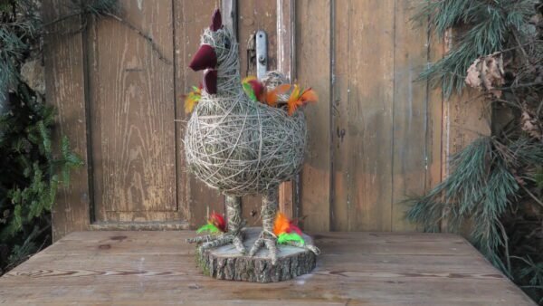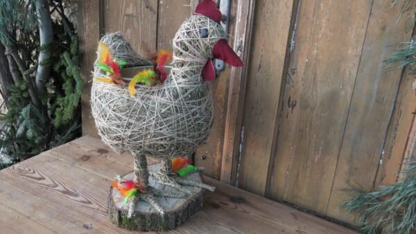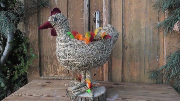 Kura wykonana z siana i sznurka sizalowego , stojąca na plastrze drewna , na grzbiecie ma miseczkę na kwiatki.