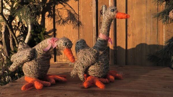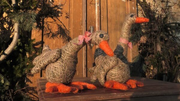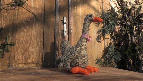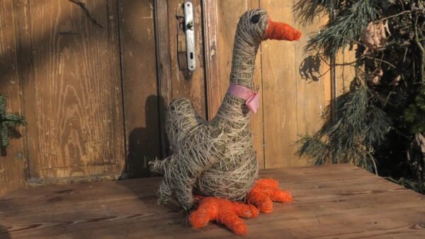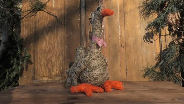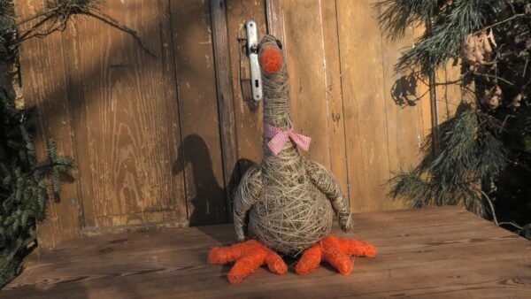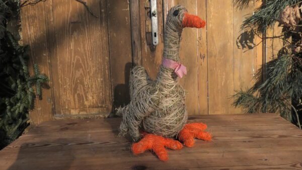 Gąska wykonana z siana i sznurka jutowego. Nóżki i dziobek obtoczone pomarańczowym sizalem.