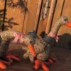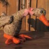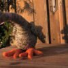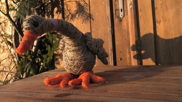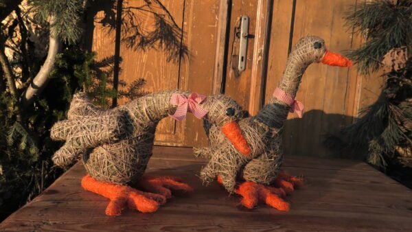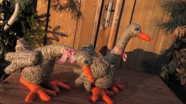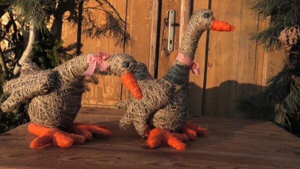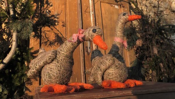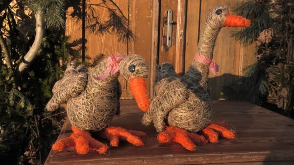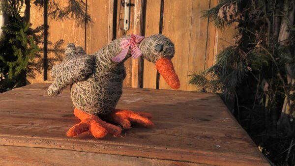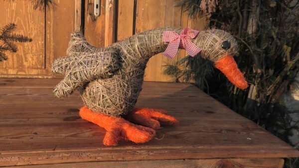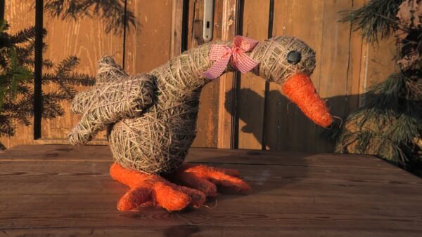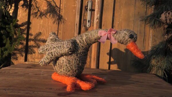 Gąska wykonana z siana i sznurka jutowego. Nóżki i dziobek obtoczone pomarańczowym sizalem.