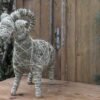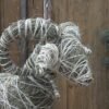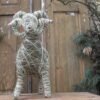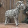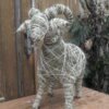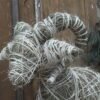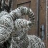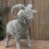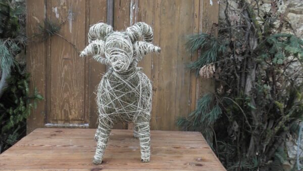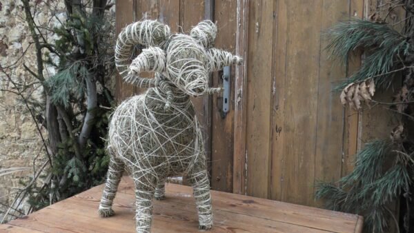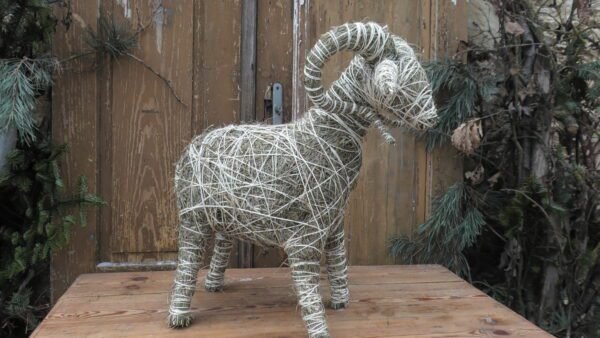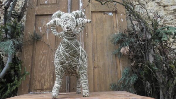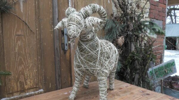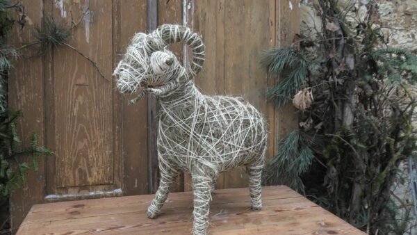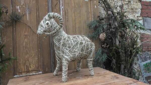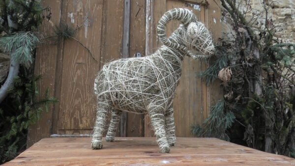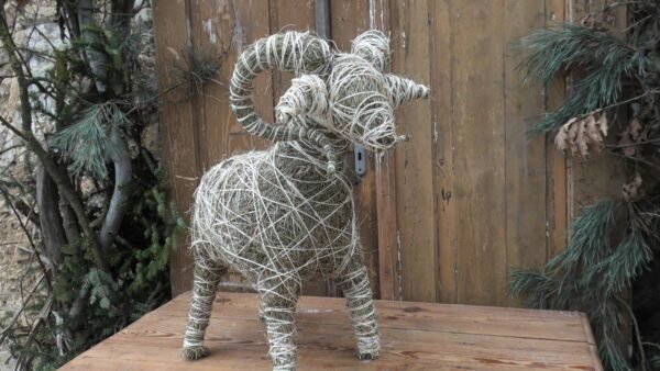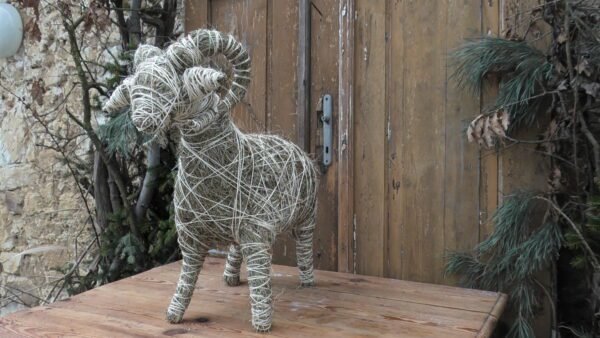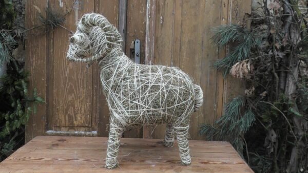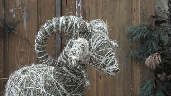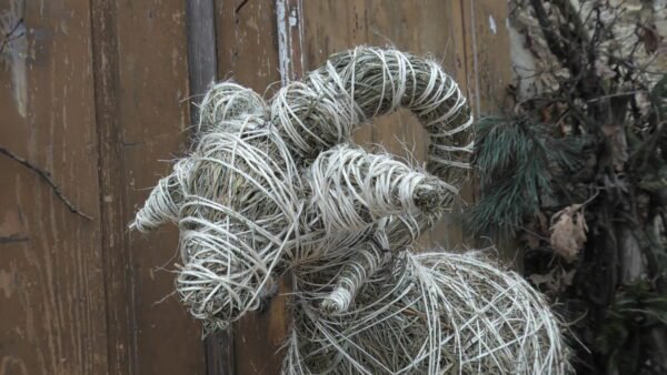 Baran wykonany z siana i sznurka sizalowego, nogi ma z patyków obtoczonych sianem.