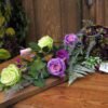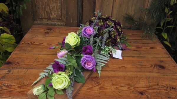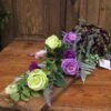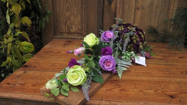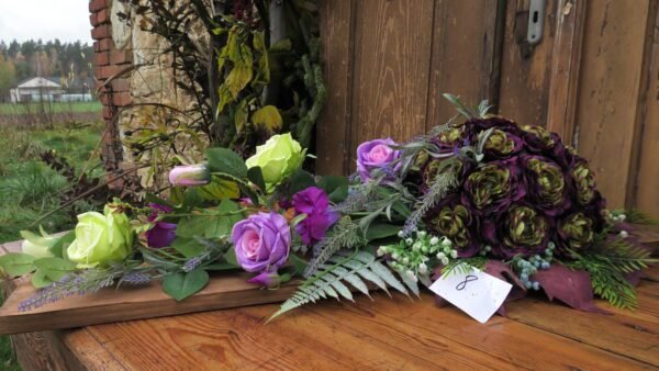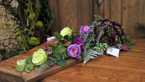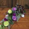 Kompozycja na desce z kulą kwiatów w kolorystyce fioletowo-zielonej