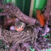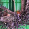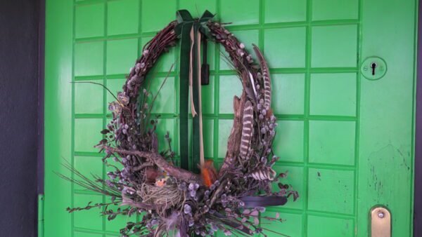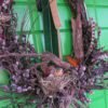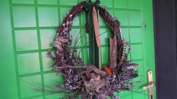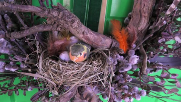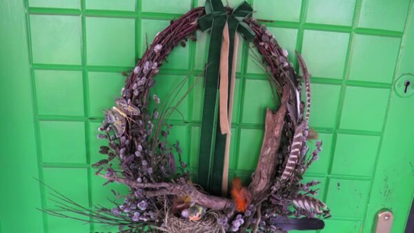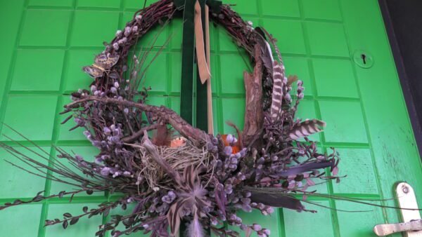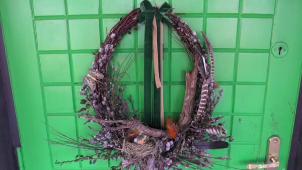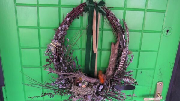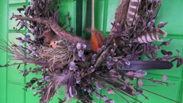 Wianek zrobiony z gałązek derenia , bazi , olszy i irgi .Wmontowany do środka korzeń a w nim gniazdko z ptaszkiem i jajkami.