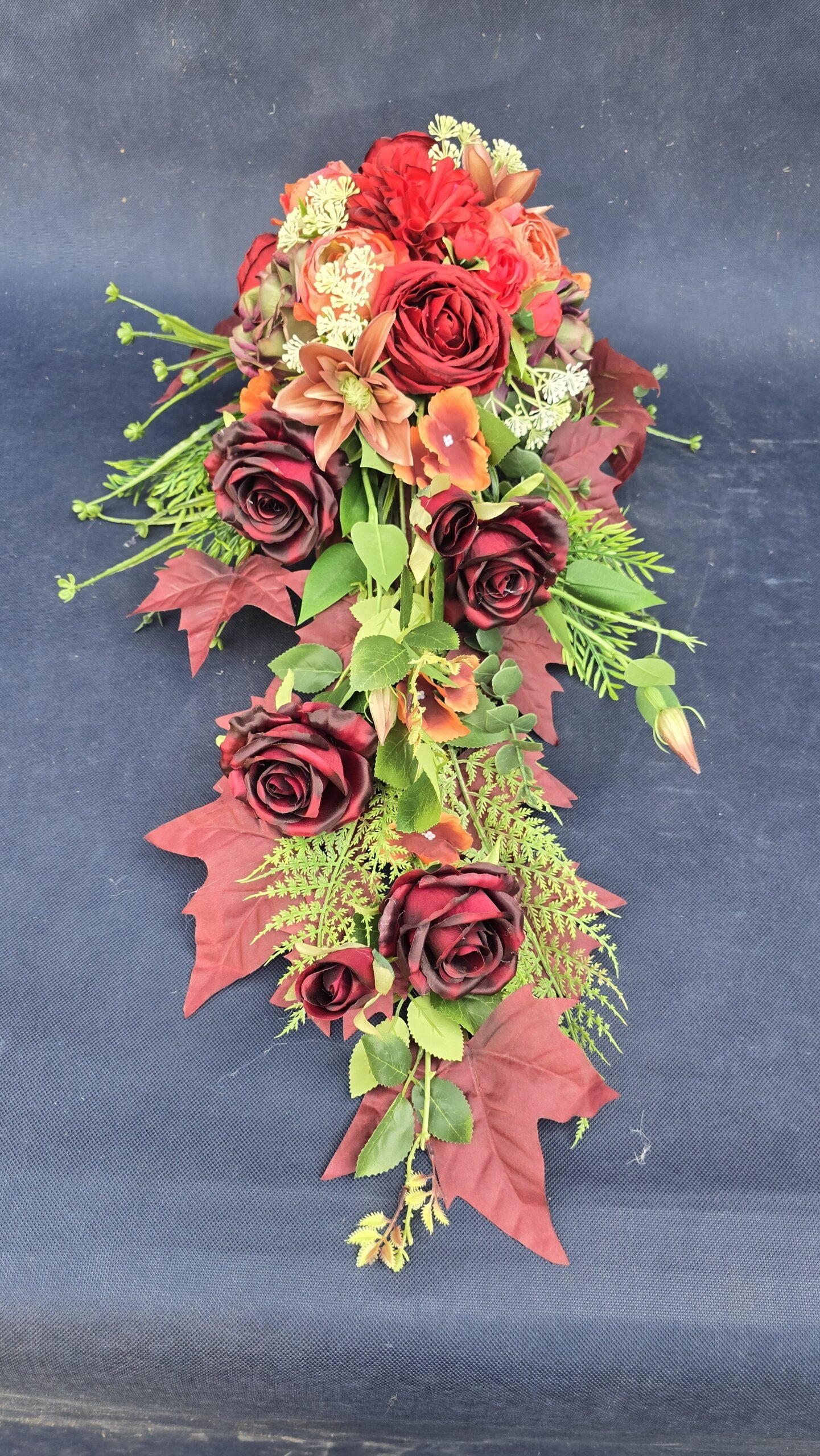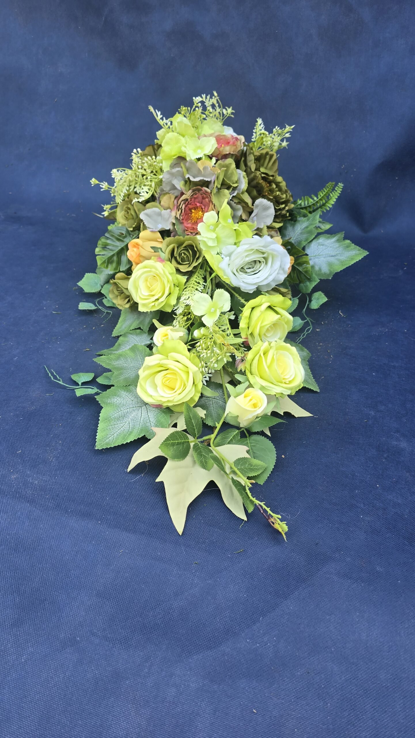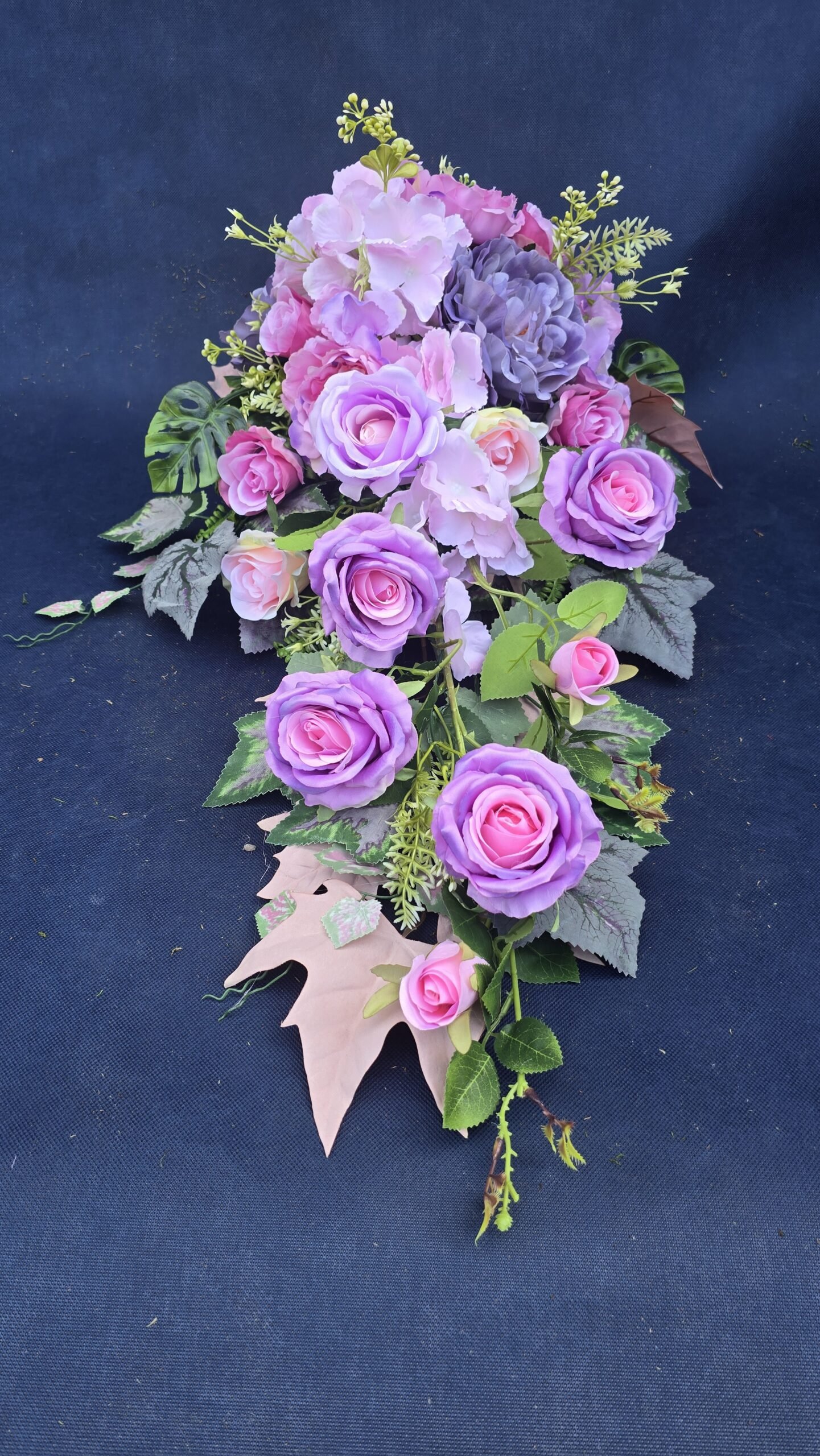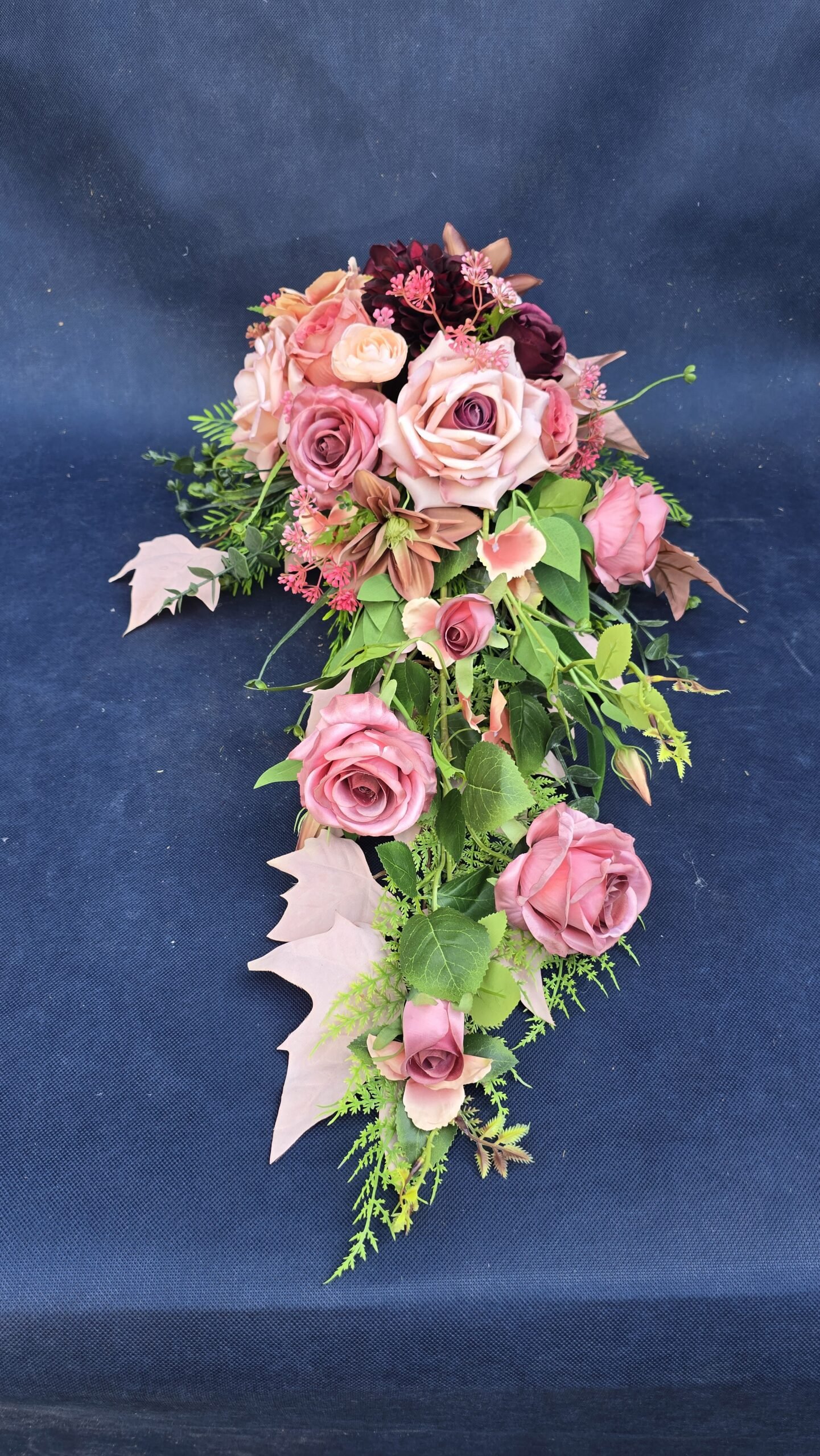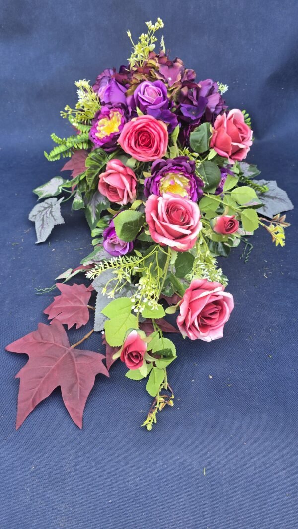 Kompozycja w kształcie łezki z gałązkami róż, pączkami i listkami, uzupełniona drobnymi kwiatuszkami i wieloma rodzajami liści. Kwiaty skupione są ku przodowi i delikatnie spływają w dół. Subtelna, lekka ozdoba nagrobna o naturalnym wyglądzie.