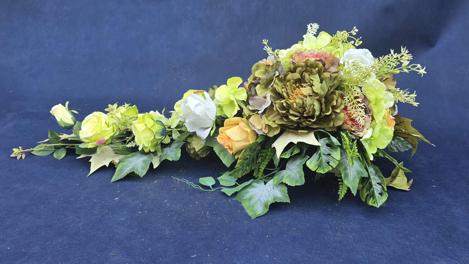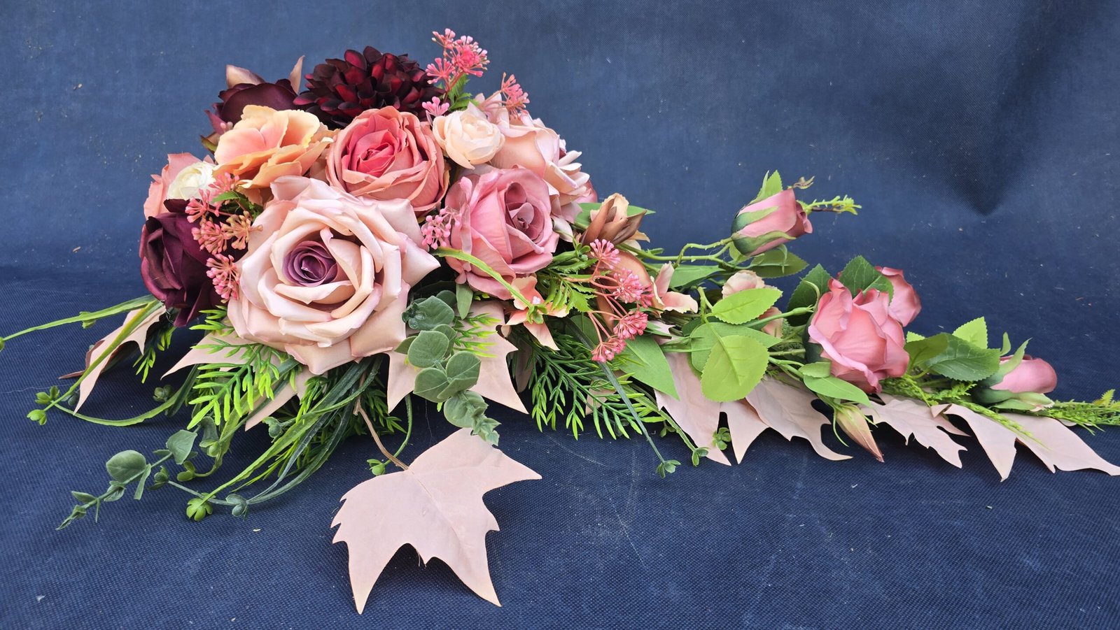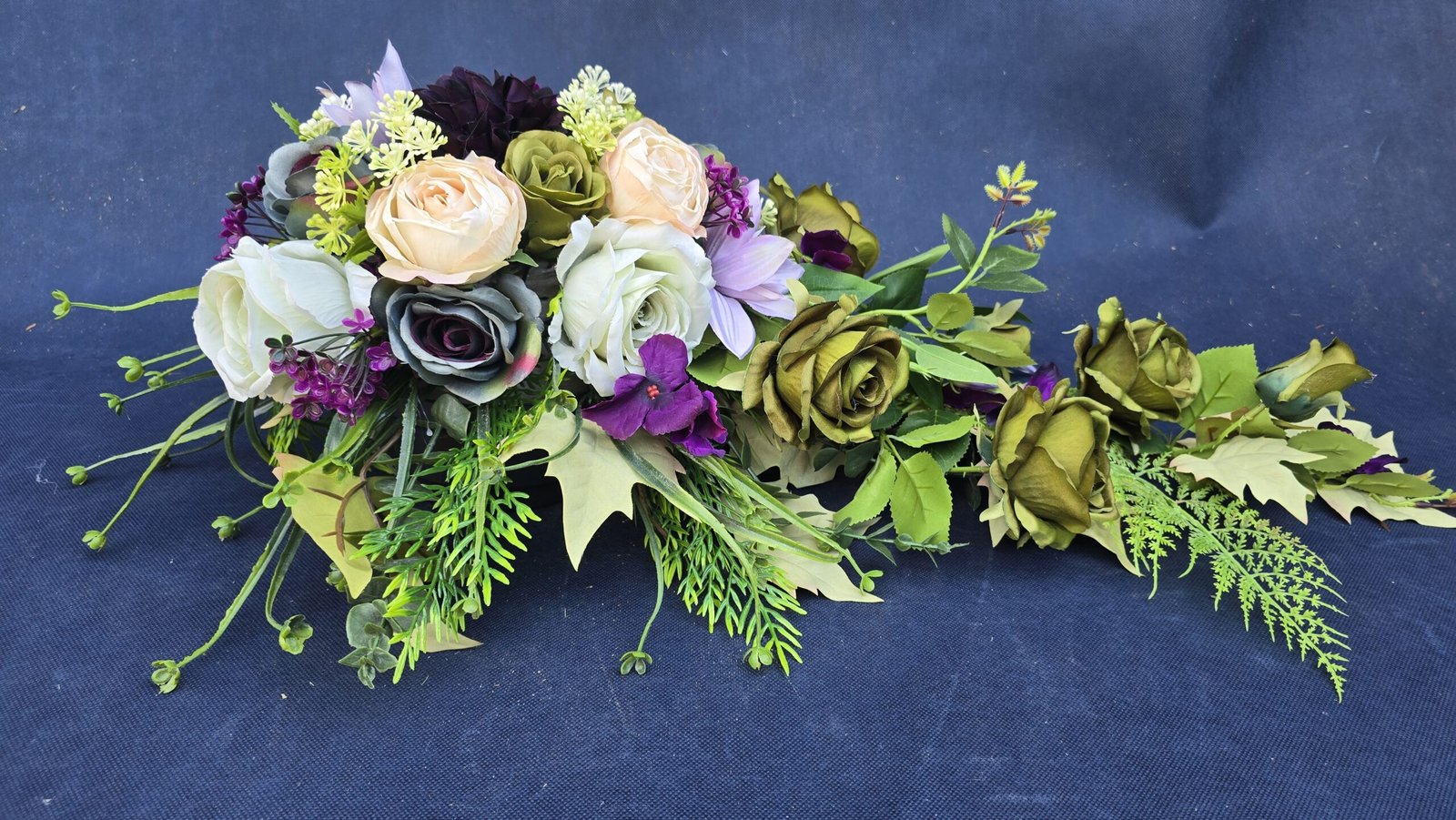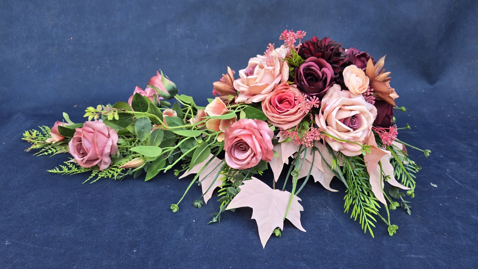 Kompozycja w kształcie łezki z gałązkami róż, pączkami i listkami, uzupełniona drobnymi kwiatuszkami i wieloma rodzajami liści. Kwiaty skupione są ku przodowi i delikatnie spływają w dół. Subtelna, lekka ozdoba nagrobna o naturalnym wyglądzie.