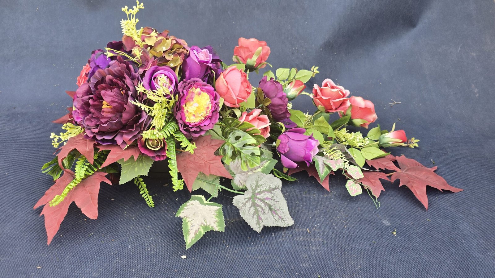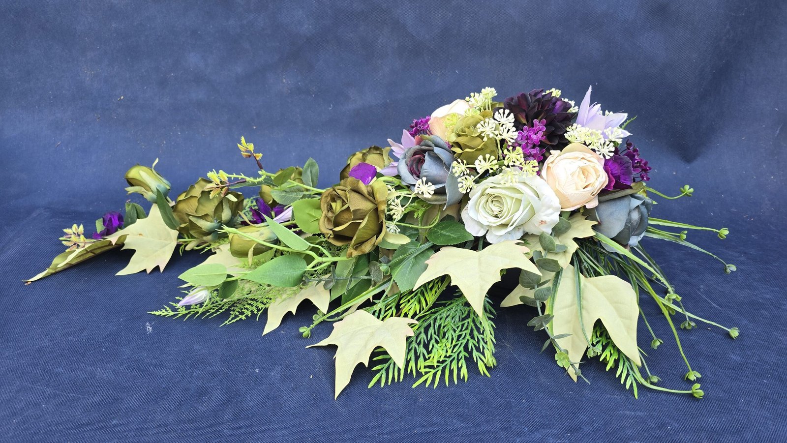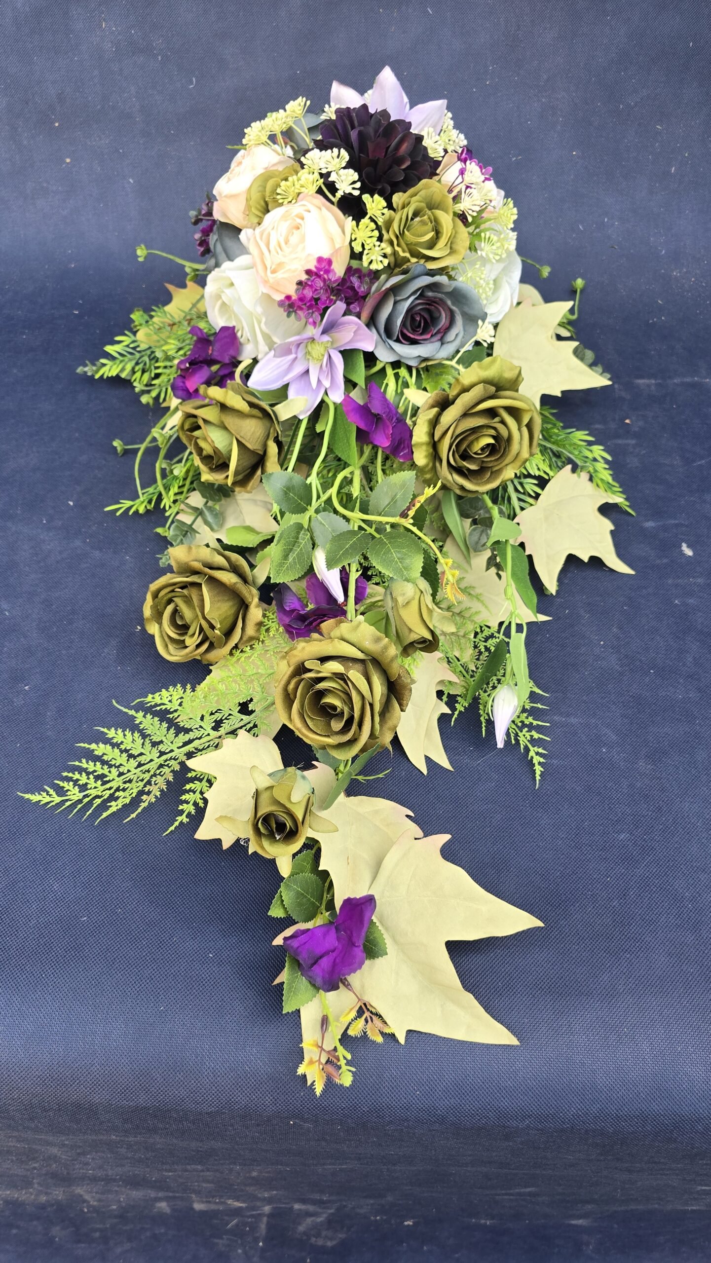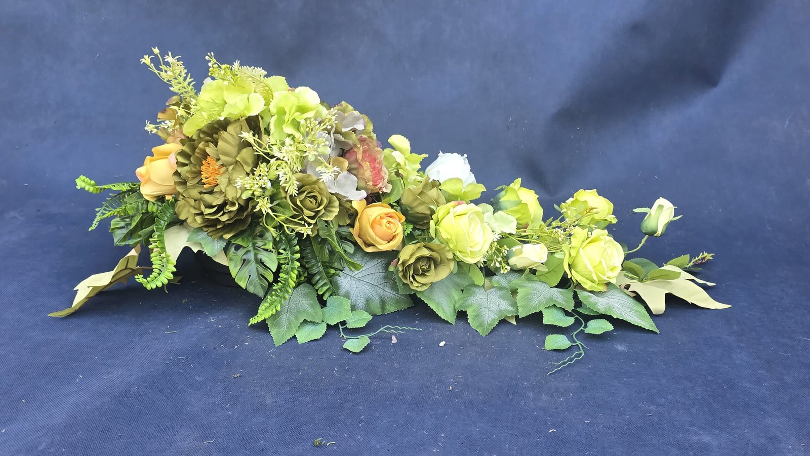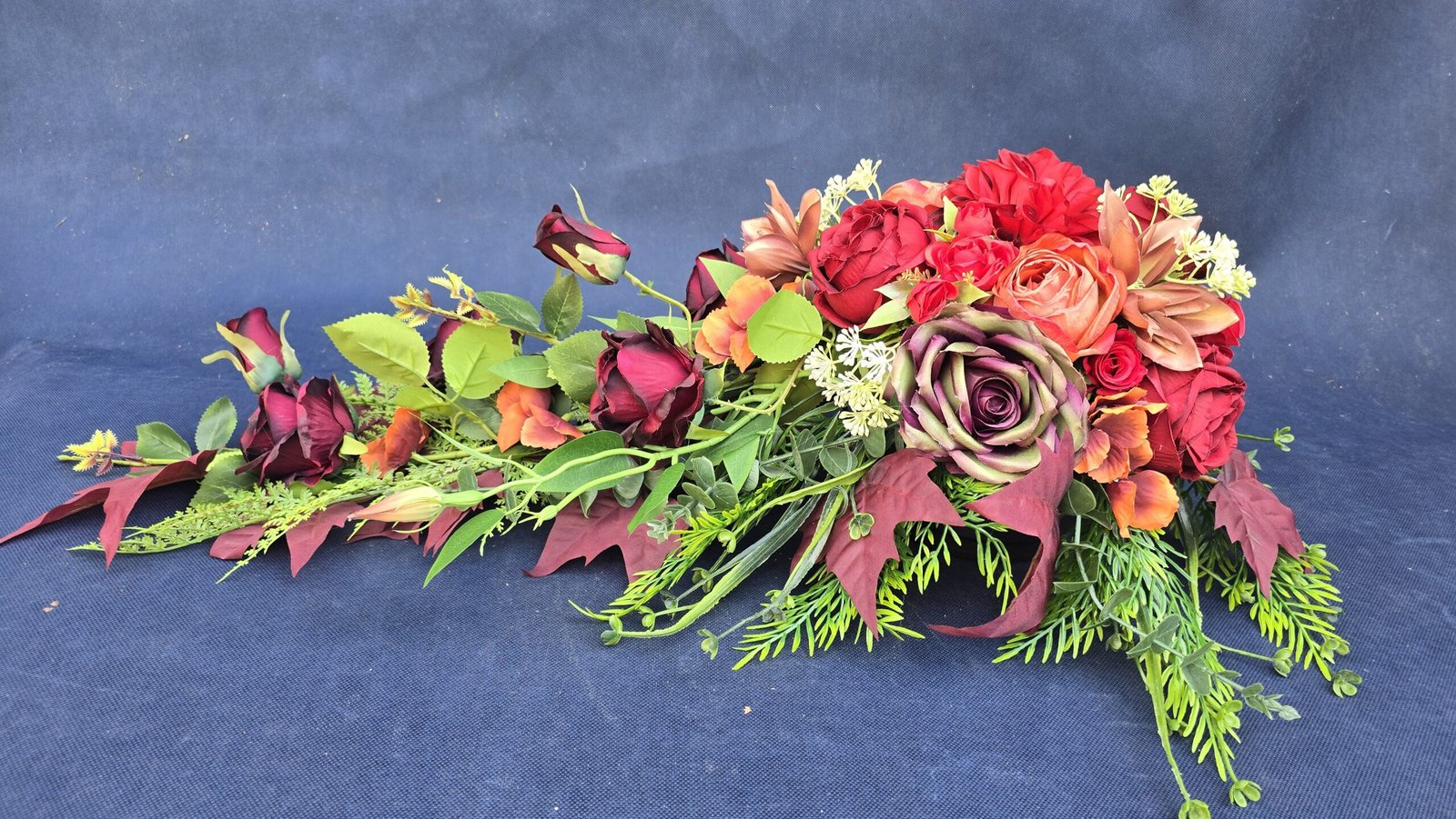 Kompozycja w kształcie łezki z gałązkami róż, pączkami i listkami, uzupełniona drobnymi kwiatuszkami i wieloma rodzajami liści. Kwiaty skupione są ku przodowi i delikatnie spływają w dół. Subtelna, lekka ozdoba nagrobna o naturalnym wyglądzie.