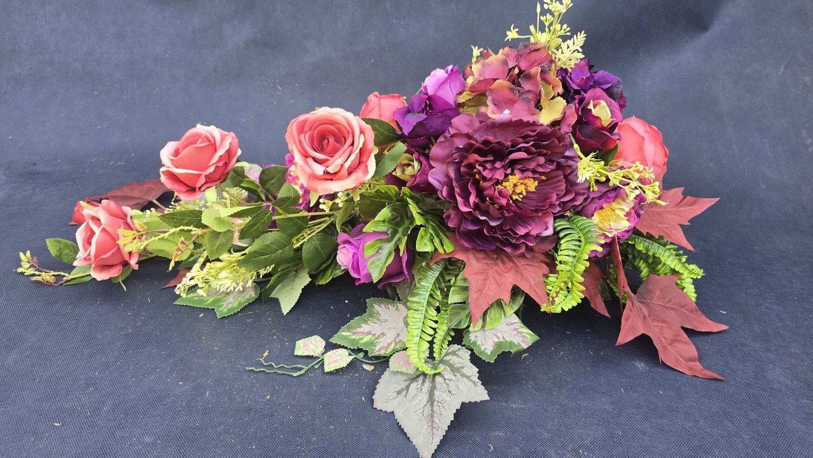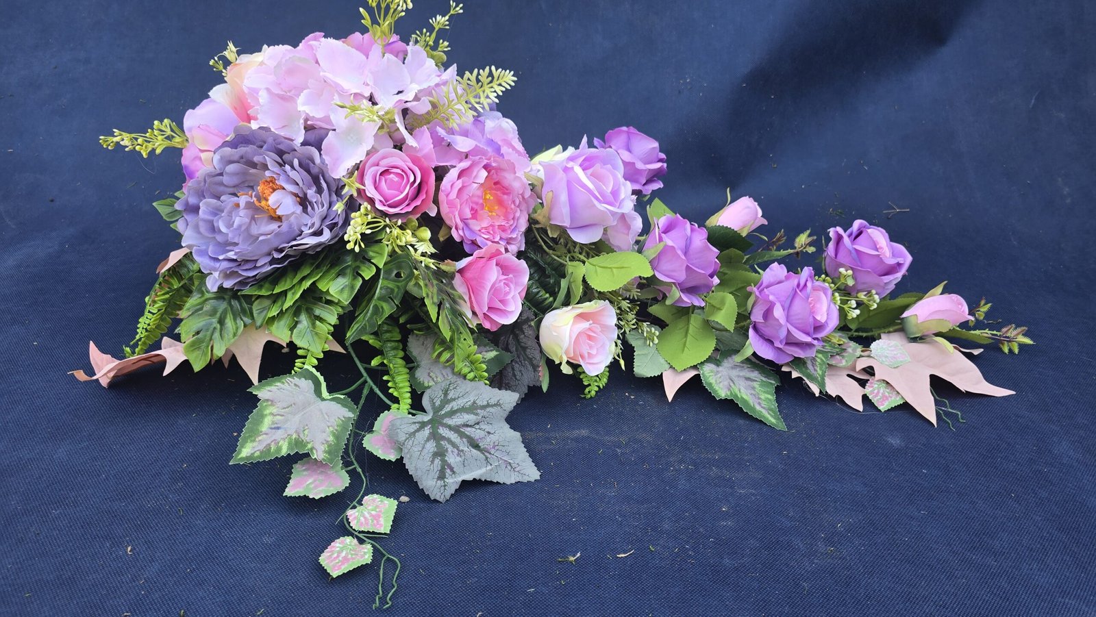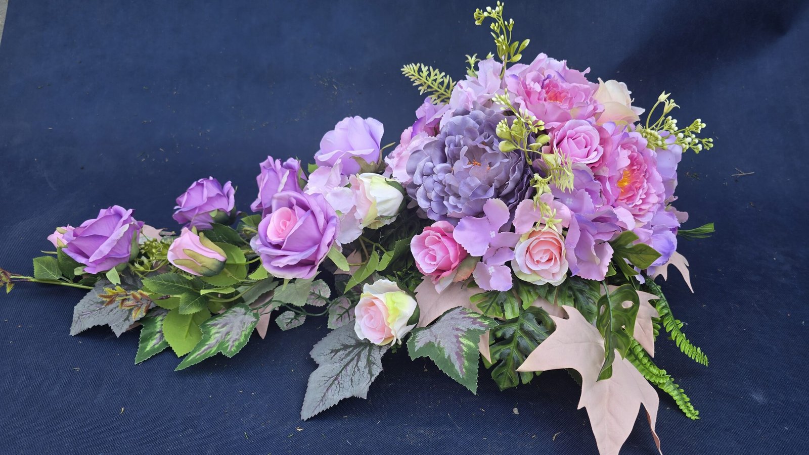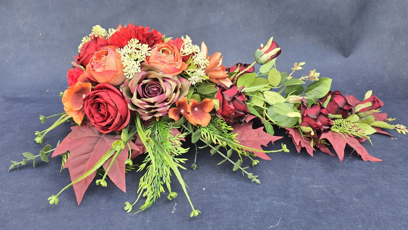 Kompozycja w kształcie łezki z gałązkami róż, pączkami i listkami, uzupełniona drobnymi kwiatuszkami i wieloma rodzajami liści. Kwiaty skupione są ku przodowi i delikatnie spływają w dół. Subtelna, lekka ozdoba nagrobna o naturalnym wyglądzie.