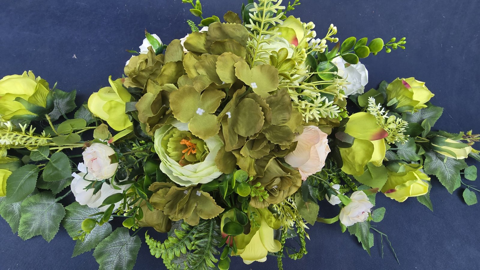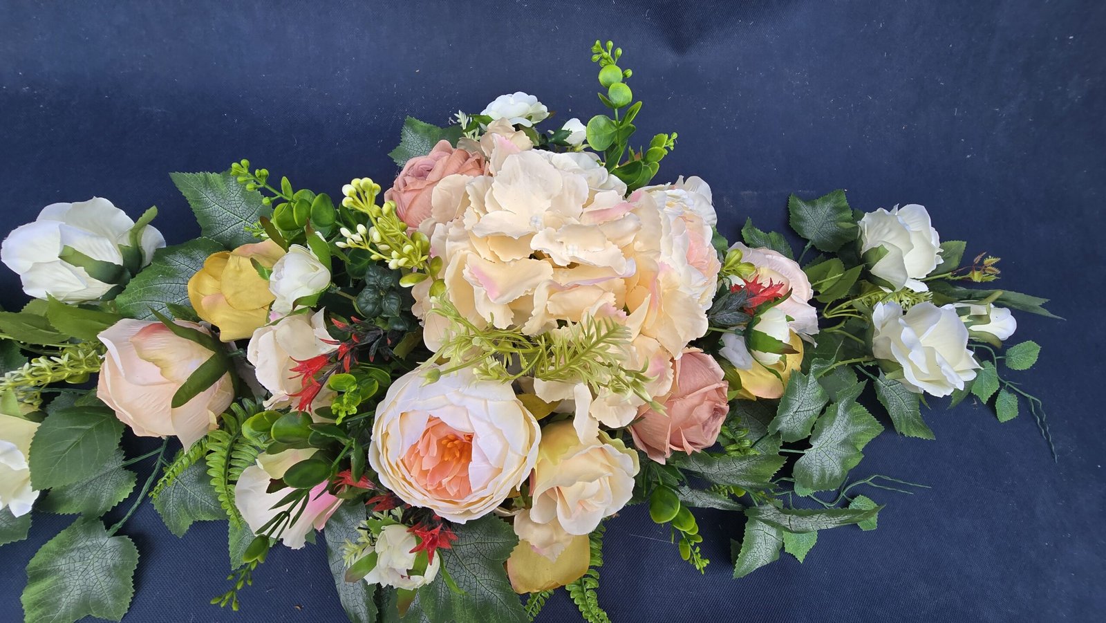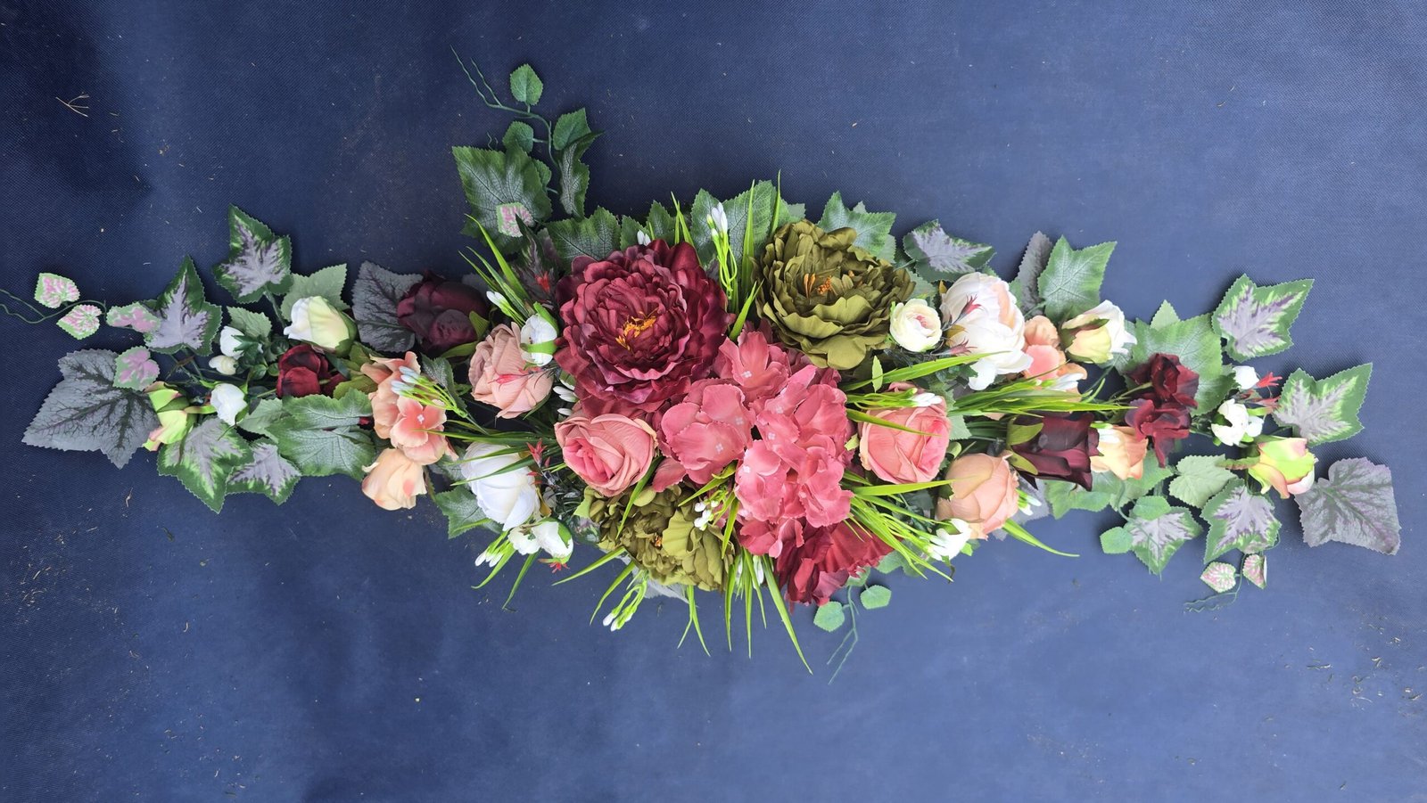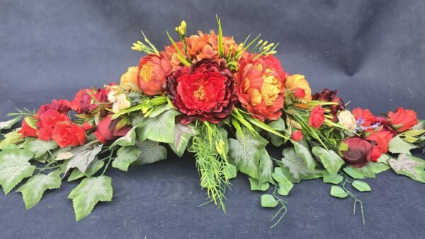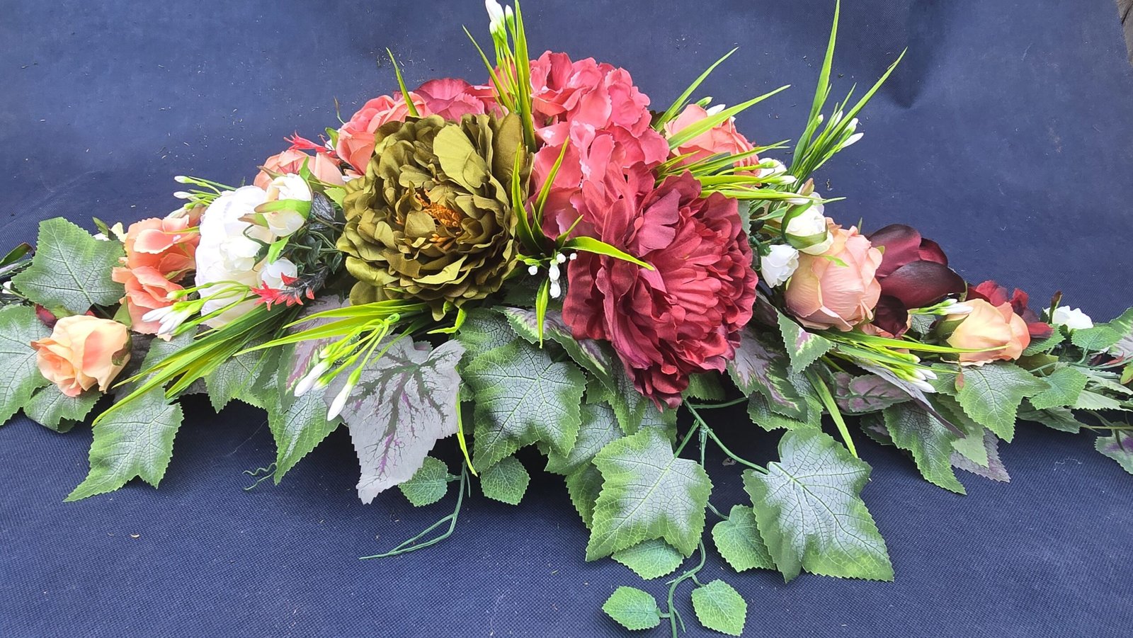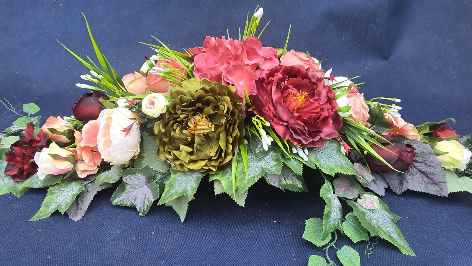 Łódka z centralnym bukietem róż, peonii i drobnych kwiatuszków, zwężająca się ku końcom. Spód wykończony liśćmi, trawkami i innymi dodatkami. Nieszablonowa kompozycja o wyraźnym, geometrycznym kształcie.