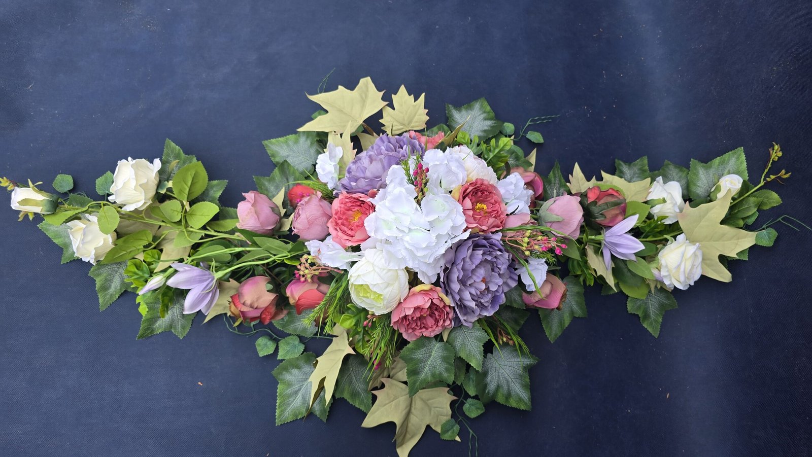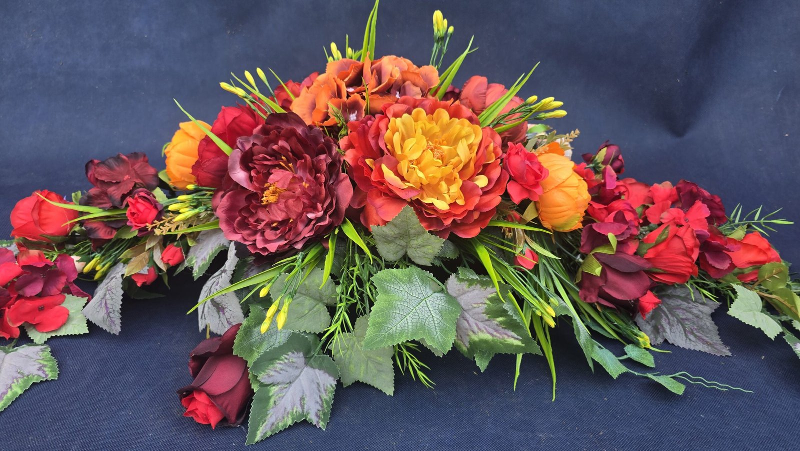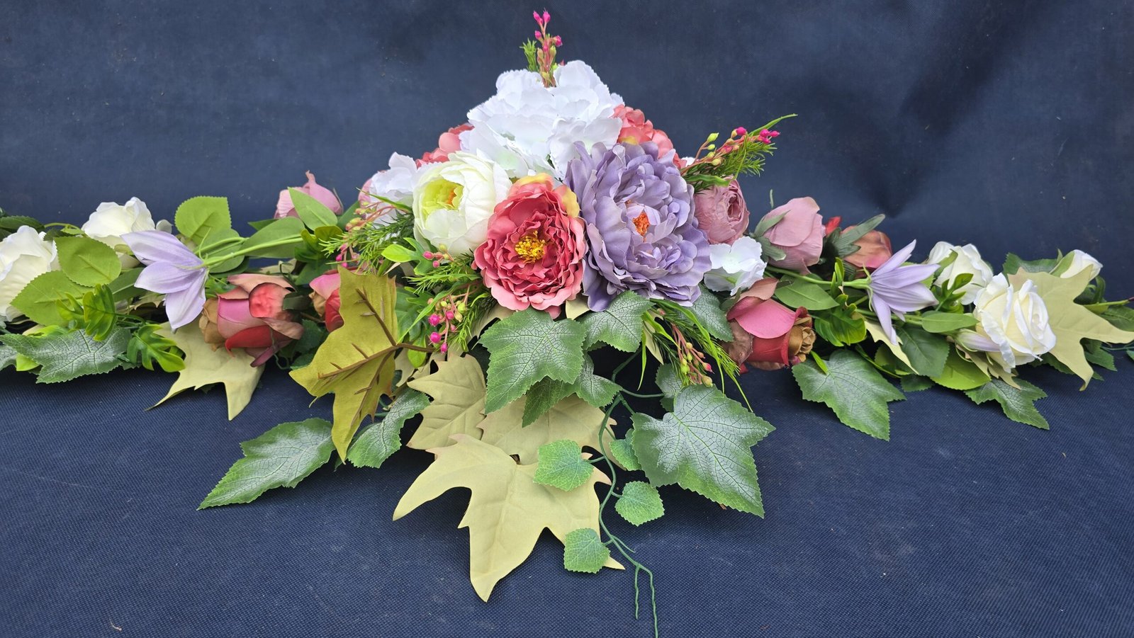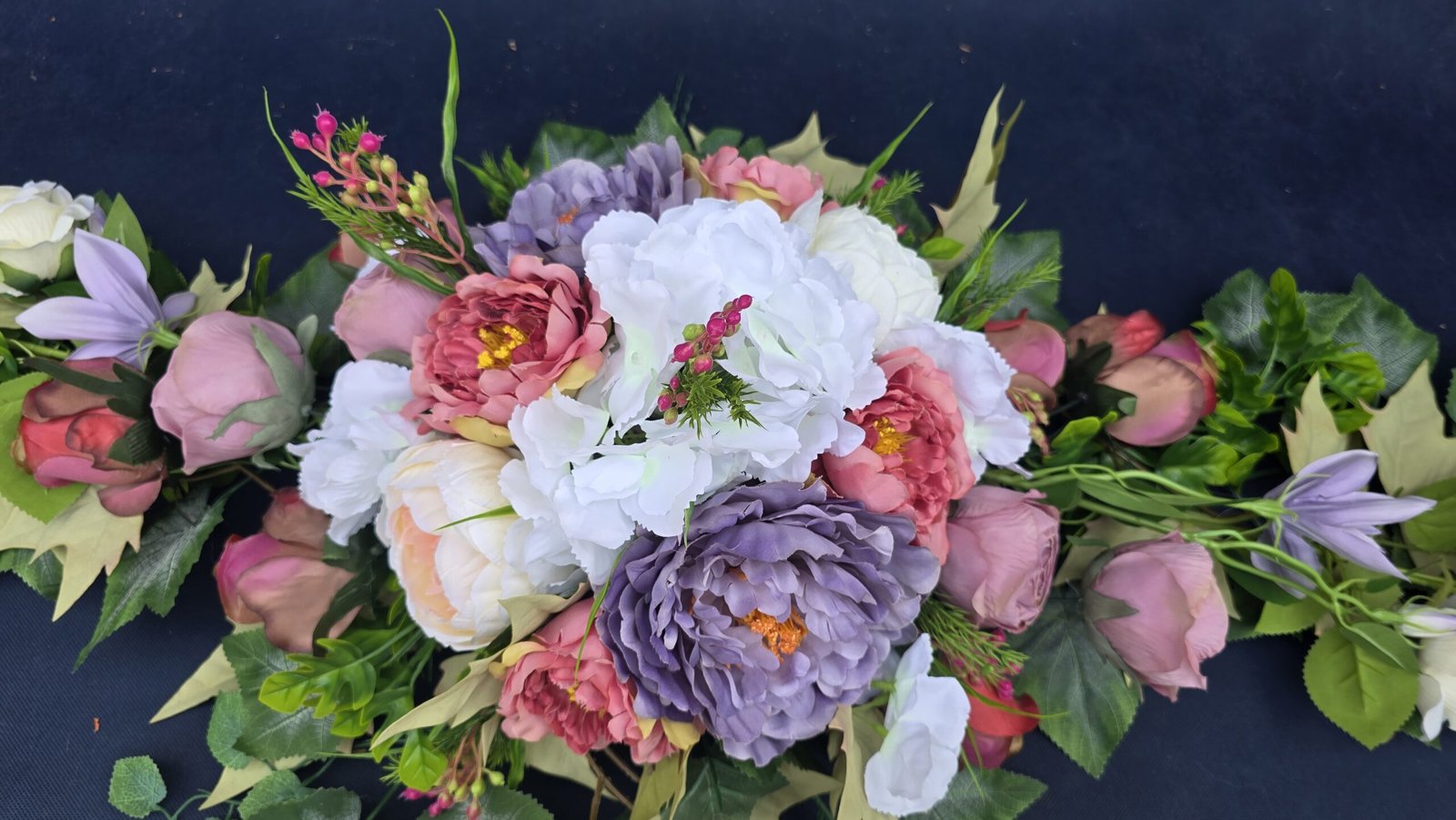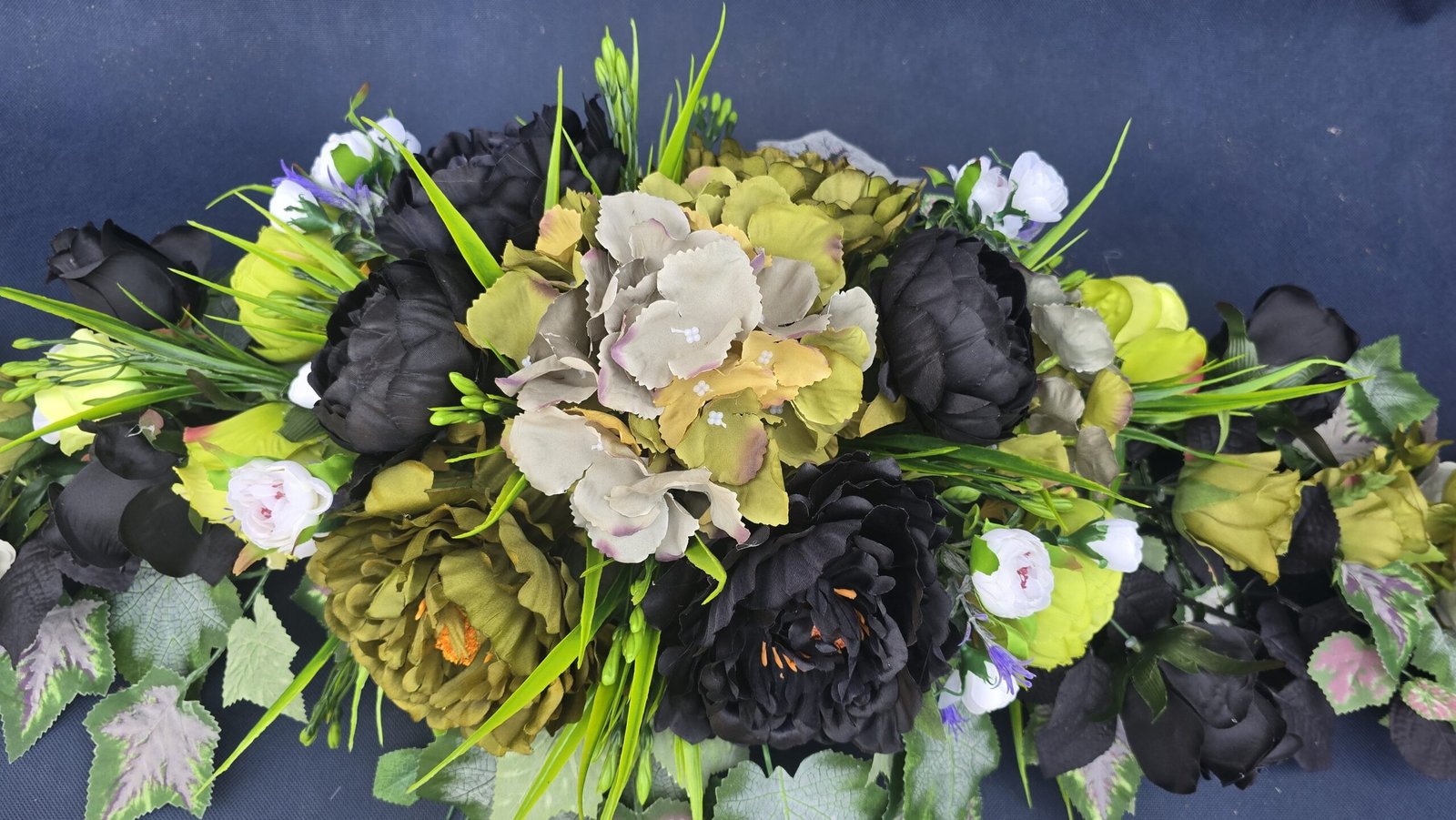 Łódka z centralnym bukietem róż, peonii i drobnych kwiatuszków, zwężająca się ku końcom. Spód wykończony liśćmi, trawkami i innymi dodatkami. Nieszablonowa kompozycja o wyraźnym, geometrycznym kształcie.