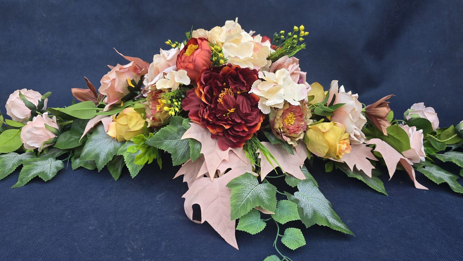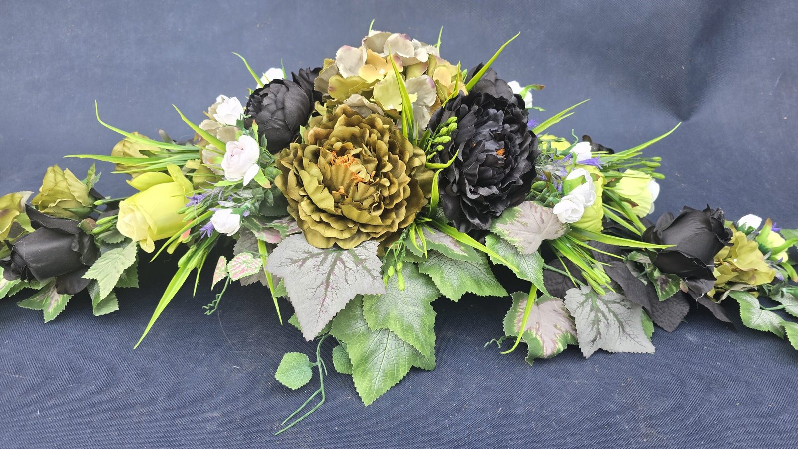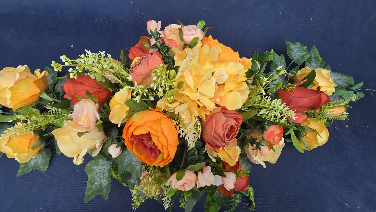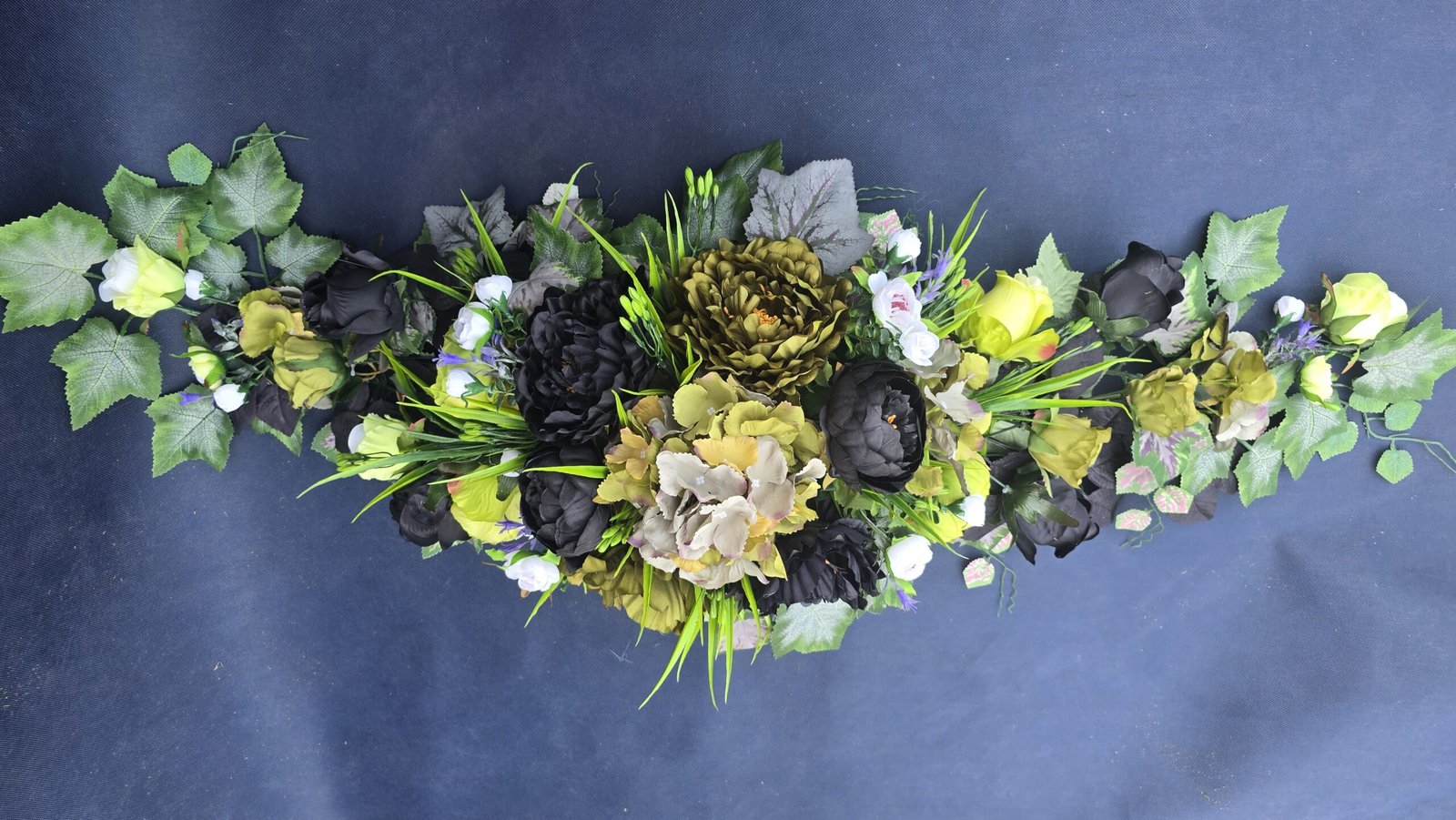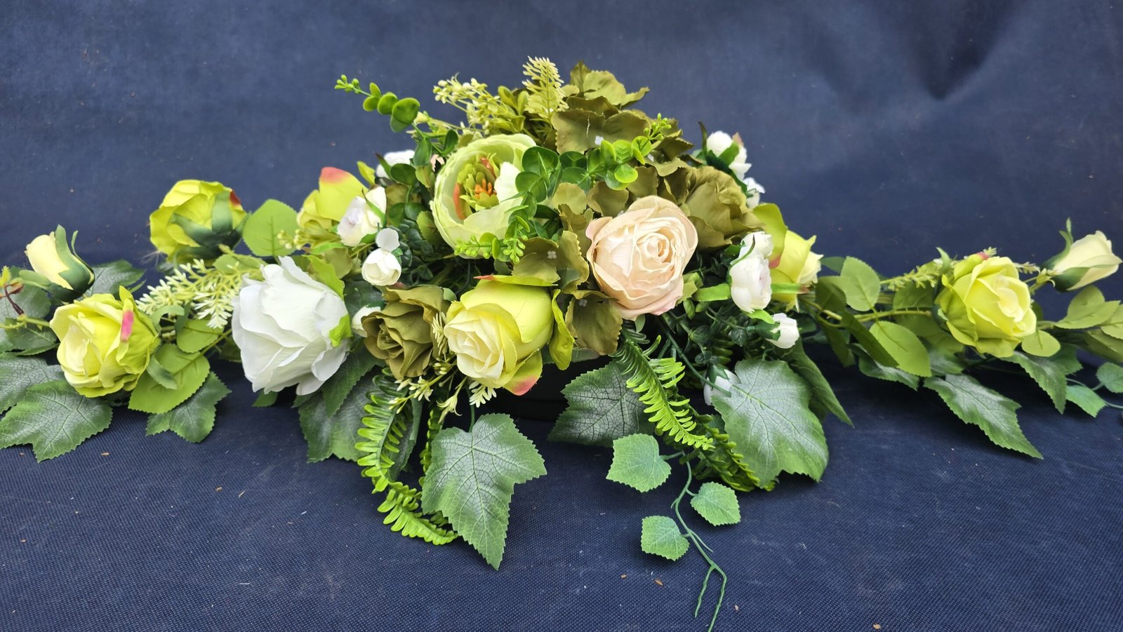 Łódka z centralnym bukietem róż, peonii i drobnych kwiatuszków, zwężająca się ku końcom. Spód wykończony liśćmi, trawkami i innymi dodatkami. Nieszablonowa kompozycja o wyraźnym, geometrycznym kształcie.