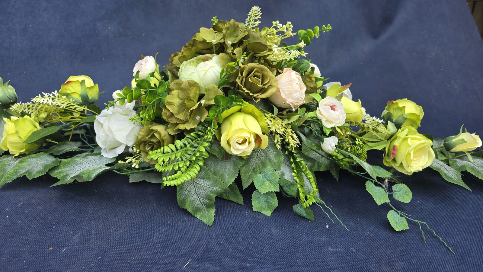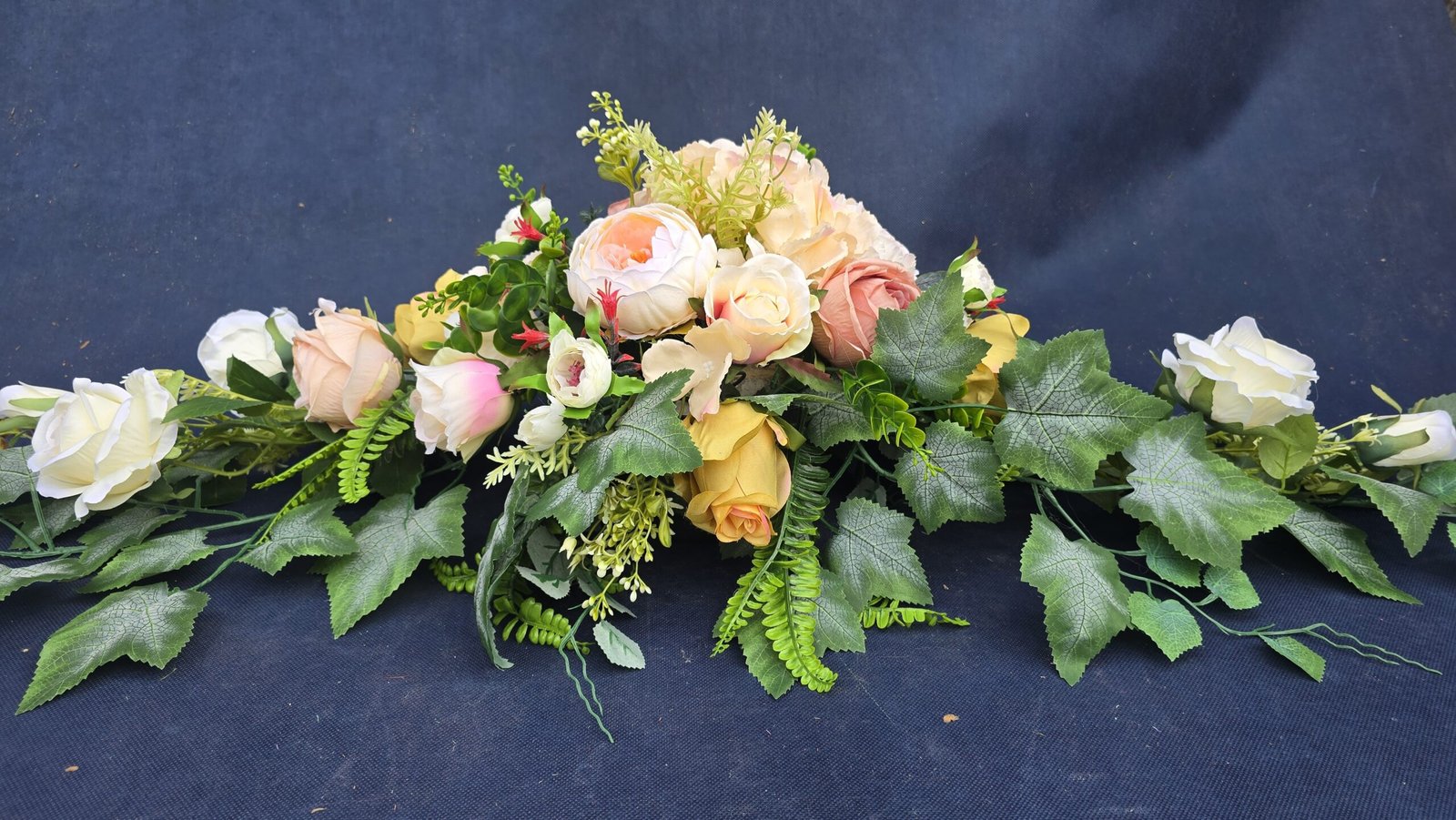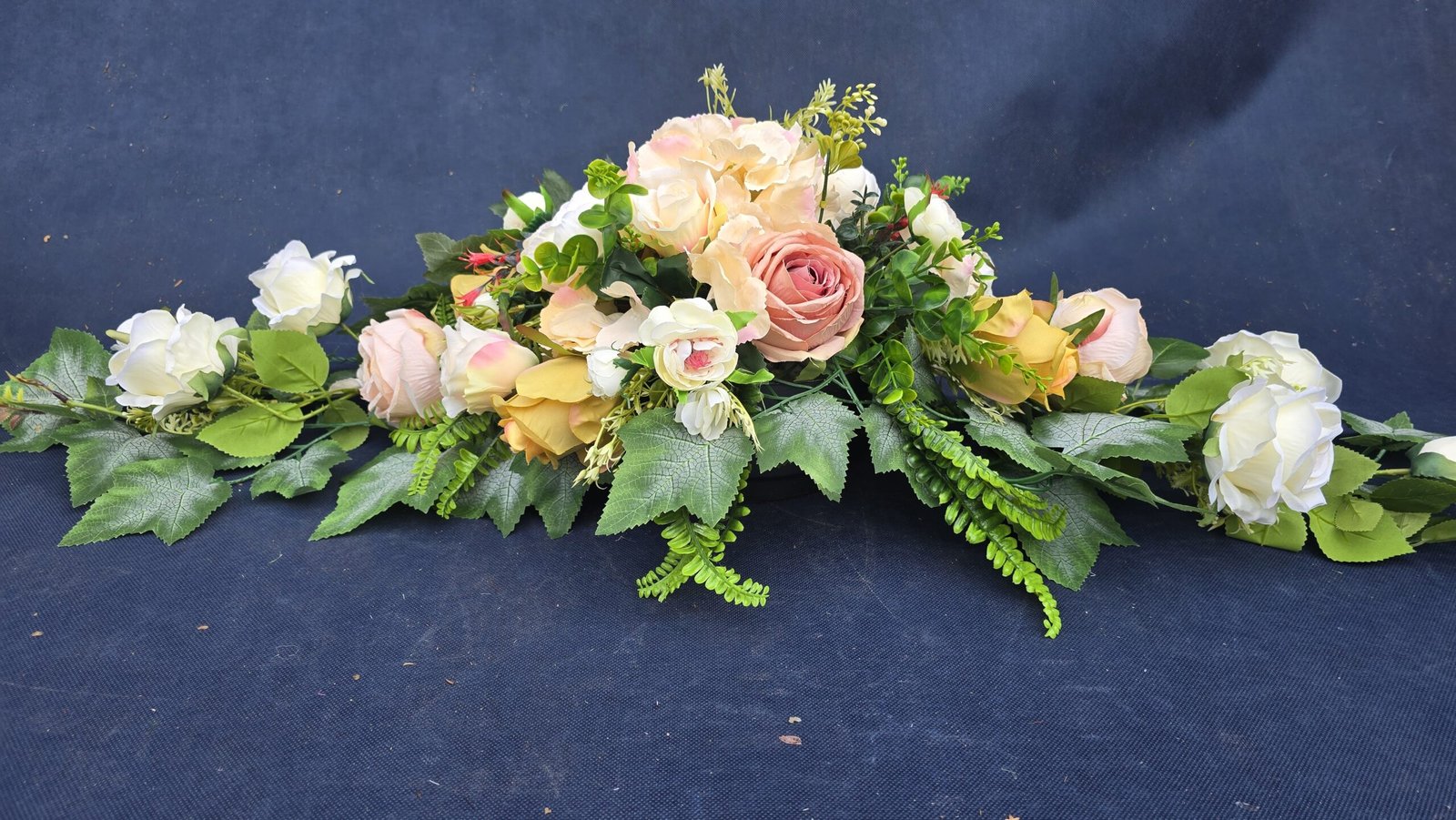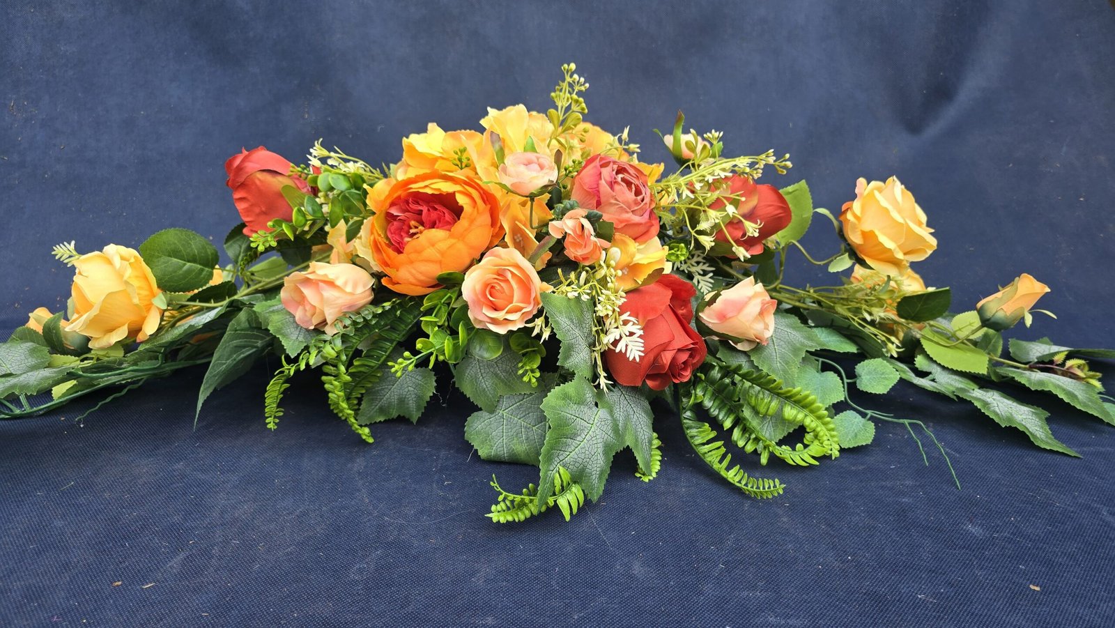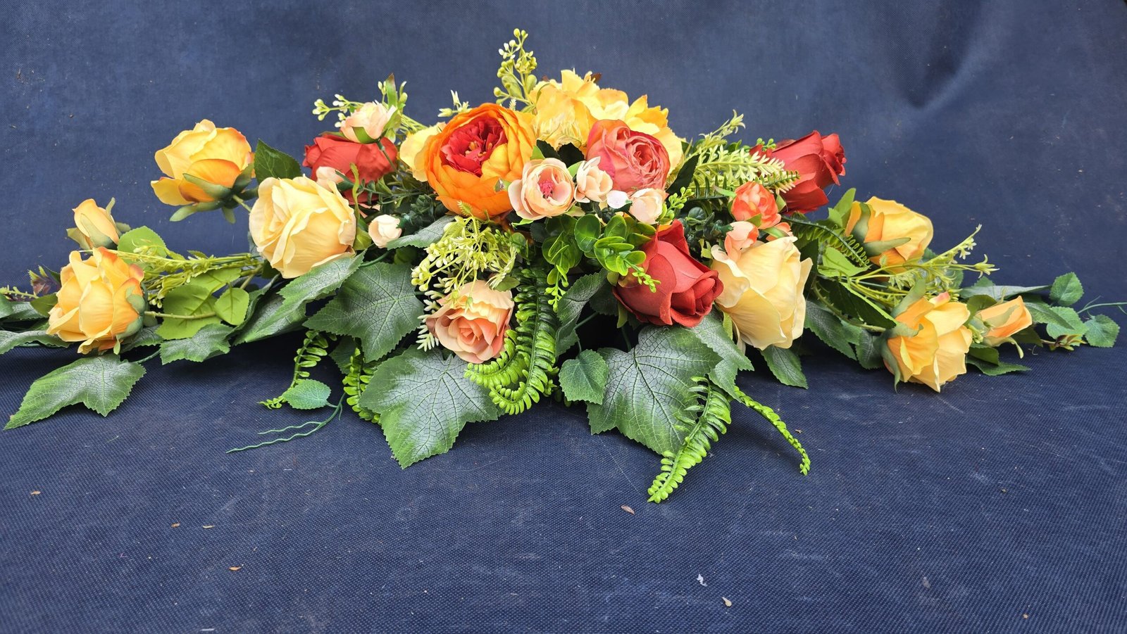 Łódka z centralnym bukietem róż, peonii i drobnych kwiatuszków, zwężająca się ku końcom. Spód wykończony liśćmi, trawkami i innymi dodatkami. Nieszablonowa kompozycja o wyraźnym, geometrycznym kształcie.