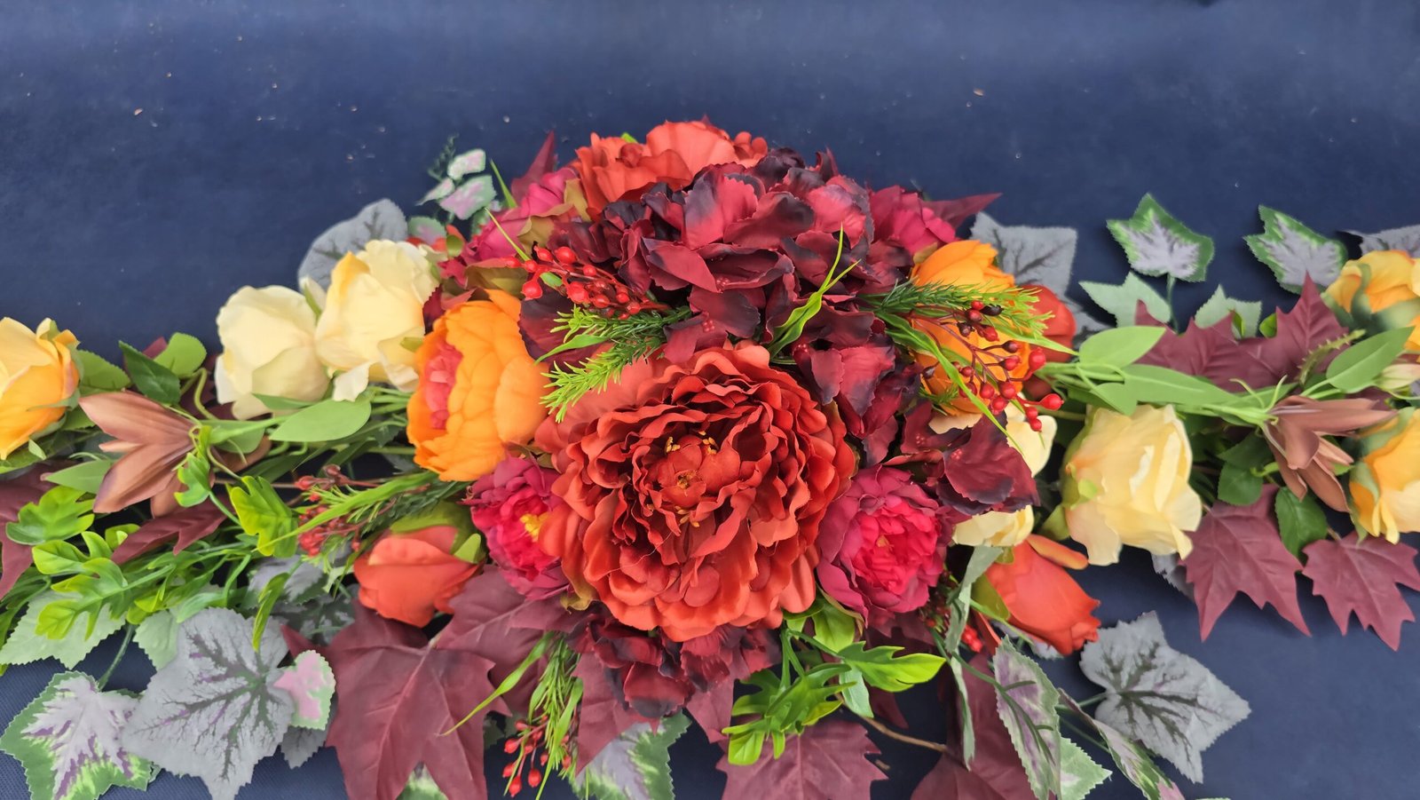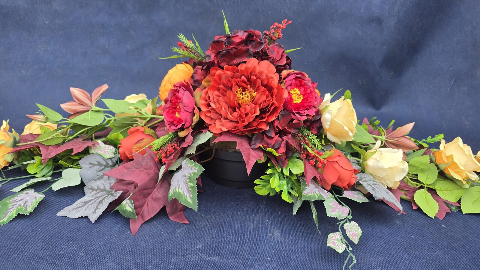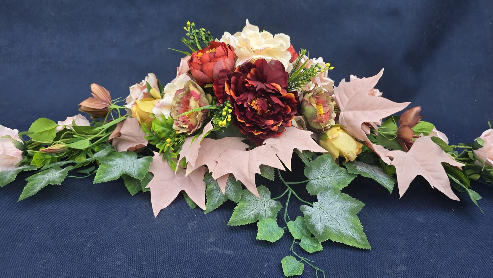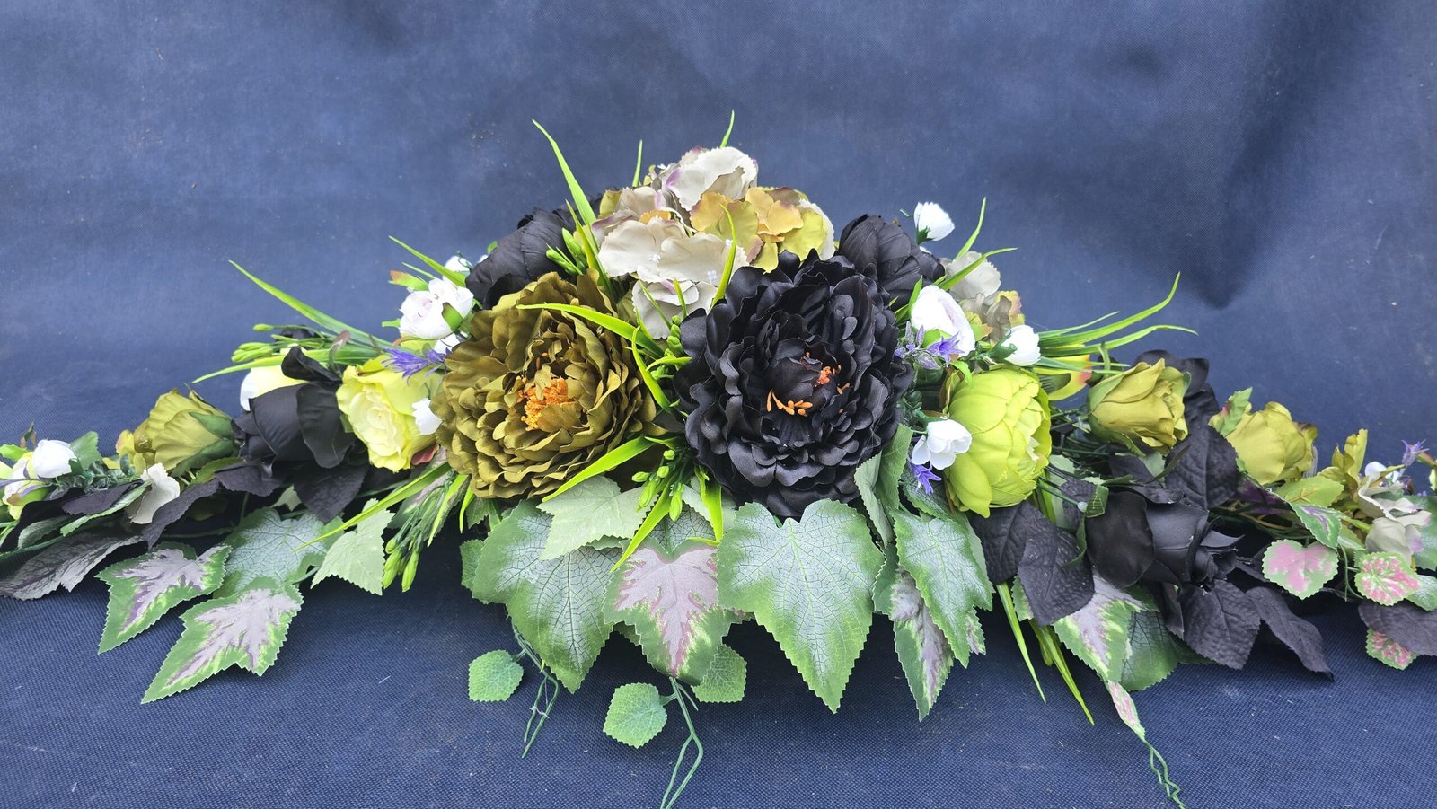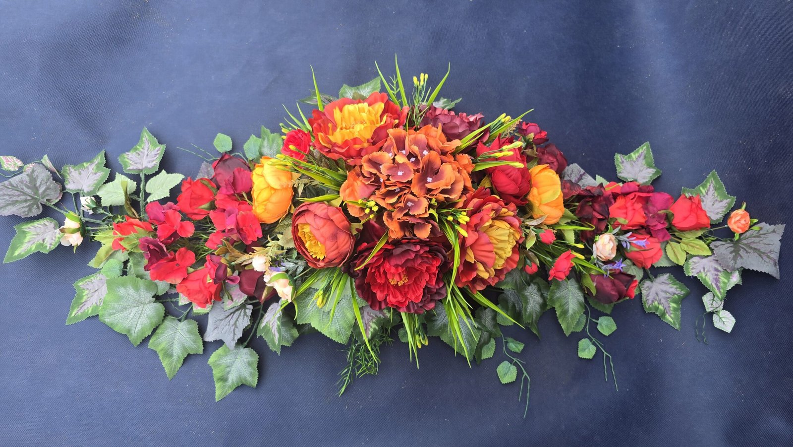Łódka z centralnym bukietem róż, peonii i drobnych kwiatuszków, zwężająca się ku końcom. Spód wykończony liśćmi, trawkami i innymi dodatkami. Nieszablonowa kompozycja o wyraźnym, geometrycznym kształcie.