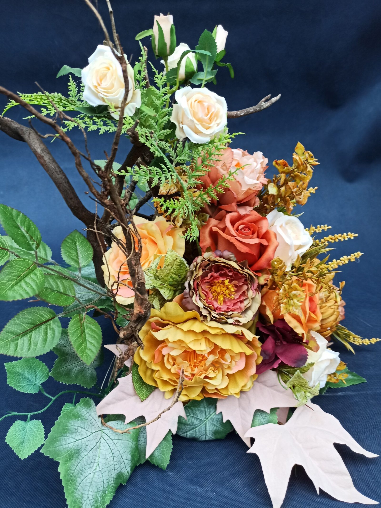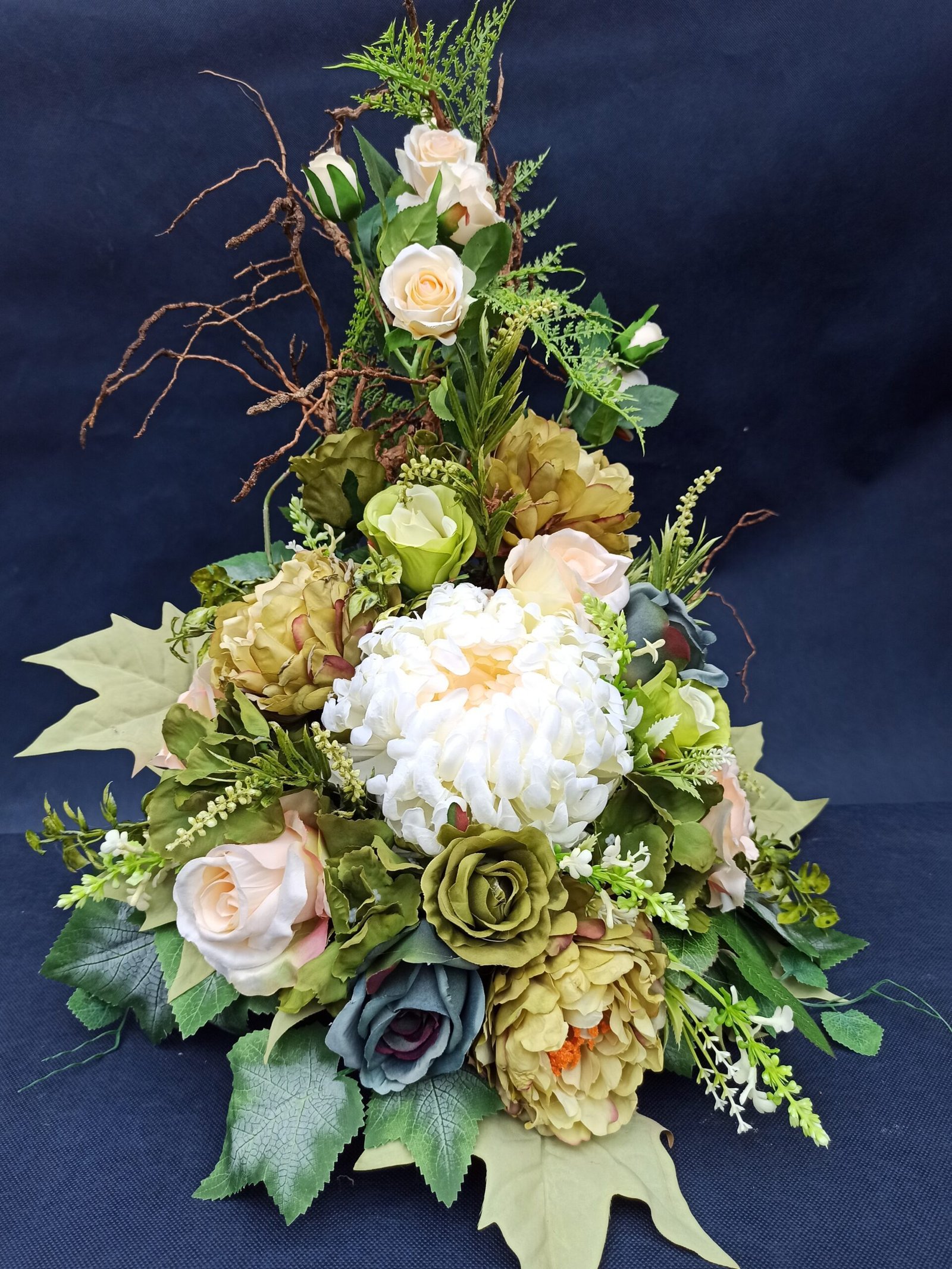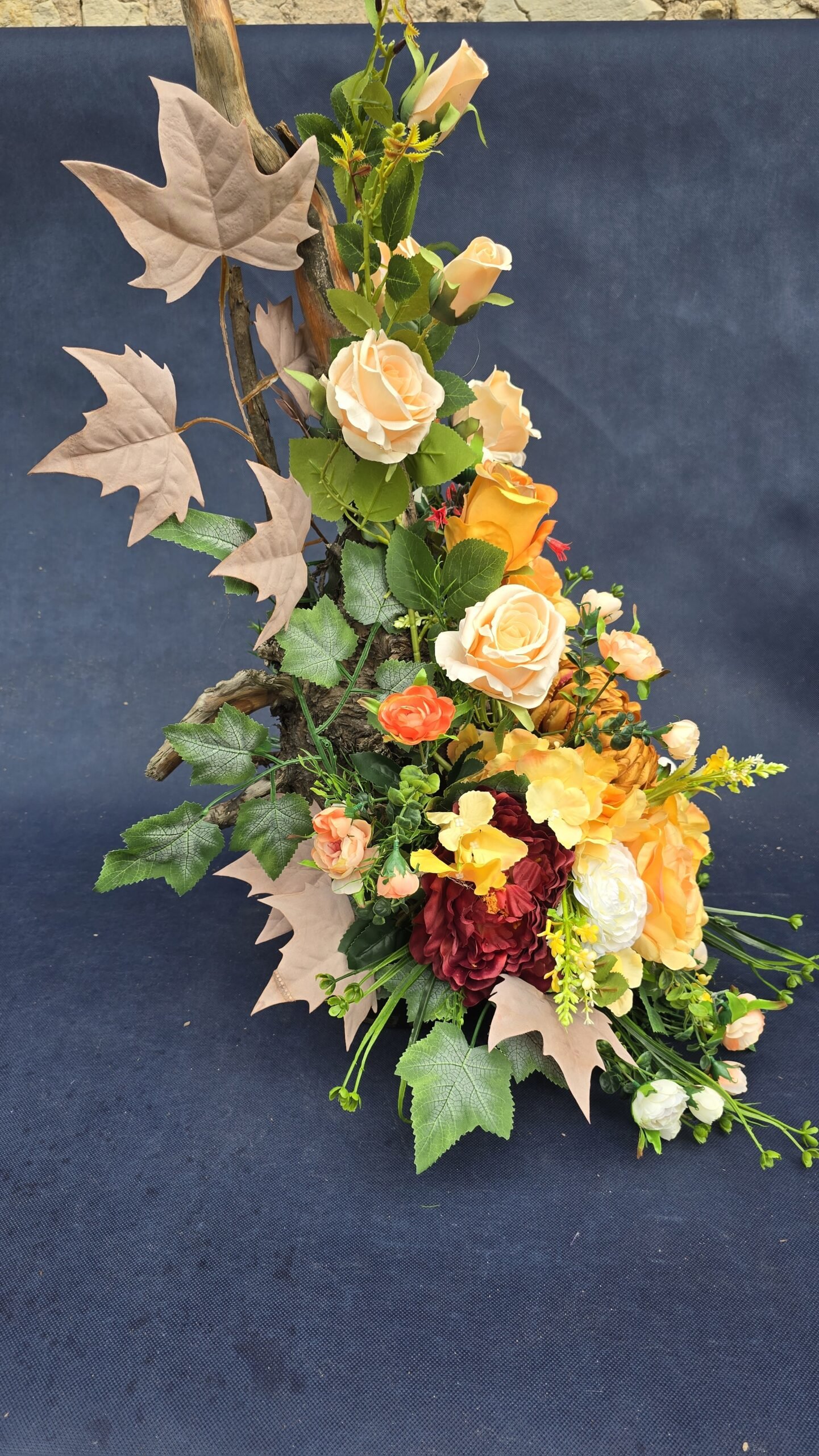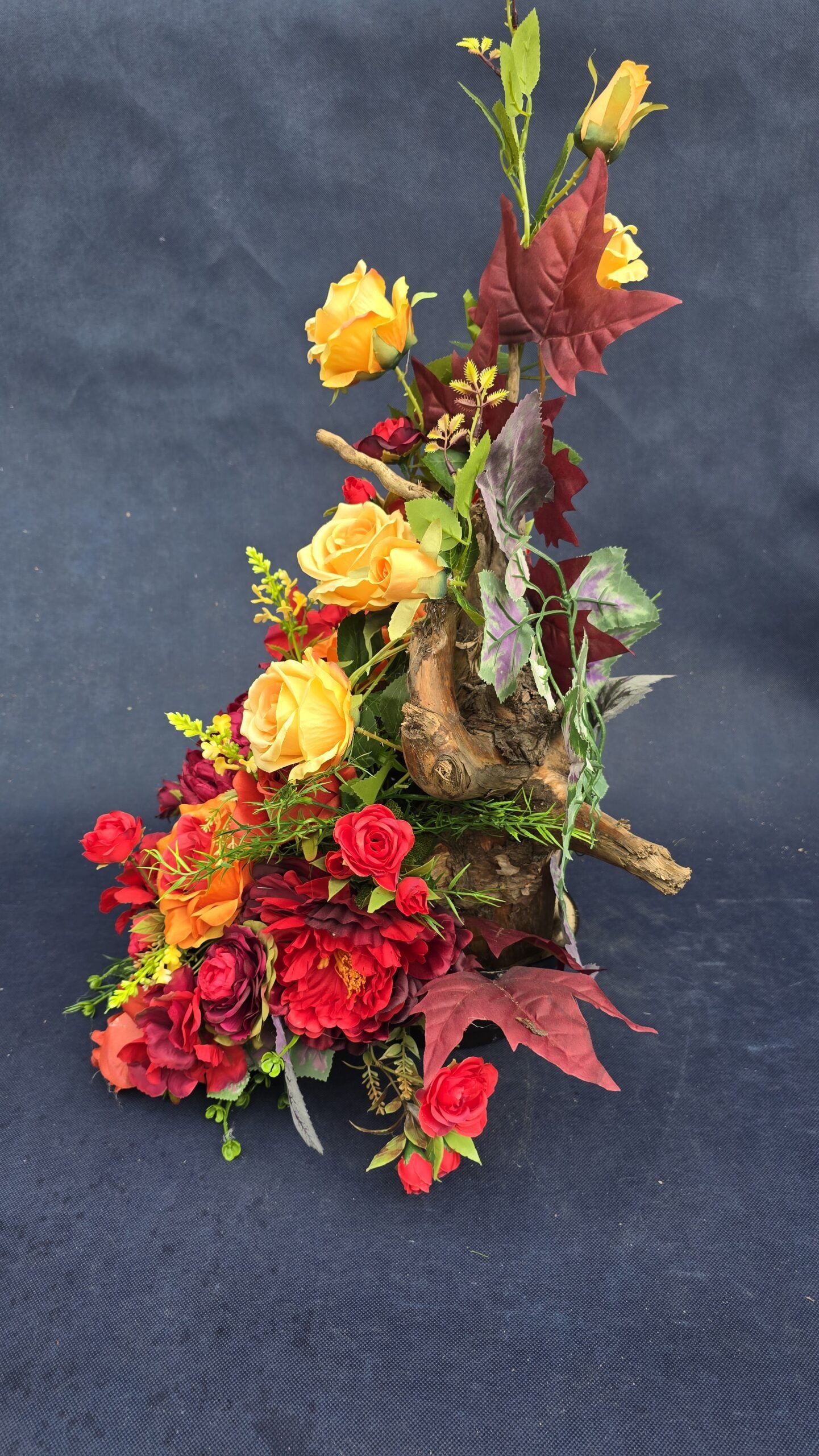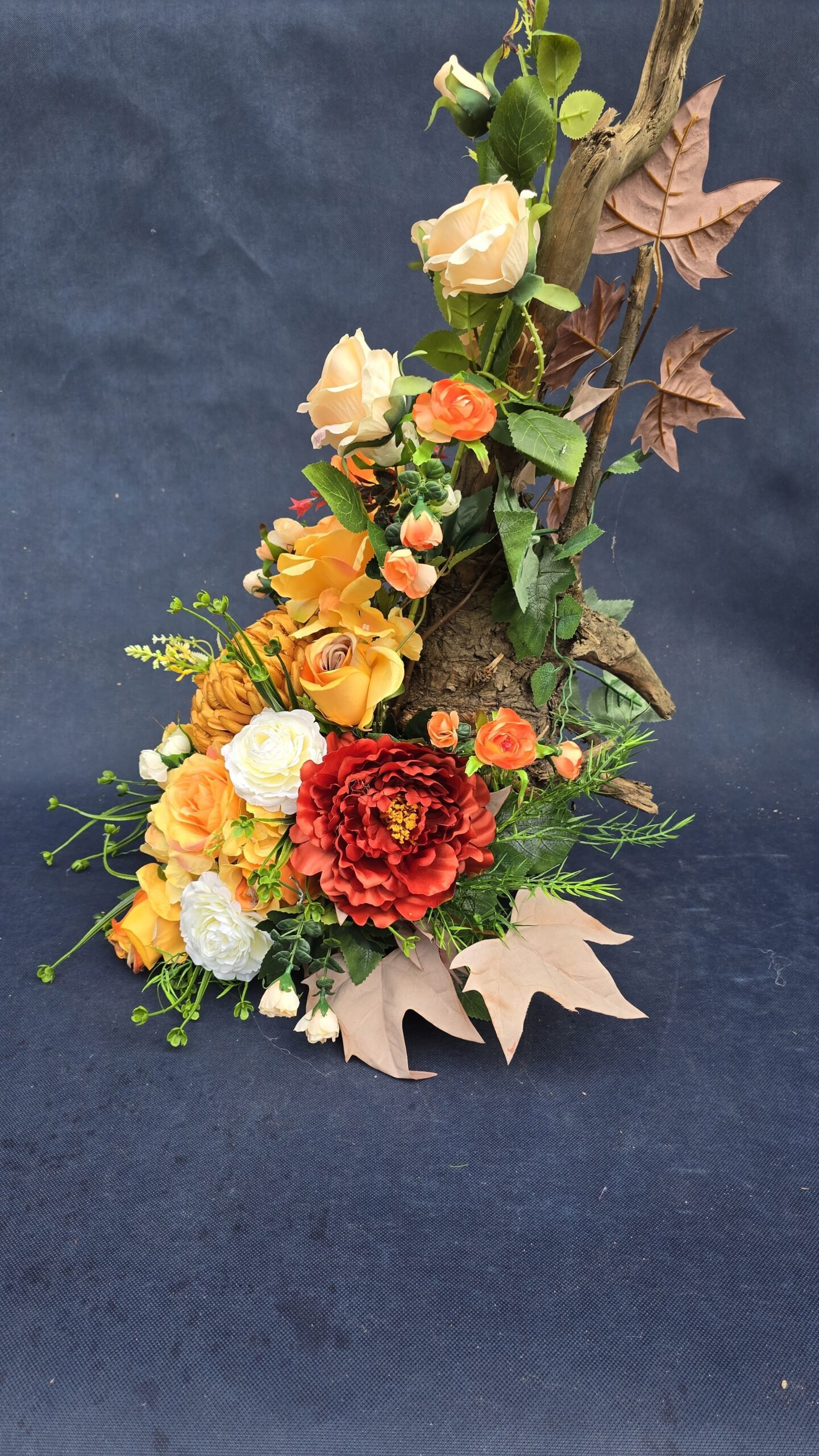 Stojąca kompozycja z korzeniem w ciężkiej misie z centralnym bukietem chryzantem, różyczek, pełników i drobnych kwiatków. Gałęzie róż i mniejsze kwiatki wiją się ku górze. Dekoracja harmonijna, elegancka i pełna detali.