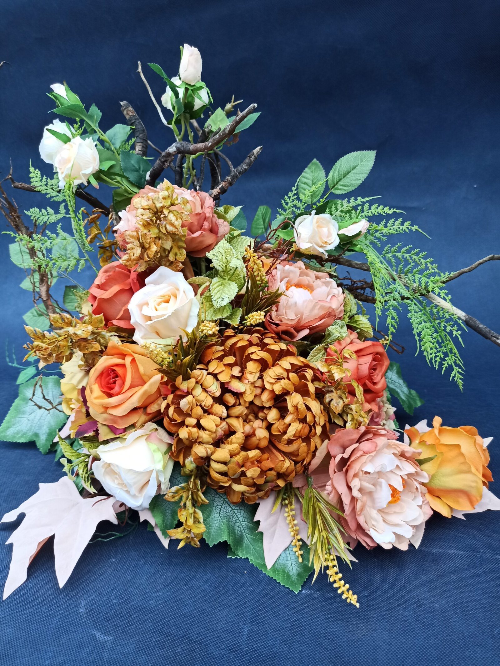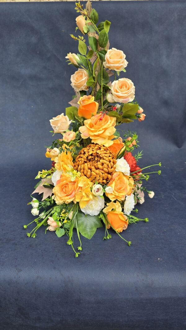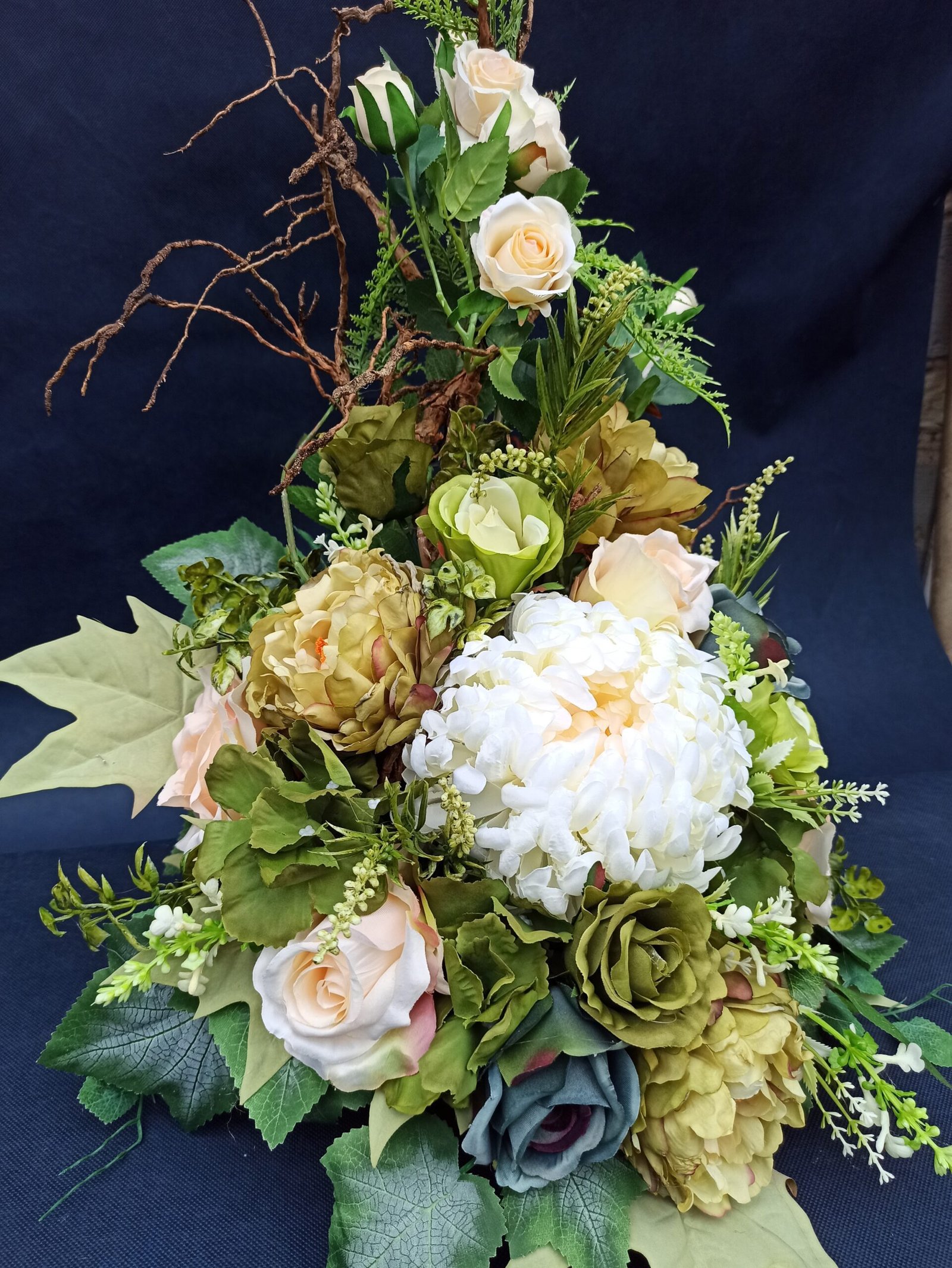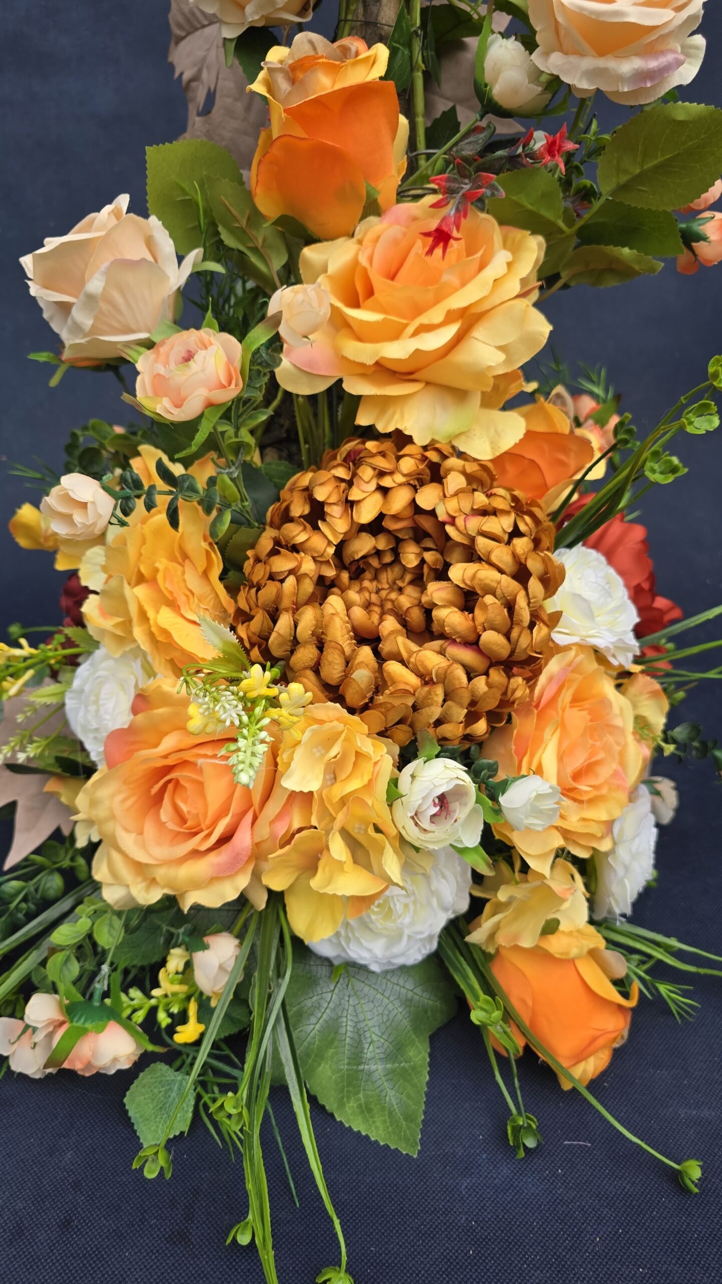 Stojąca kompozycja z korzeniem w ciężkiej misie z centralnym bukietem chryzantem, różyczek, pełników i drobnych kwiatków. Gałęzie róż i mniejsze kwiatki wiją się ku górze. Dekoracja harmonijna, elegancka i pełna detali.