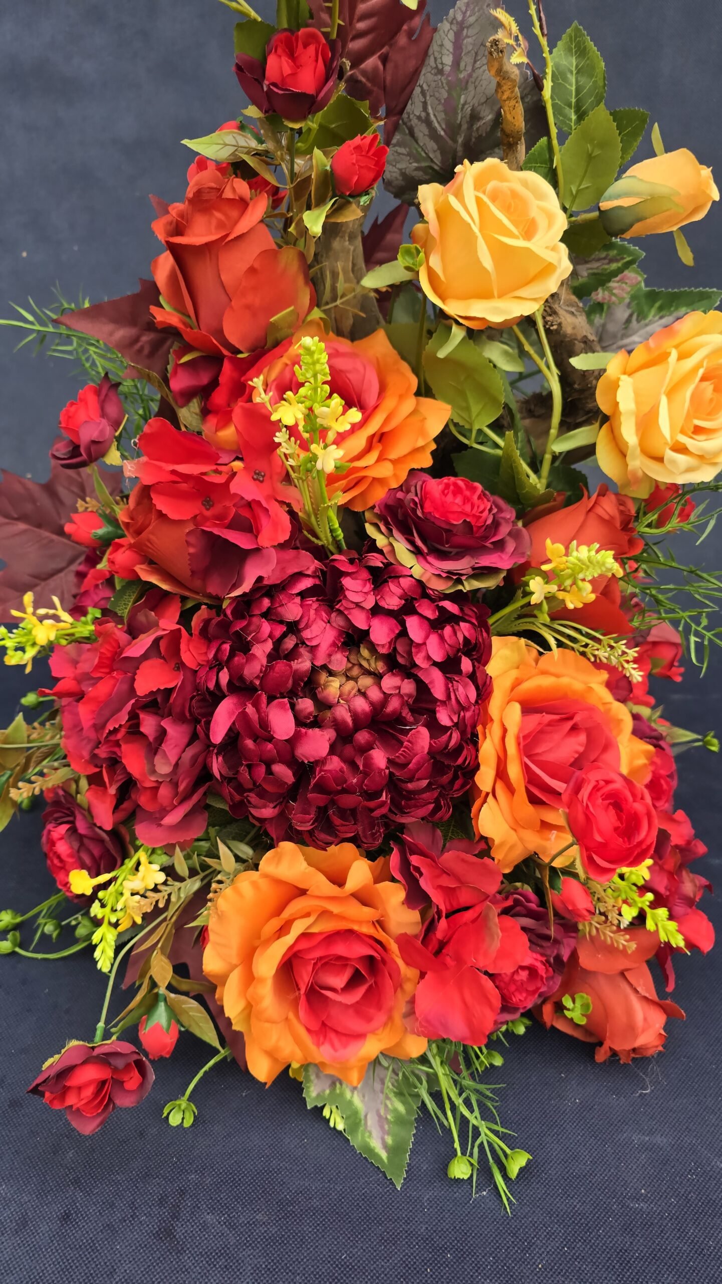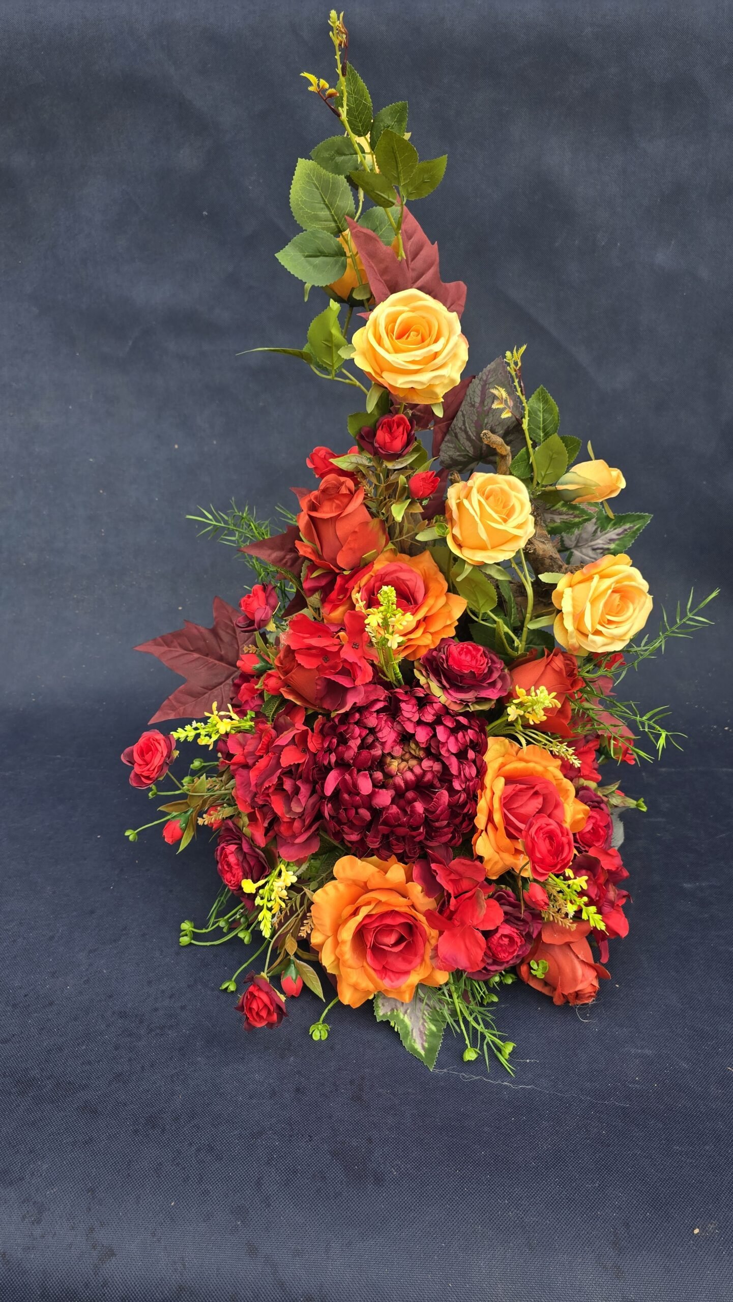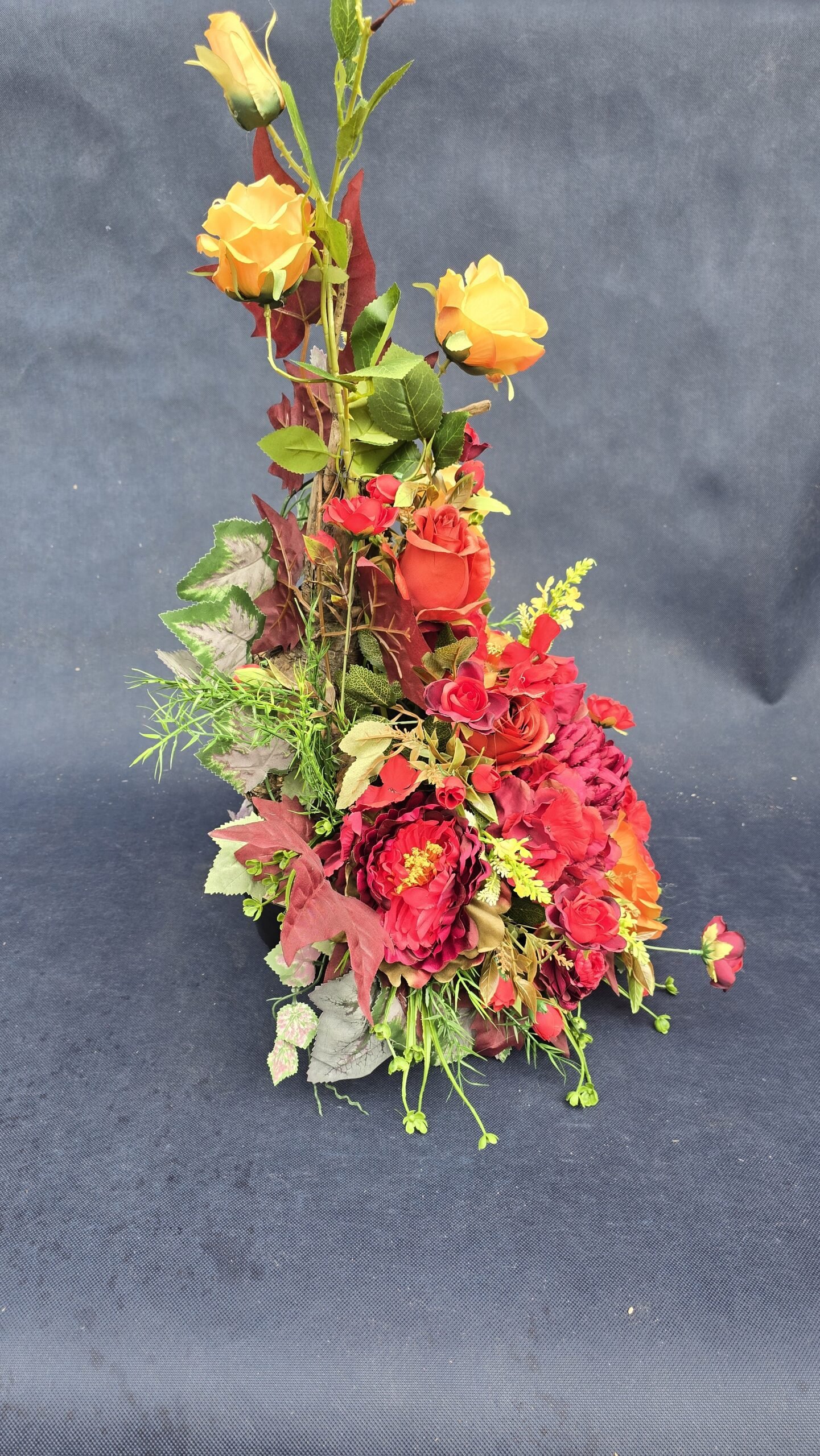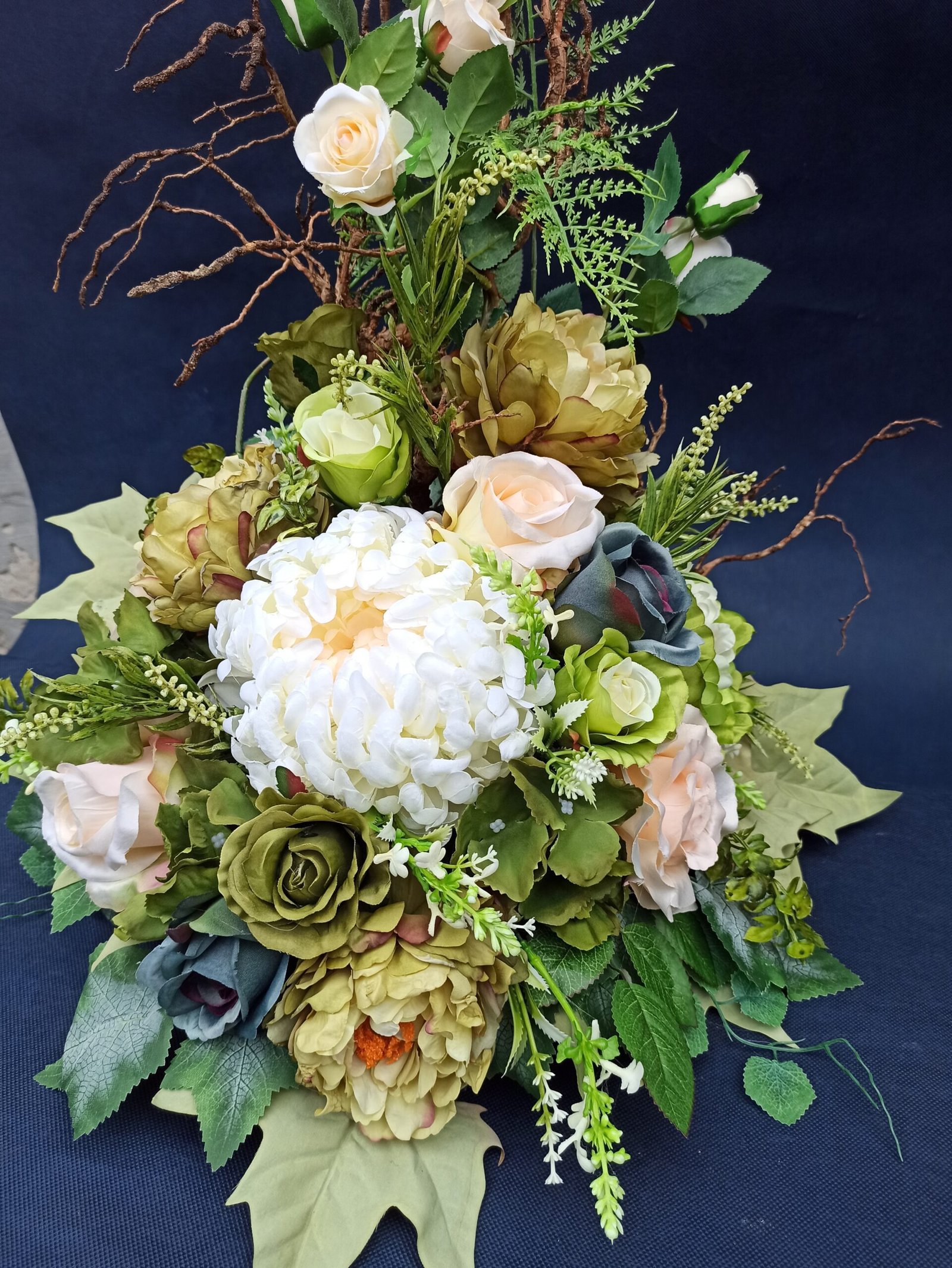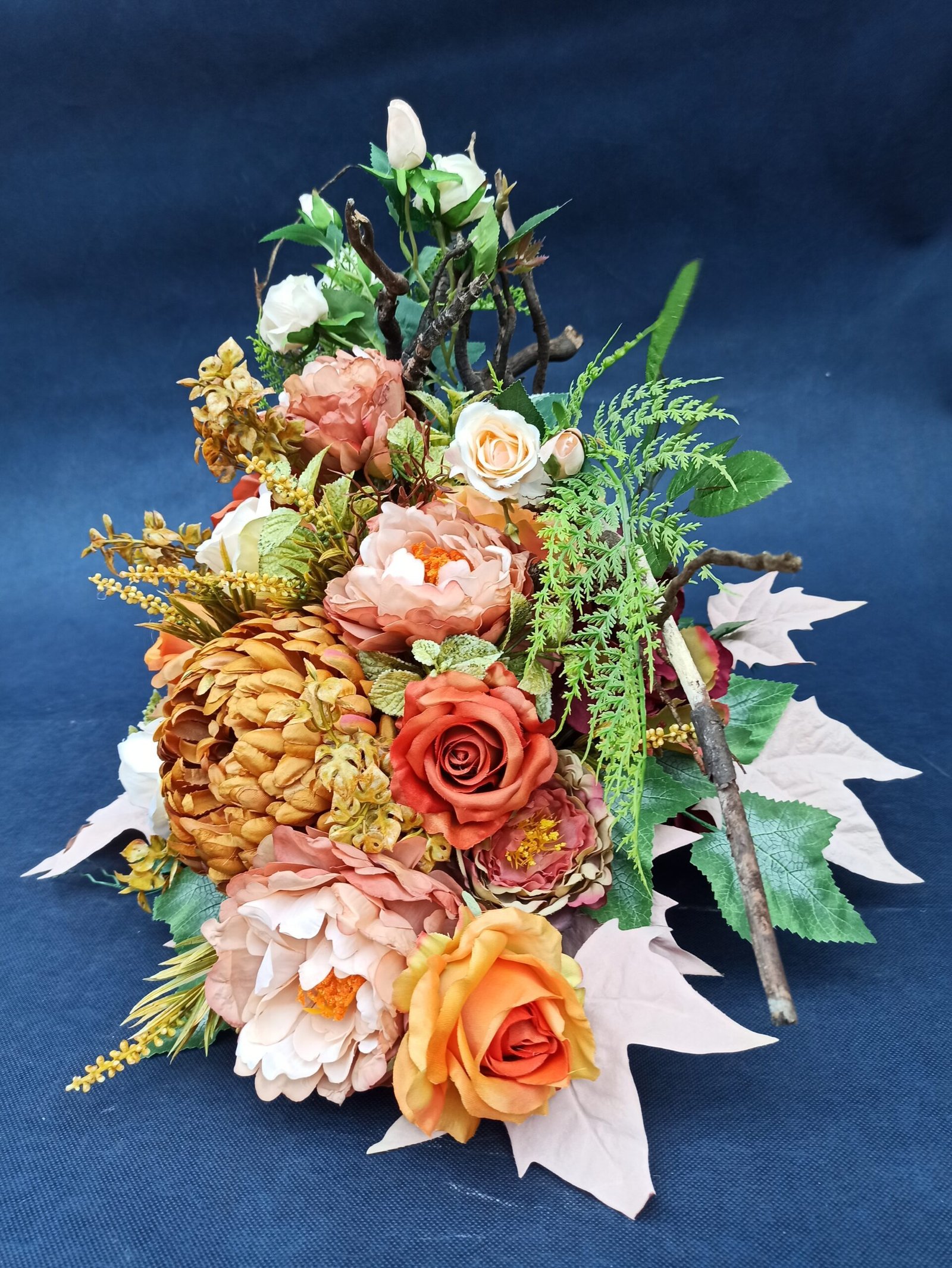 Stojąca kompozycja z korzeniem w ciężkiej misie z centralnym bukietem chryzantem, różyczek, pełników i drobnych kwiatków. Gałęzie róż i mniejsze kwiatki wiją się ku górze. Dekoracja harmonijna, elegancka i pełna detali.