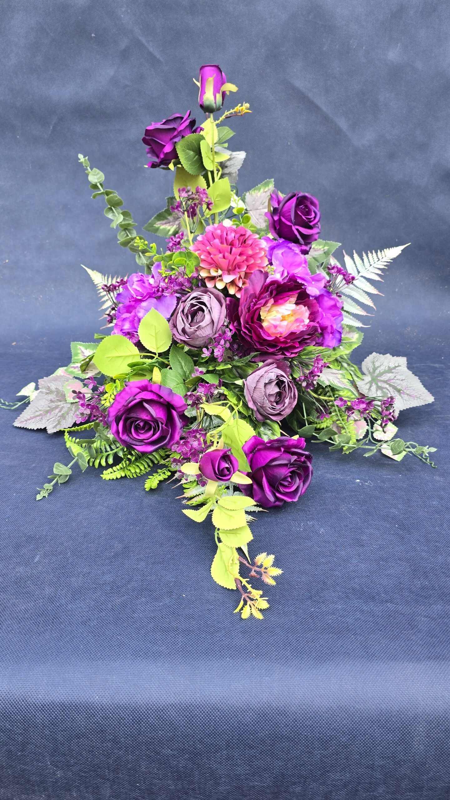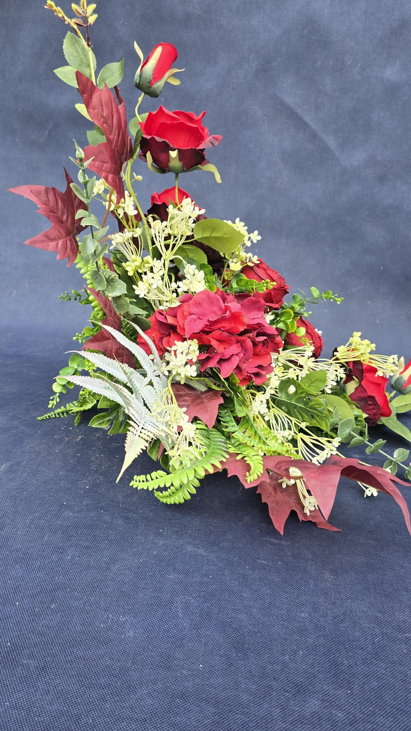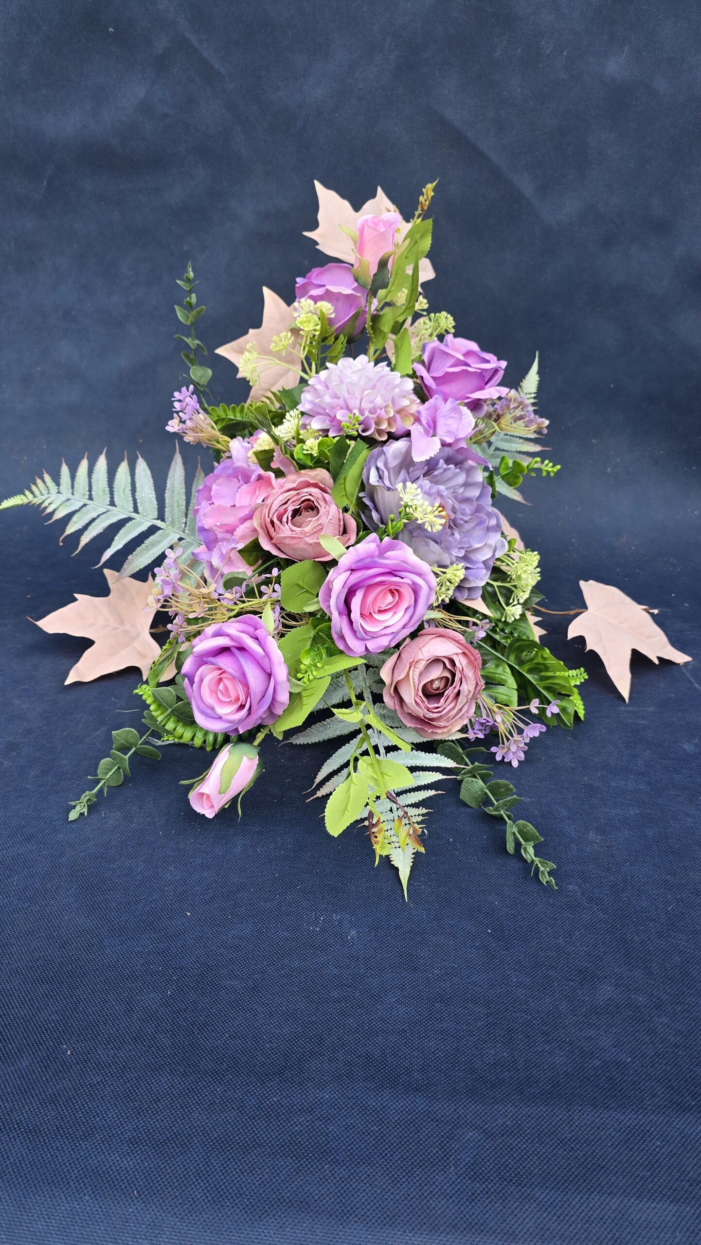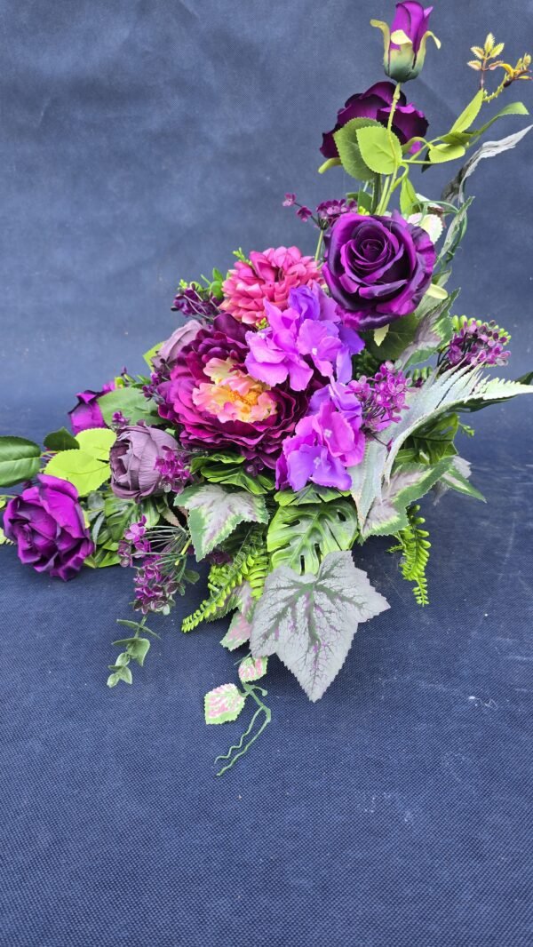 Stojąca dekoracja z liśćmi, paprociami i winogronem, skierowana ku przodowi. Hortensje, peonie i dalie tworzą centralną część, a gałązki róż dodają pionowego akcentu. Całość jest harmonijnie ułożona i efektowna na pomniku.