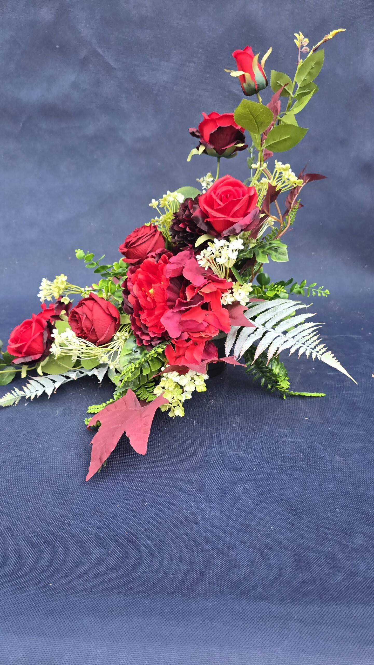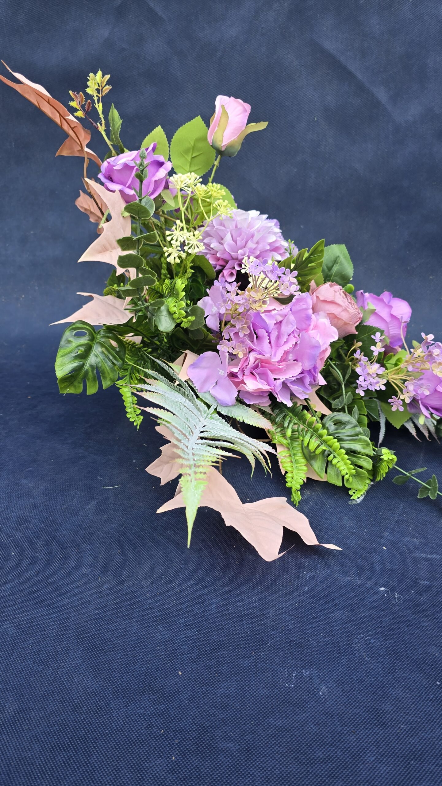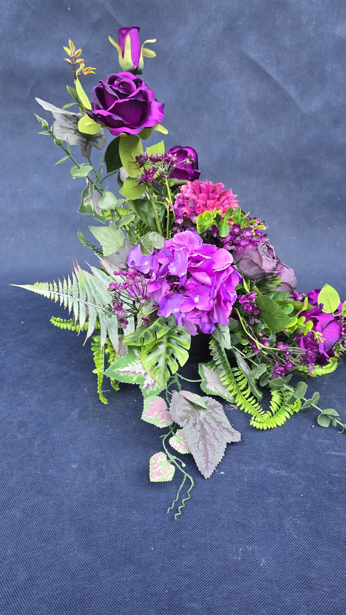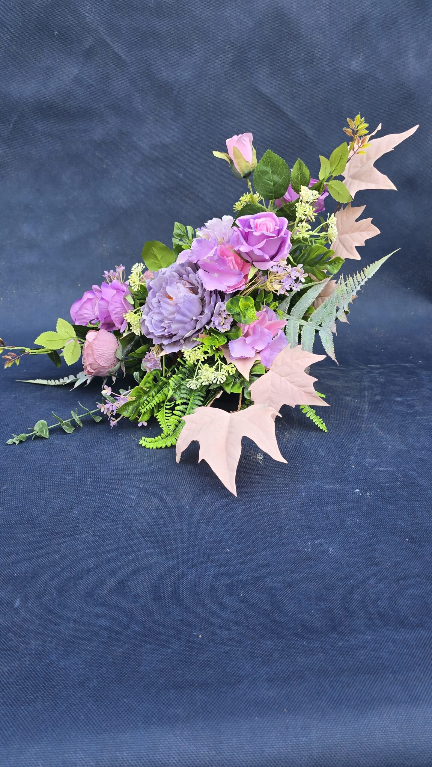 Stojąca dekoracja z liśćmi, paprociami i winogronem, skierowana ku przodowi. Hortensje, peonie i dalie tworzą centralną część, a gałązki róż dodają pionowego akcentu. Całość jest harmonijnie ułożona i efektowna na pomniku.