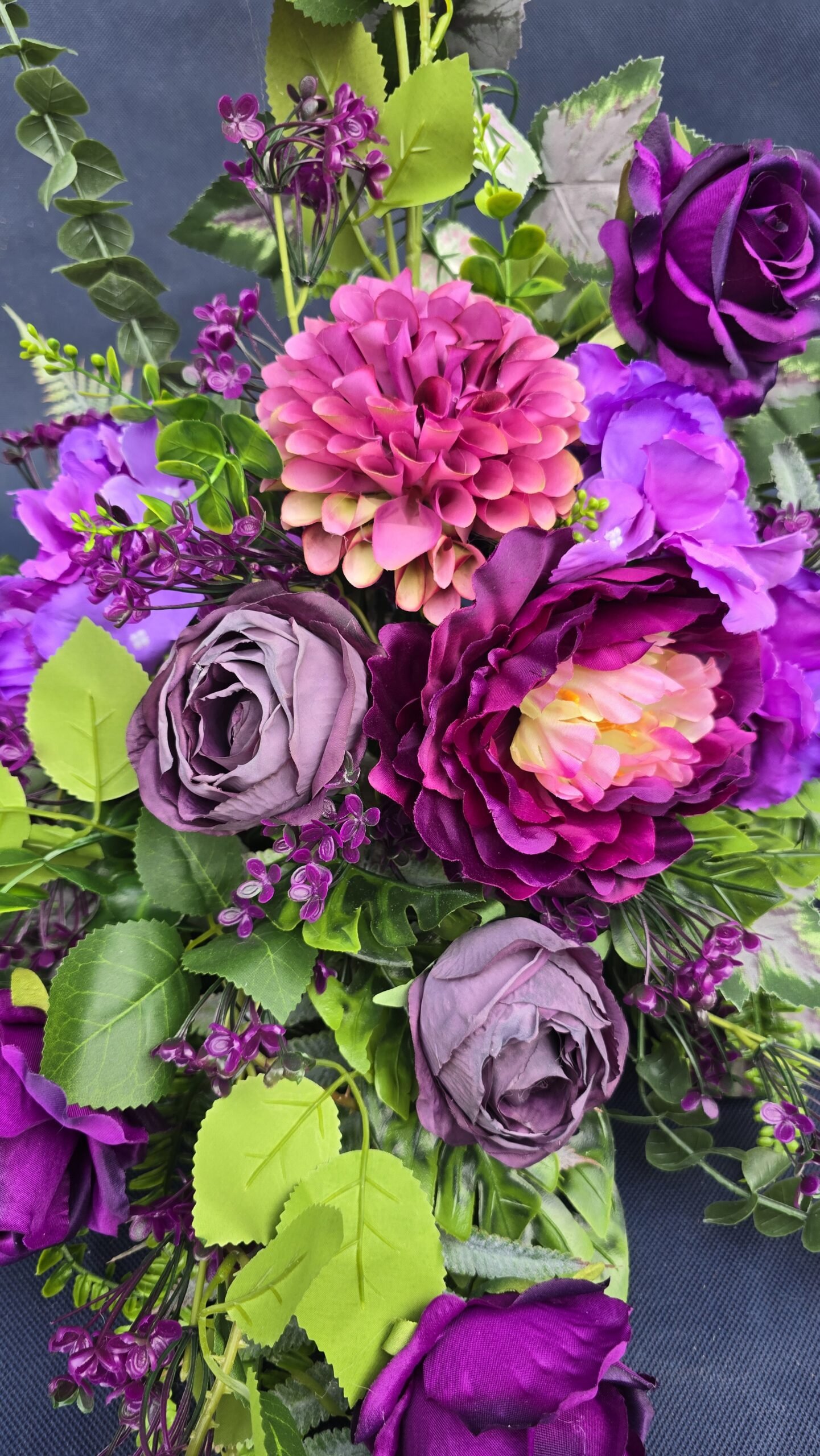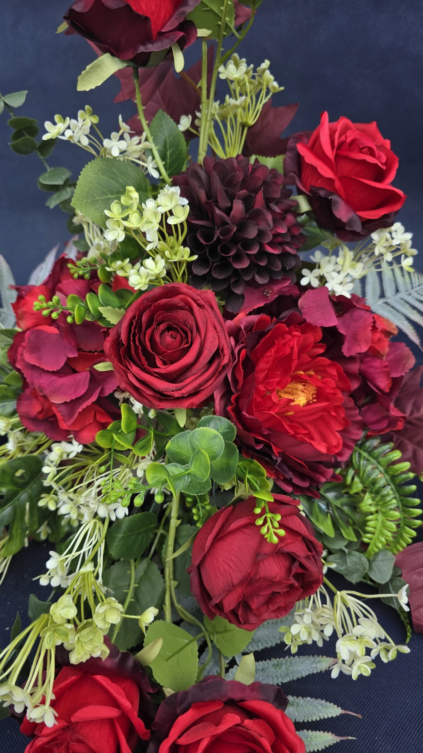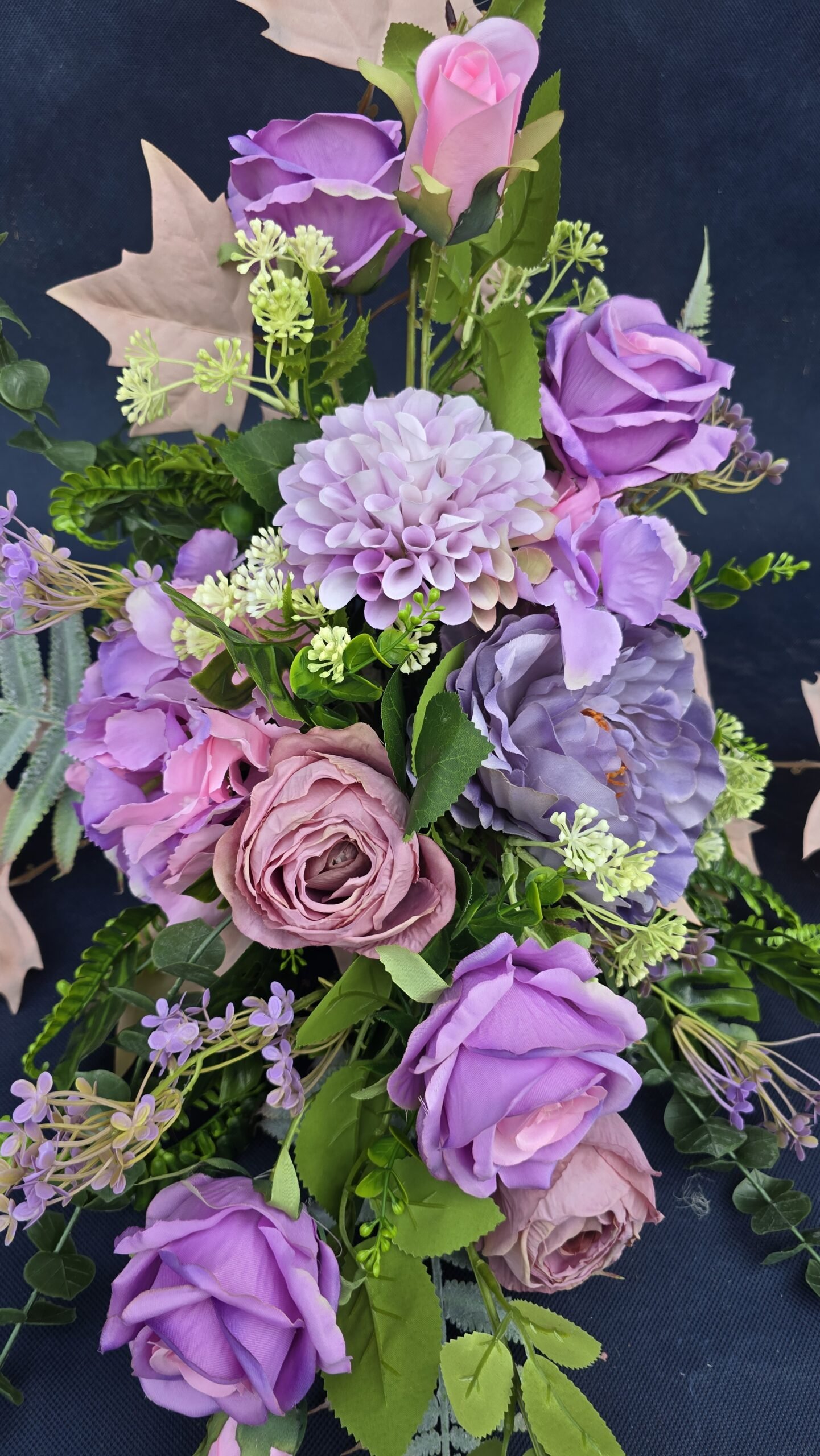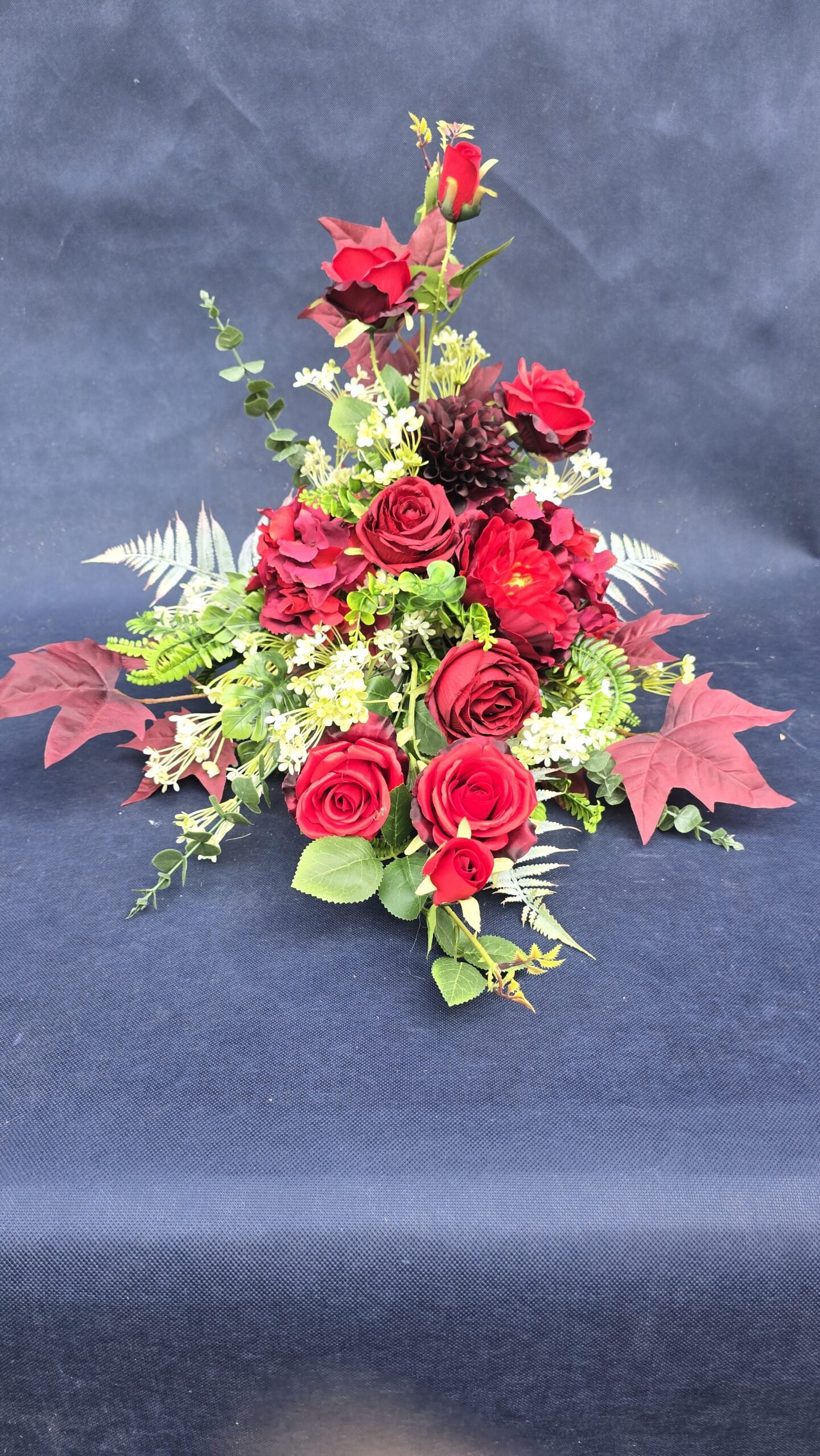 Stojąca dekoracja z liśćmi, paprociami i winogronem, skierowana ku przodowi. Hortensje, peonie i dalie tworzą centralną część, a gałązki róż dodają pionowego akcentu. Całość jest harmonijnie ułożona i efektowna na pomniku.