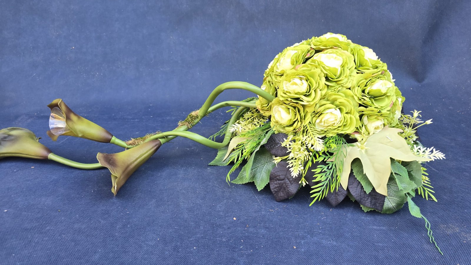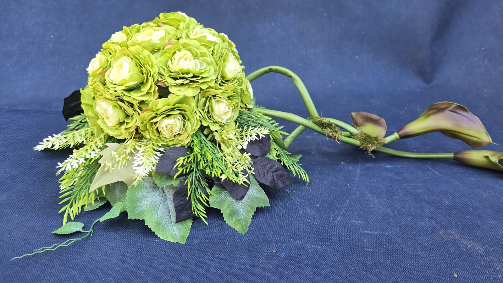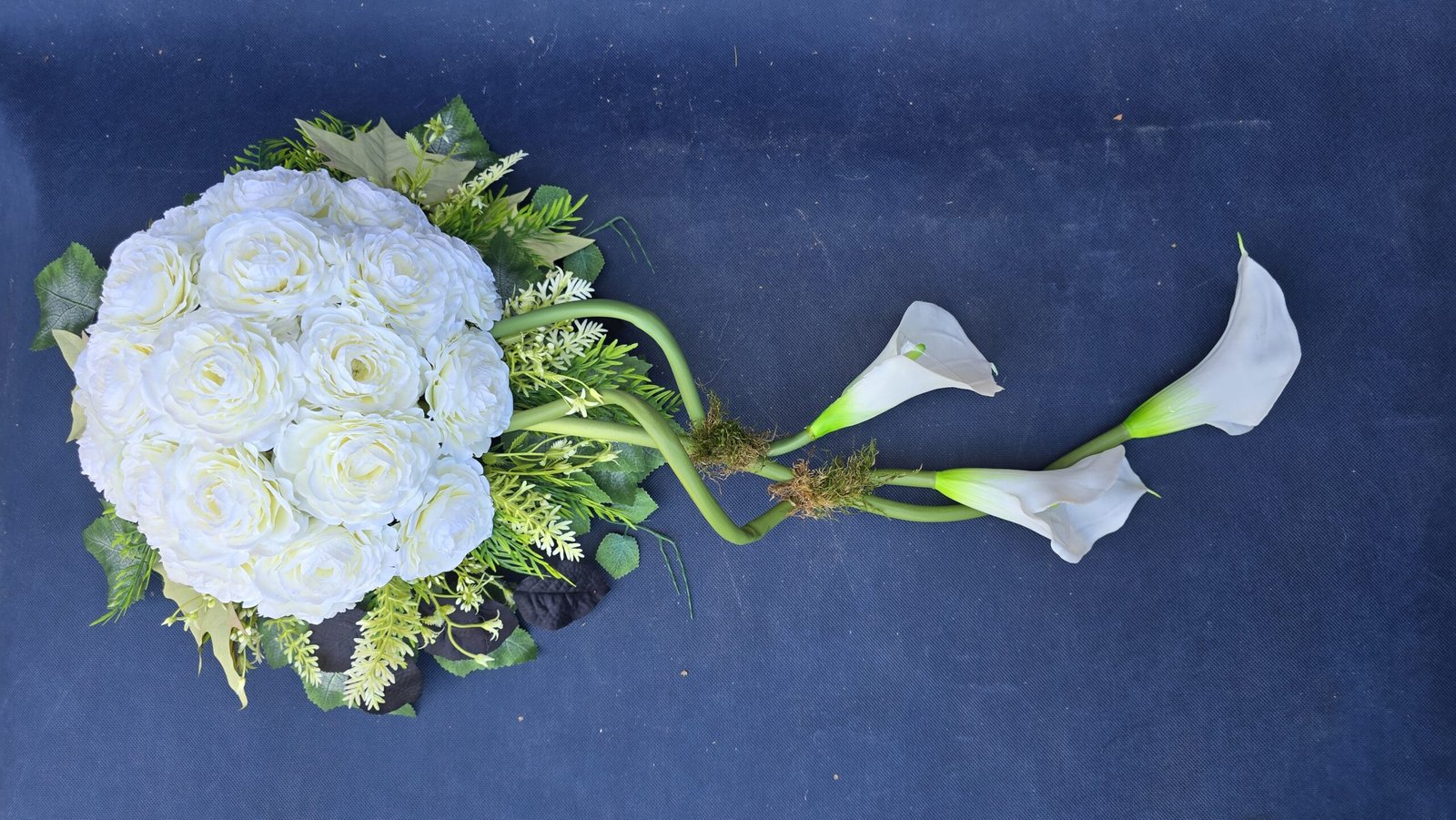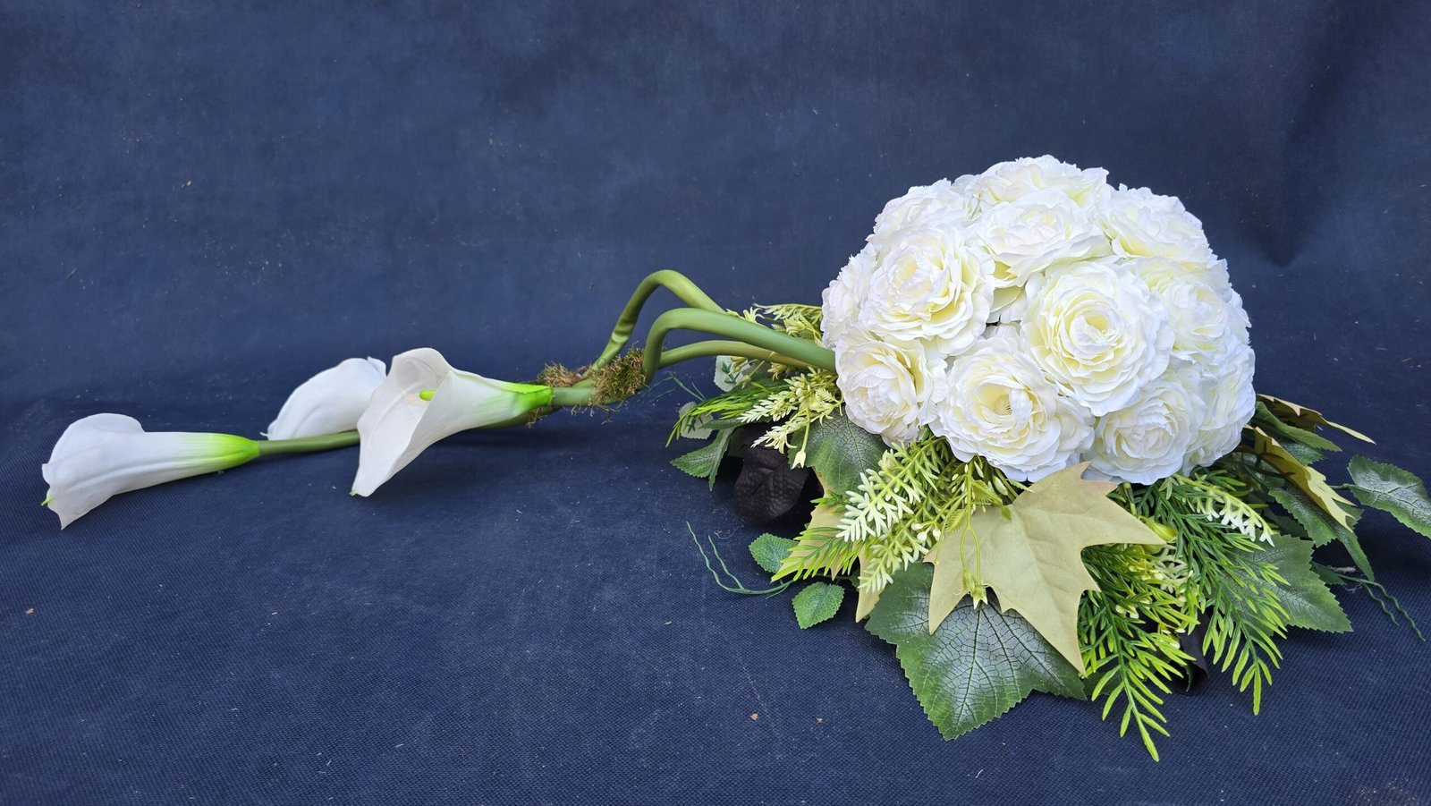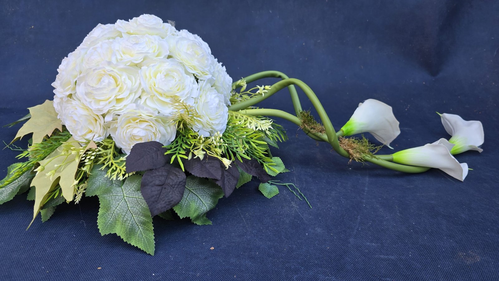 Kula z pełników tego samego gatunku tworzy jednolity, regularny bukiet. Otoczona liśćmi, od drobnych po większe winogronowe. Z centralnej części wychodzą wijące się kalle, nadając dekoracji lekki ruch.