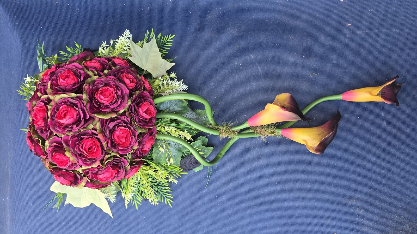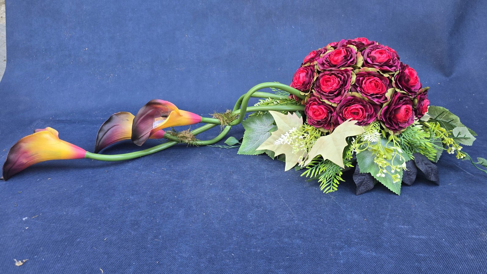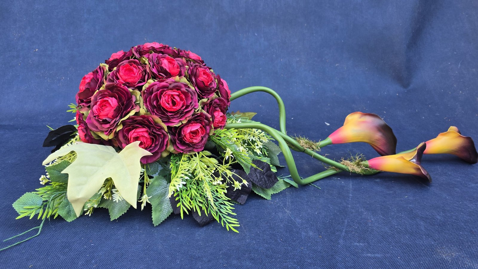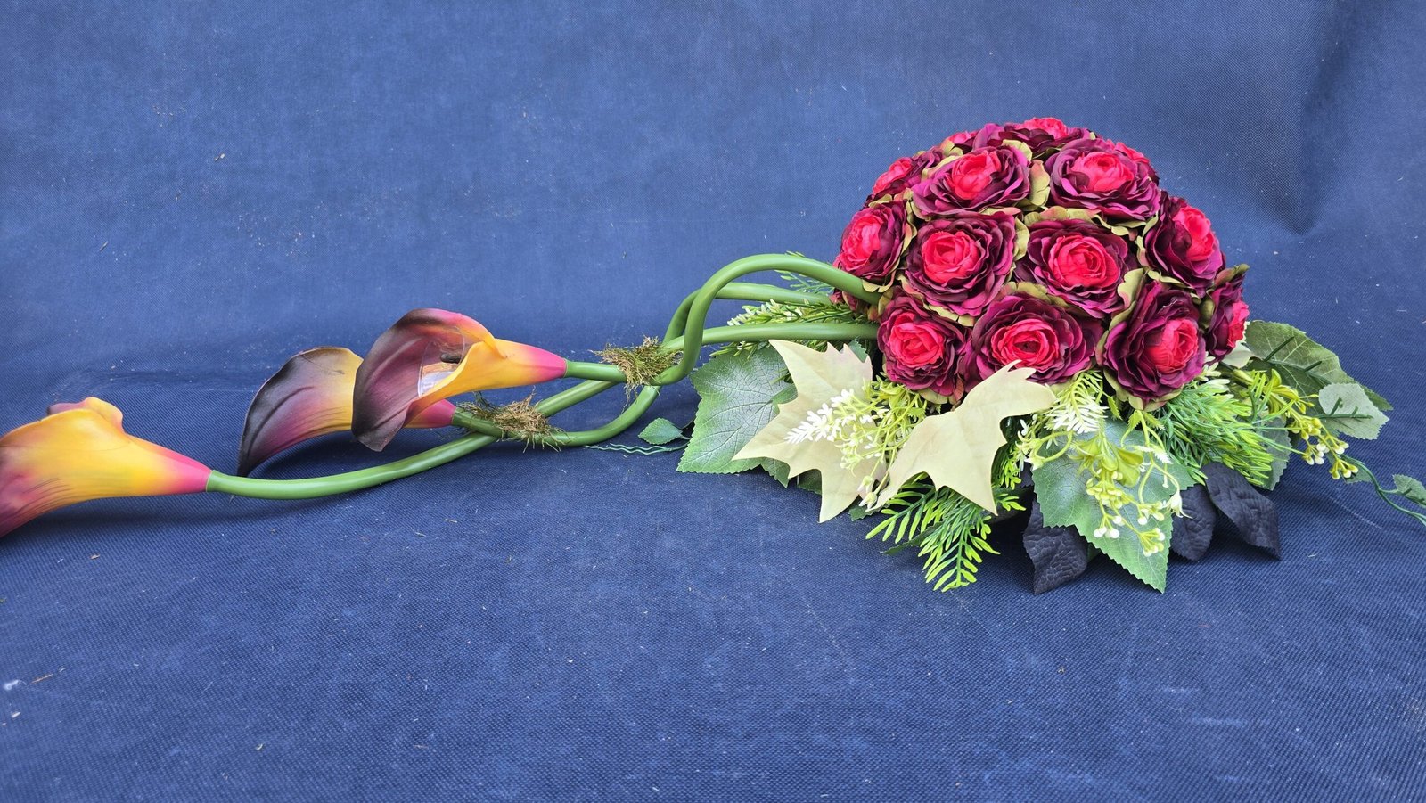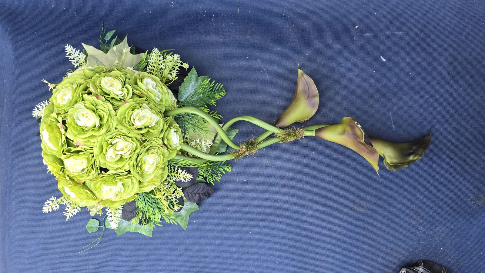 Kula z pełników tego samego gatunku tworzy jednolity, regularny bukiet. Otoczona liśćmi, od drobnych po większe winogronowe. Z centralnej części wychodzą wijące się kalle, nadając dekoracji lekki ruch.