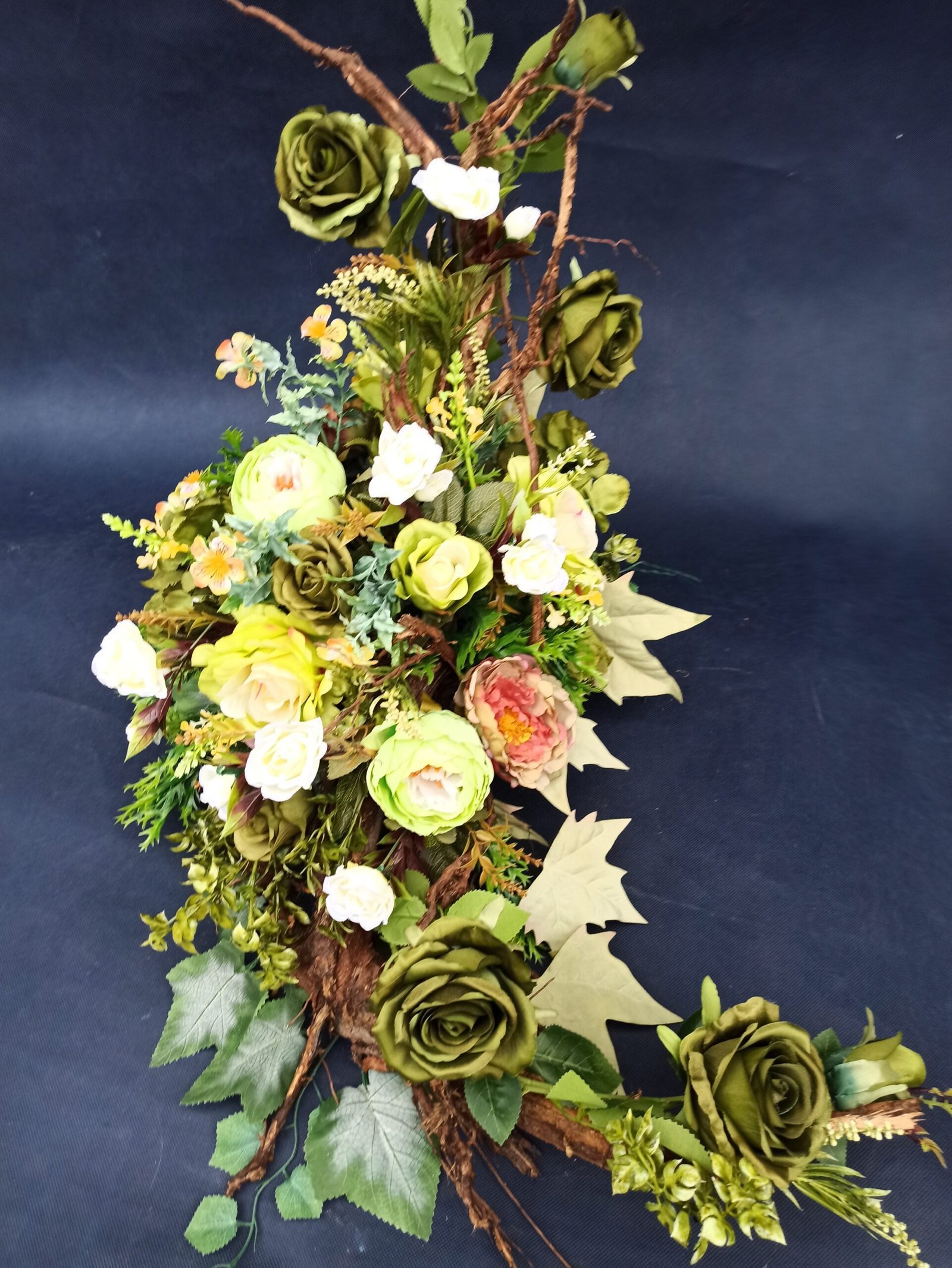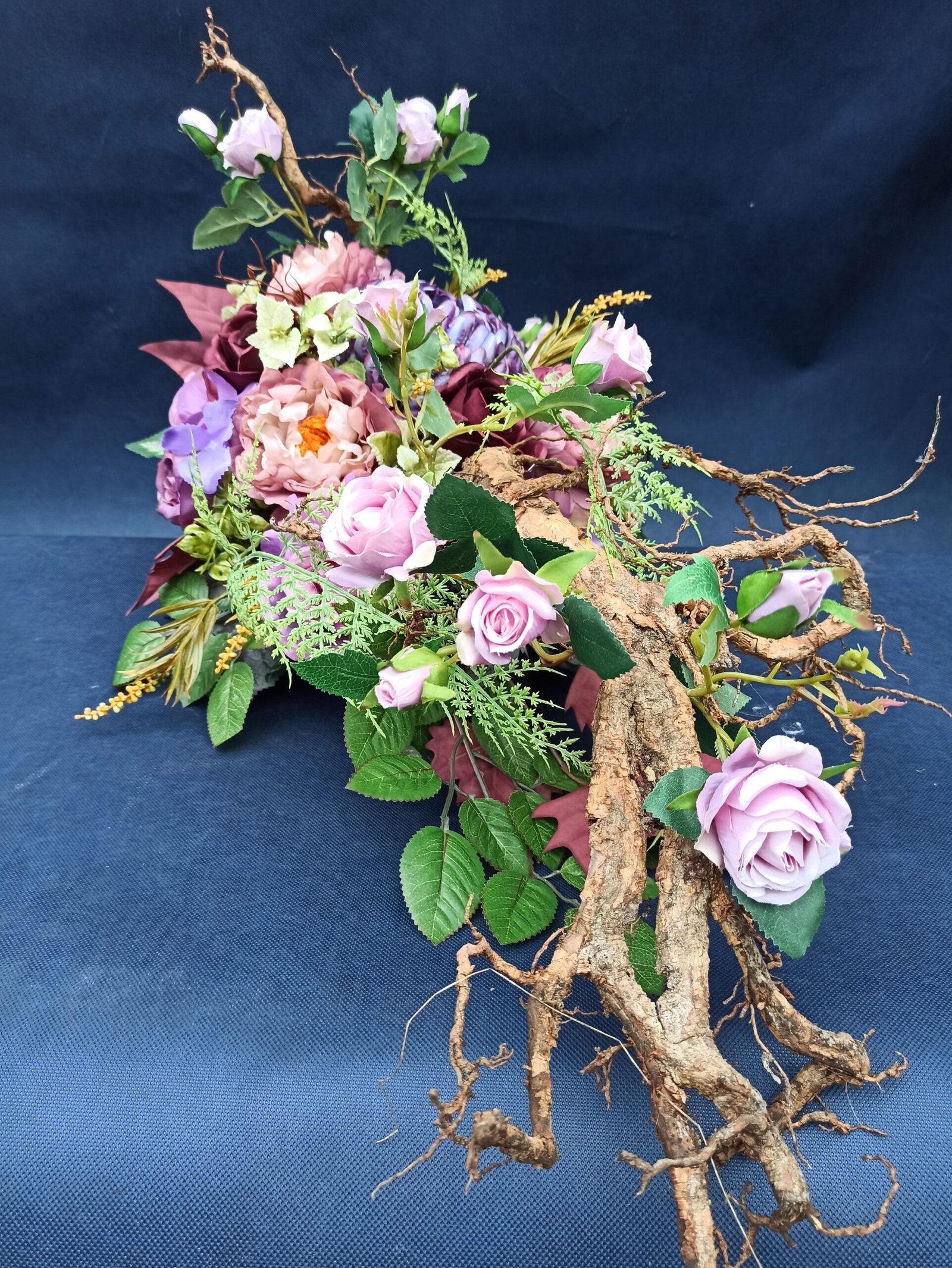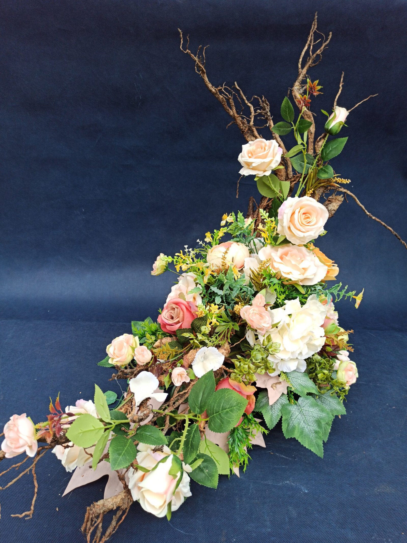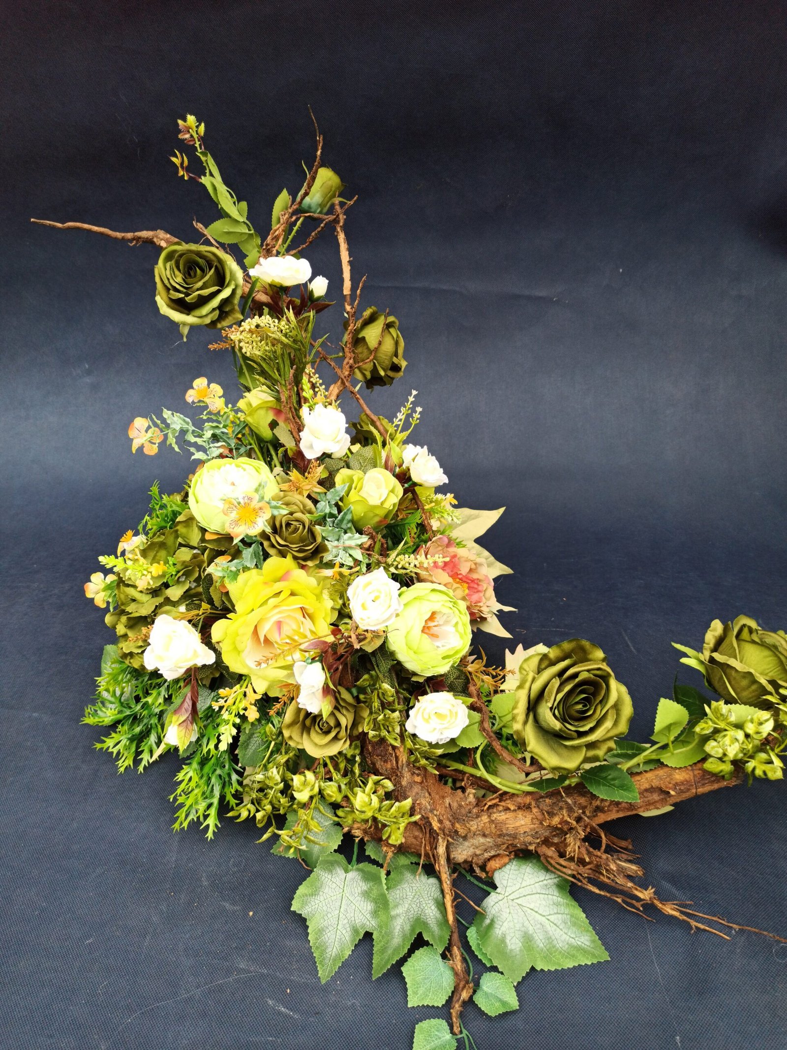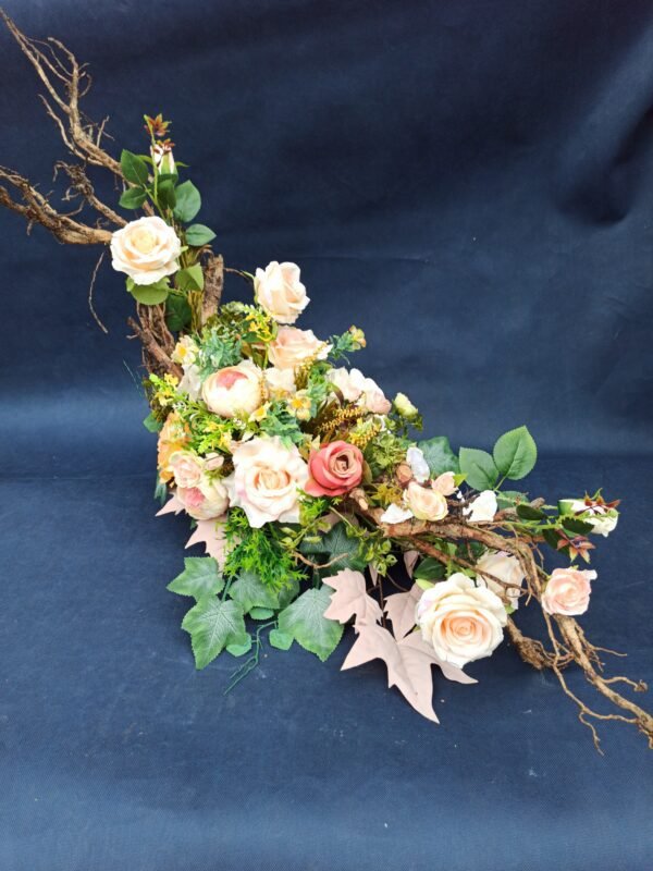 Kompozycja stojąco-leżąca z głównym elementem korzenia, na którym do góry wspinają się piękne kwiaty, róże, dalie, peonie, jak i chryzantemy. Również ku dołowi spływają po korzeniu te kwiaty. Ładne otoczenie zielonych dodatków, liści, paproci i pięknych gałązek, drobnych kwiatków, tworzy piękną kompozycję na wszystkich świętych.