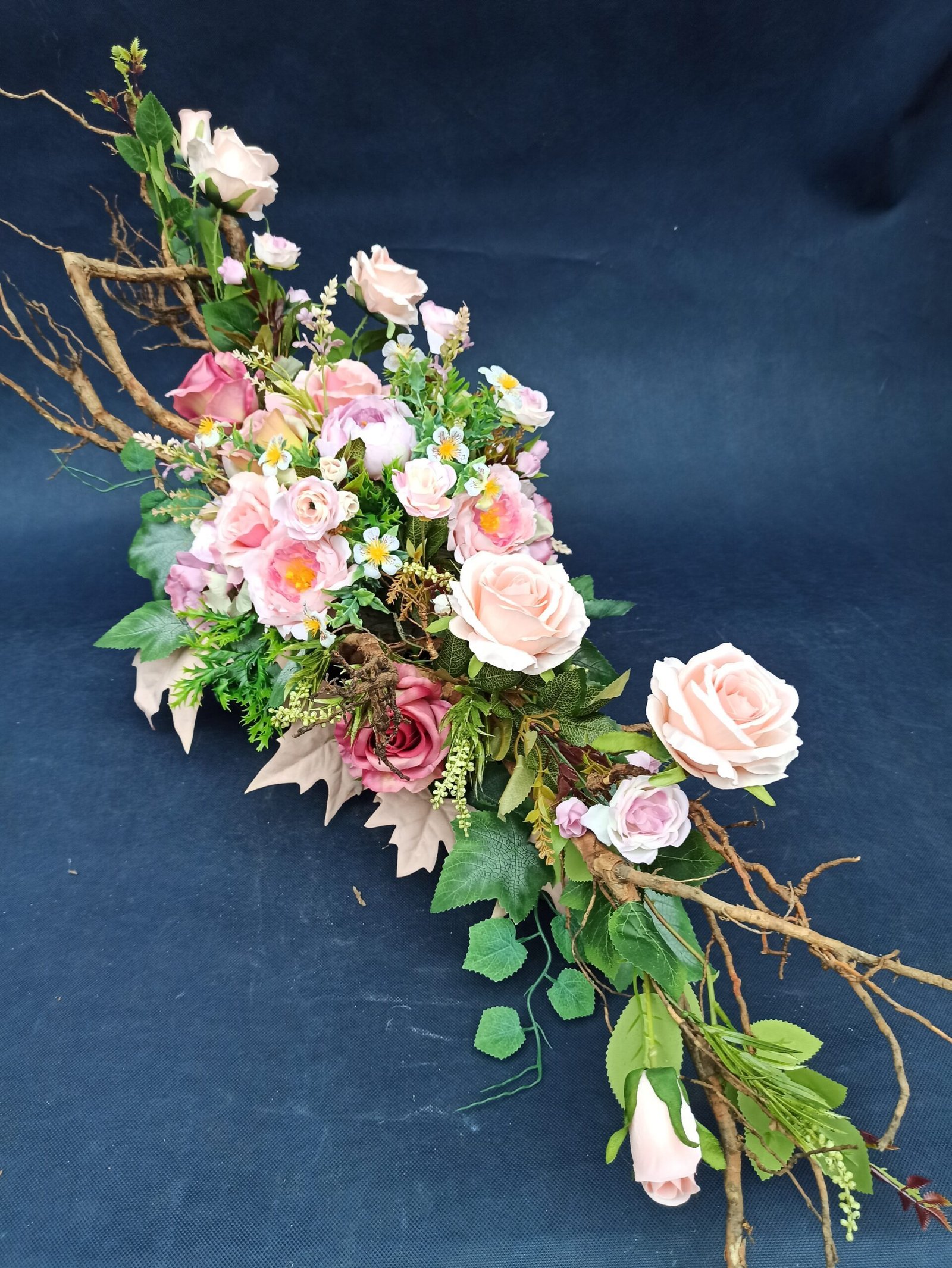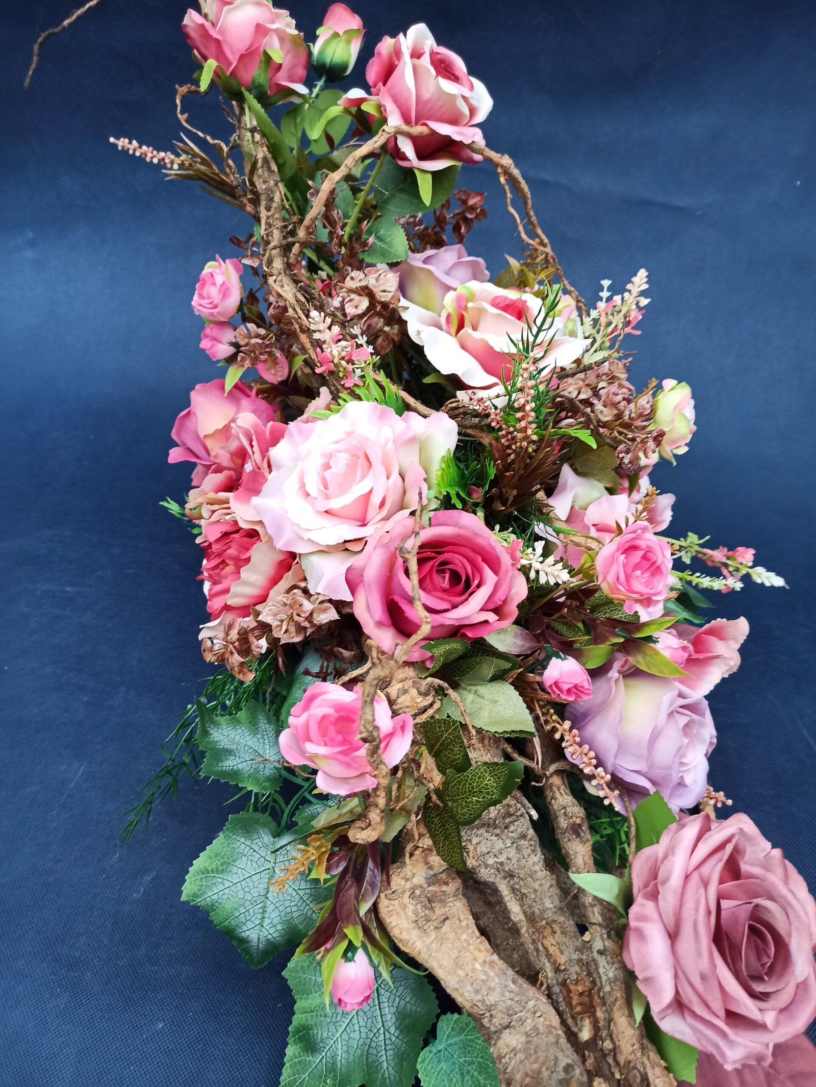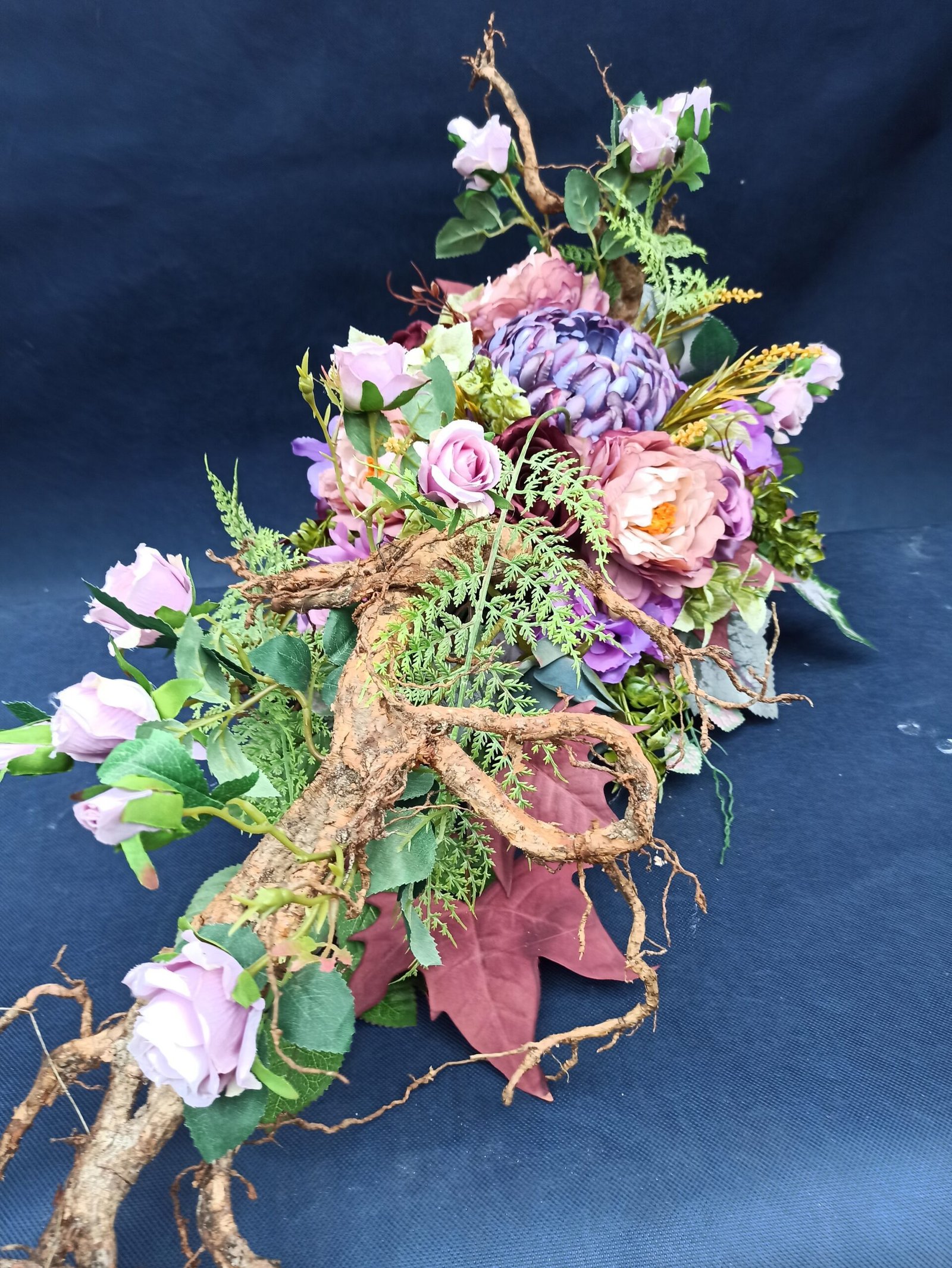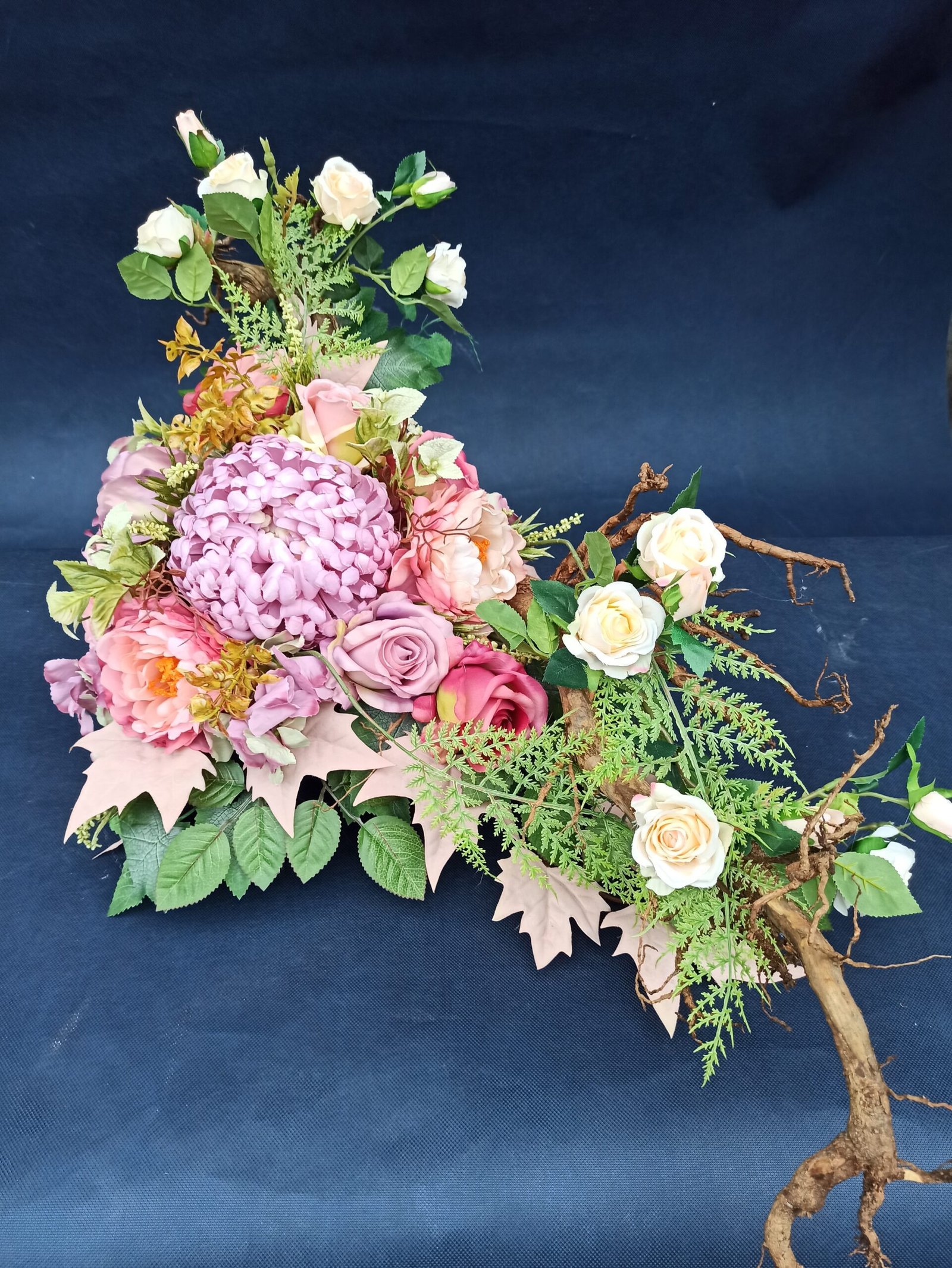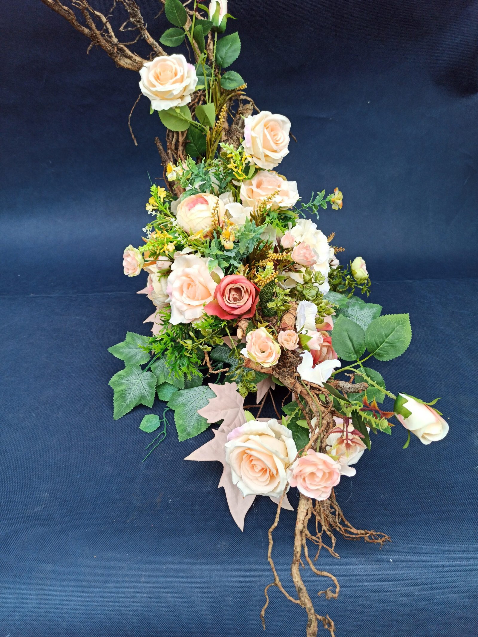 Kompozycja stojąco-leżąca z głównym elementem korzenia, na którym do góry wspinają się piękne kwiaty, róże, dalie, peonie, jak i chryzantemy. Również ku dołowi spływają po korzeniu te kwiaty. Ładne otoczenie zielonych dodatków, liści, paproci i pięknych gałązek, drobnych kwiatków, tworzy piękną kompozycję na wszystkich świętych.