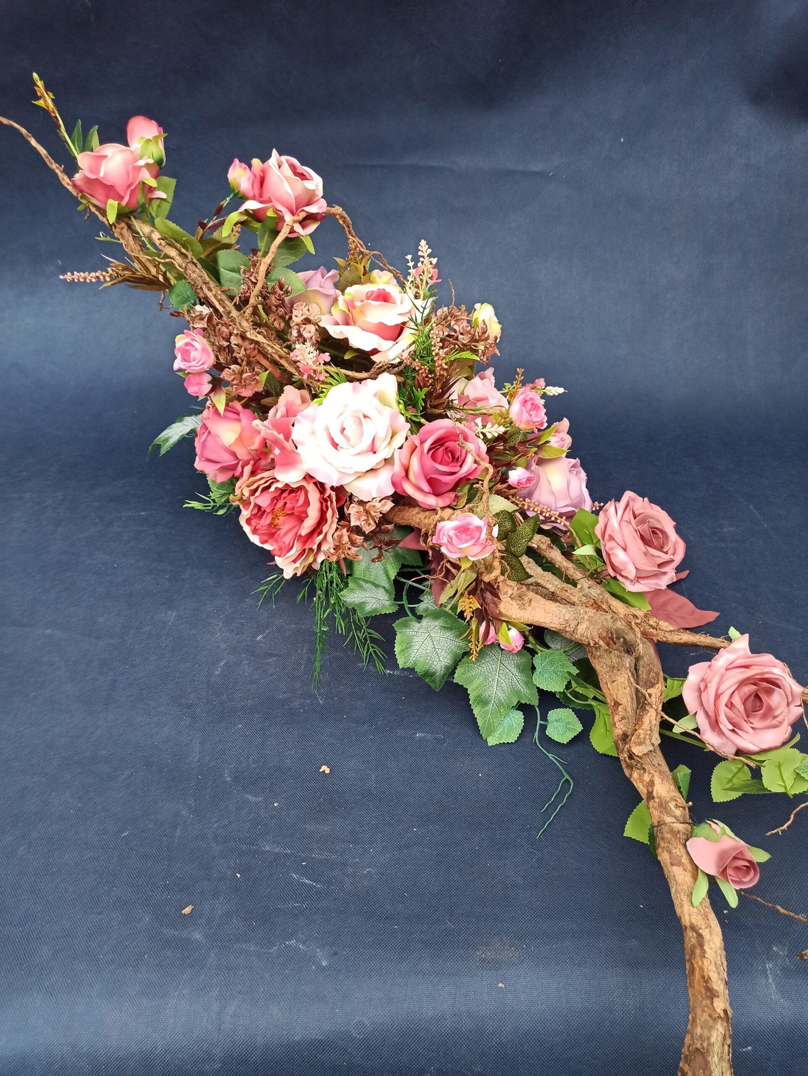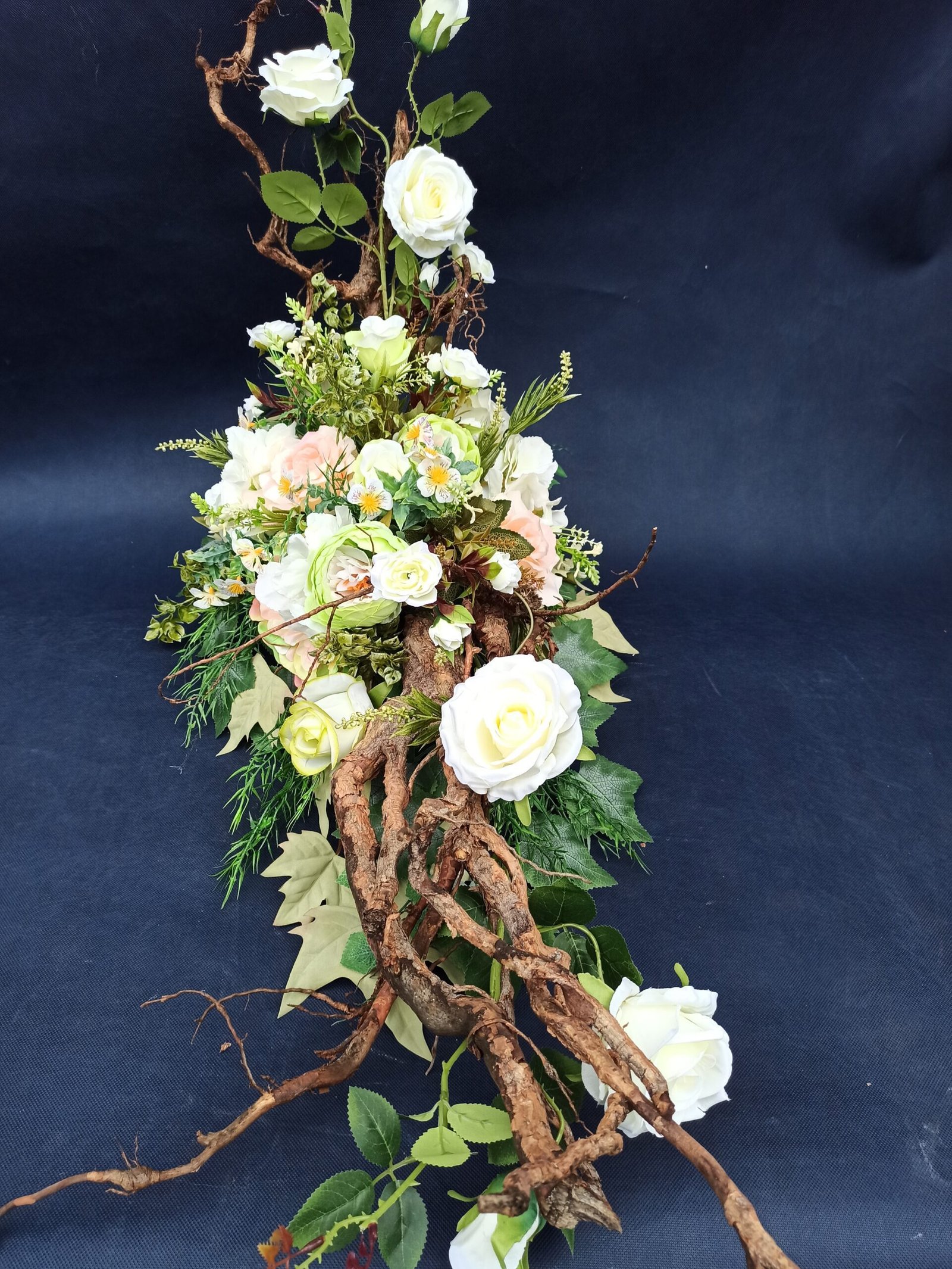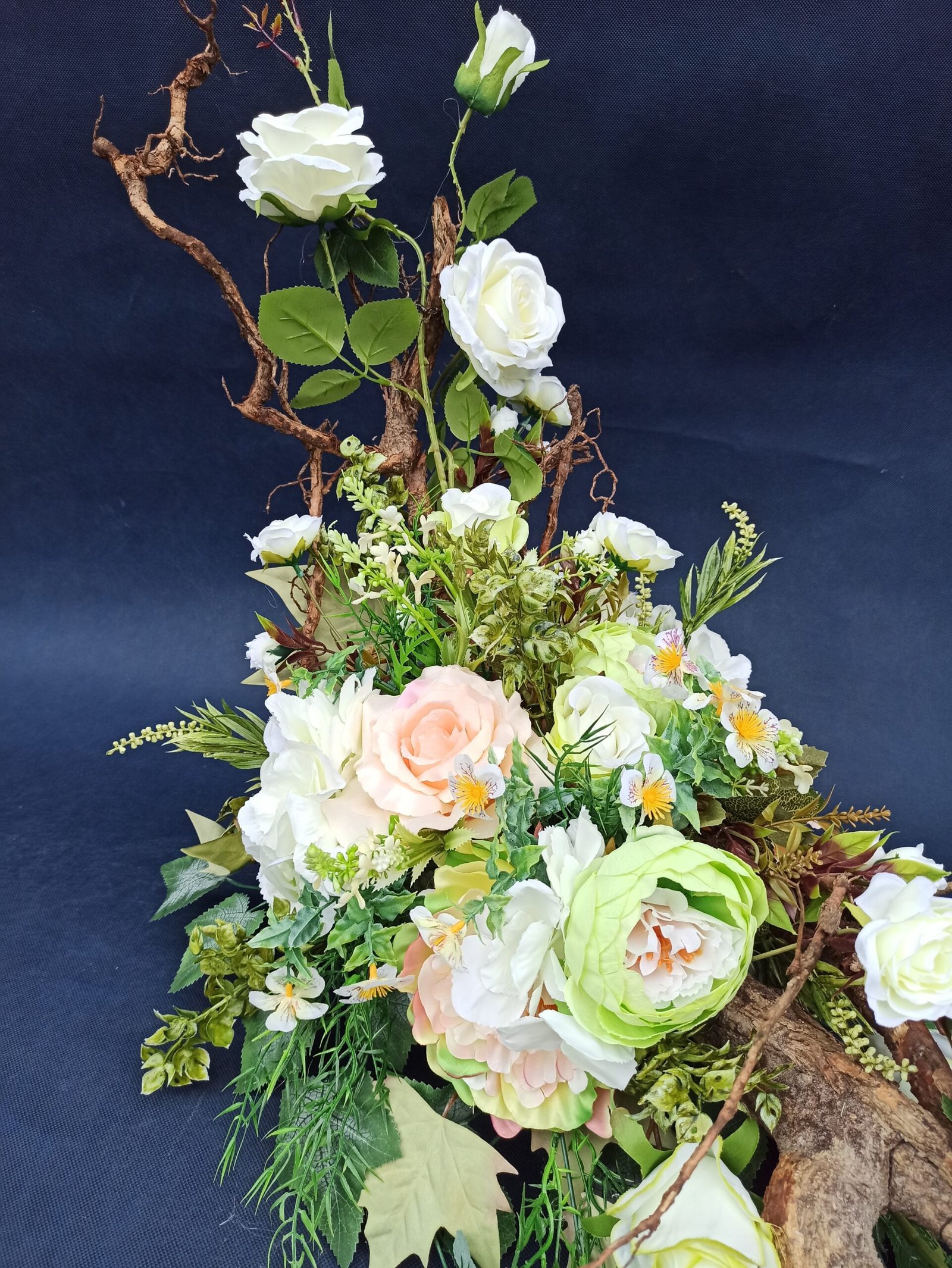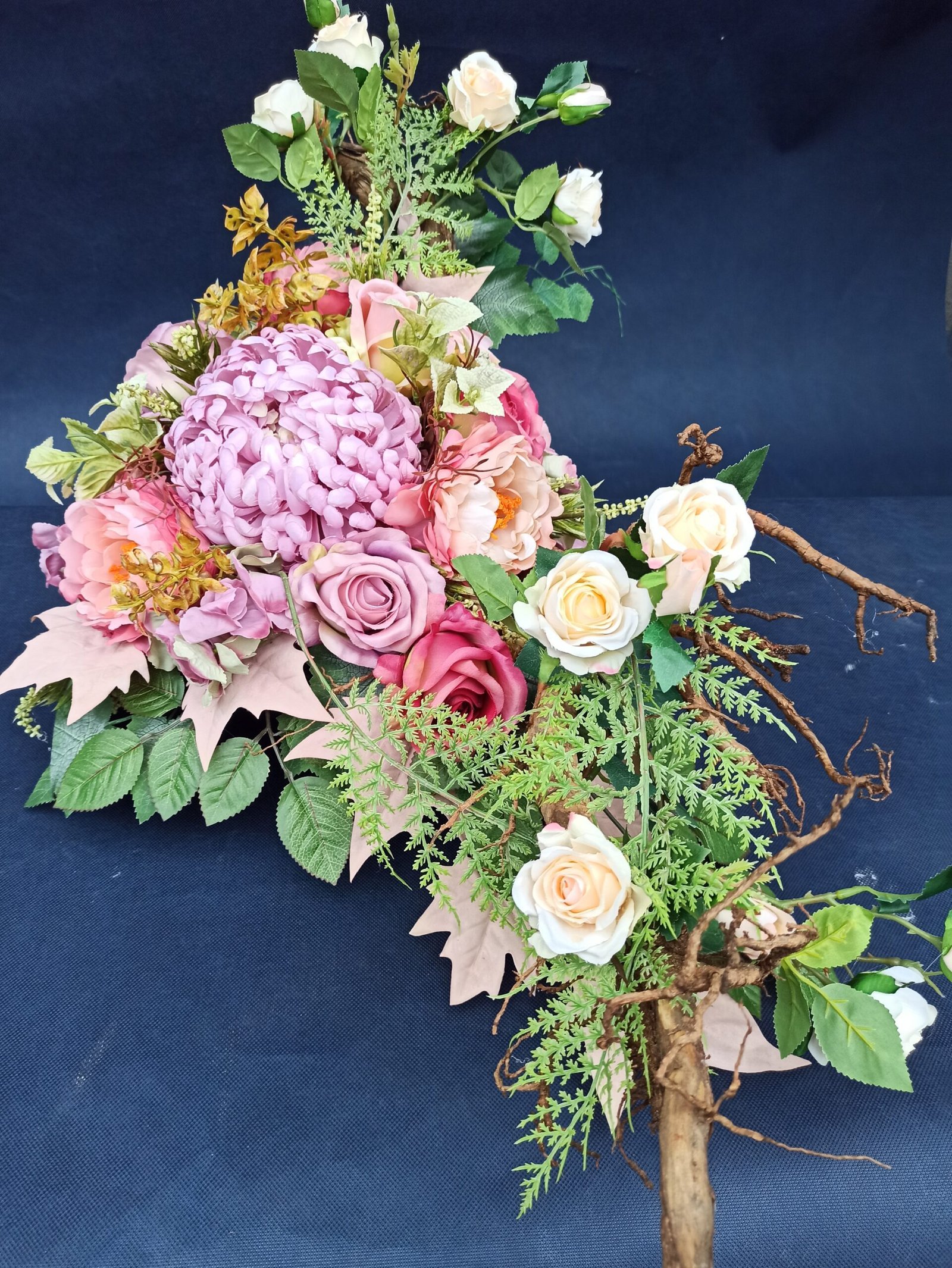 Kompozycja stojąco-leżąca z głównym elementem korzenia, na którym do góry wspinają się piękne kwiaty, róże, dalie, peonie, jak i chryzantemy. Również ku dołowi spływają po korzeniu te kwiaty. Ładne otoczenie zielonych dodatków, liści, paproci i pięknych gałązek, drobnych kwiatków, tworzy piękną kompozycję na wszystkich świętych.