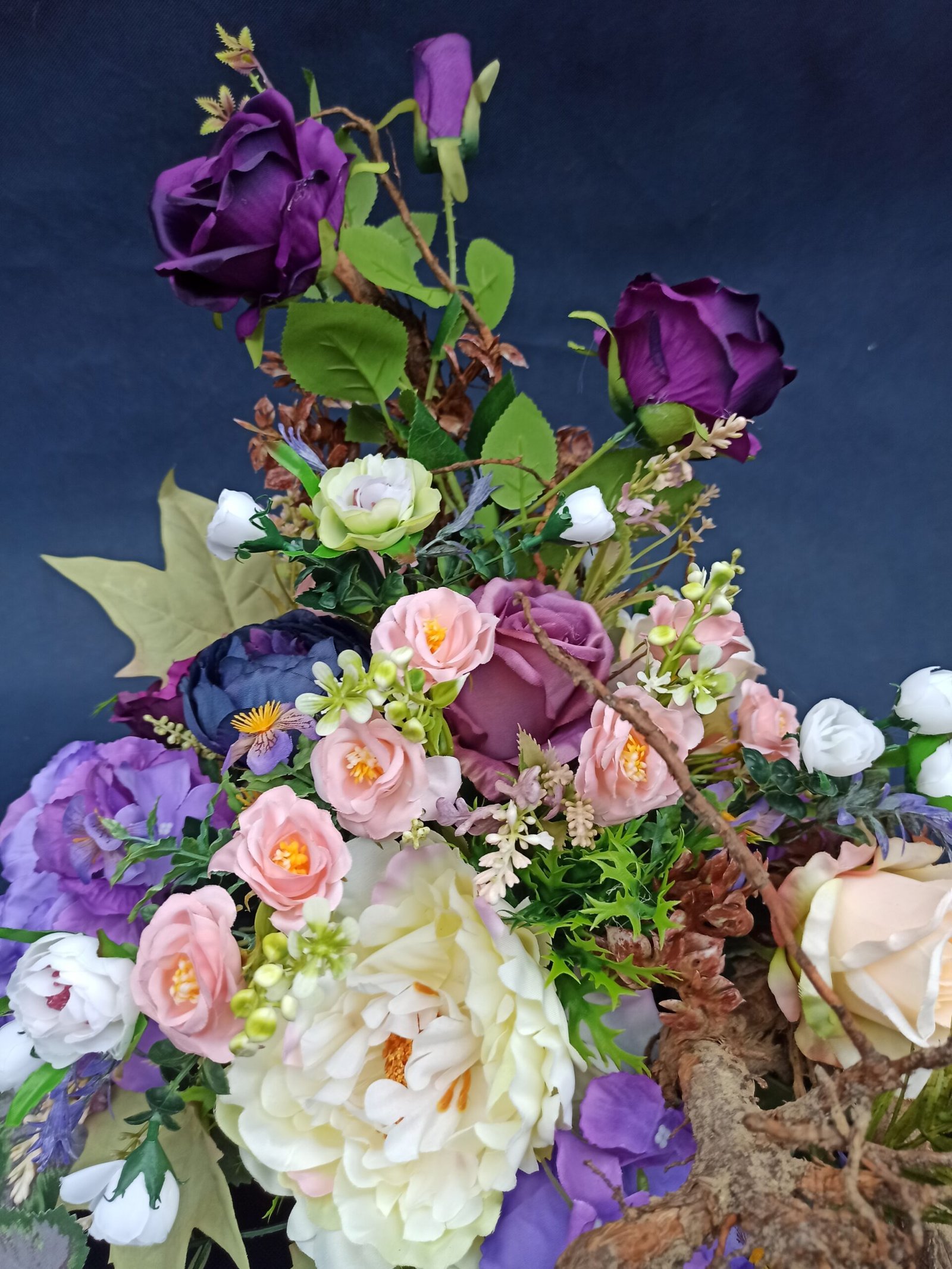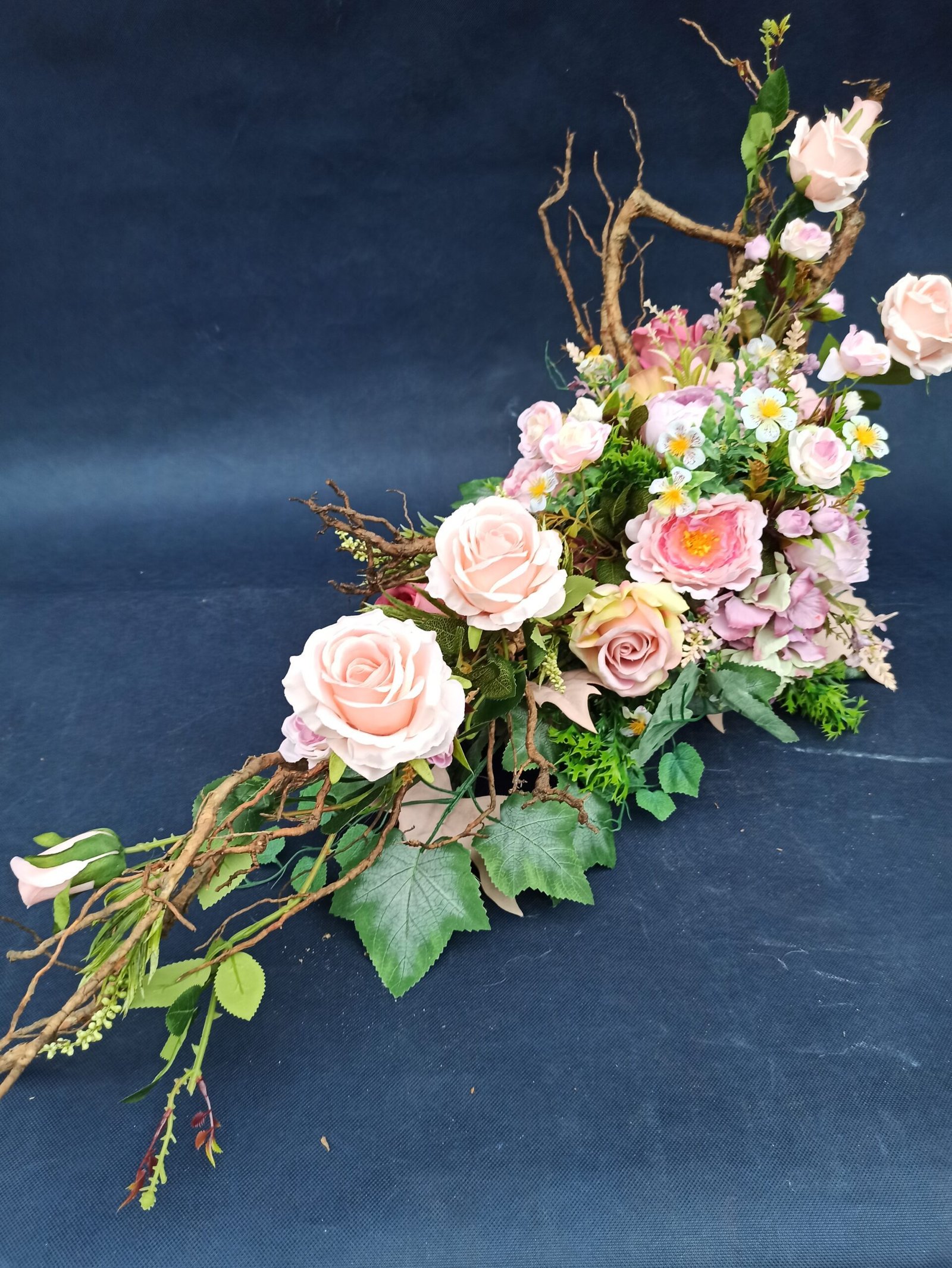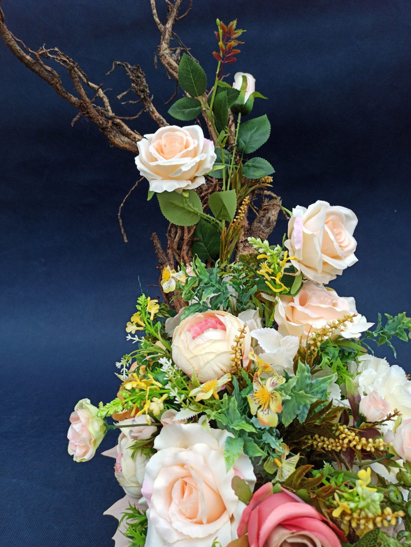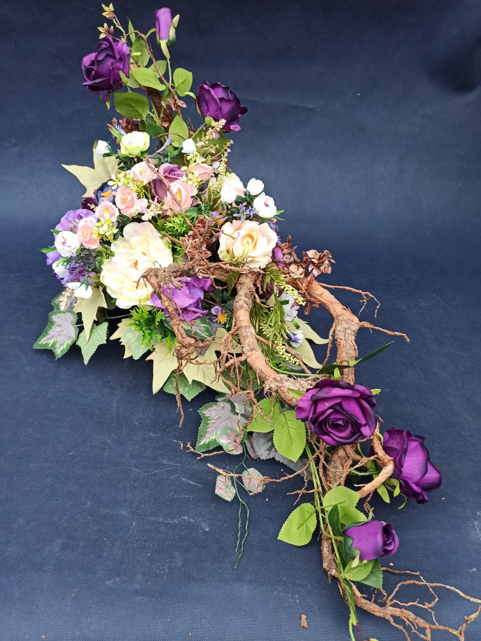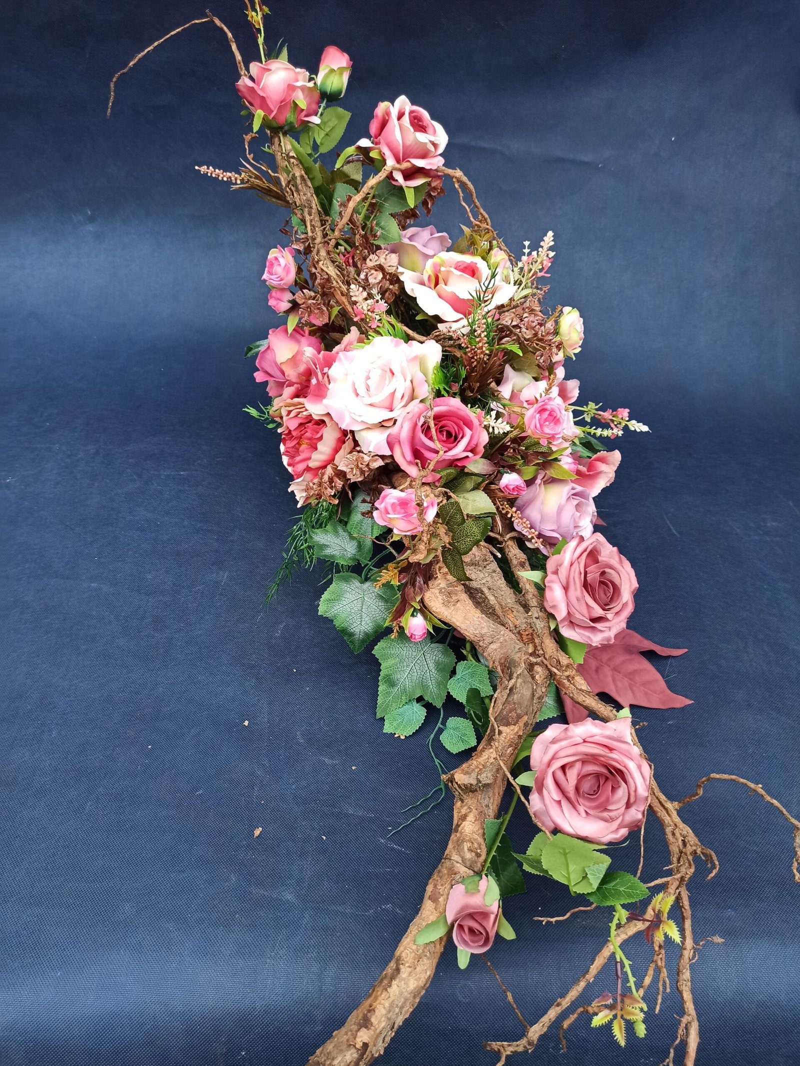 Kompozycja stojąco-leżąca z głównym elementem korzenia, na którym do góry wspinają się piękne kwiaty, róże, dalie, peonie, jak i chryzantemy. Również ku dołowi spływają po korzeniu te kwiaty. Ładne otoczenie zielonych dodatków, liści, paproci i pięknych gałązek, drobnych kwiatków, tworzy piękną kompozycję na wszystkich świętych.