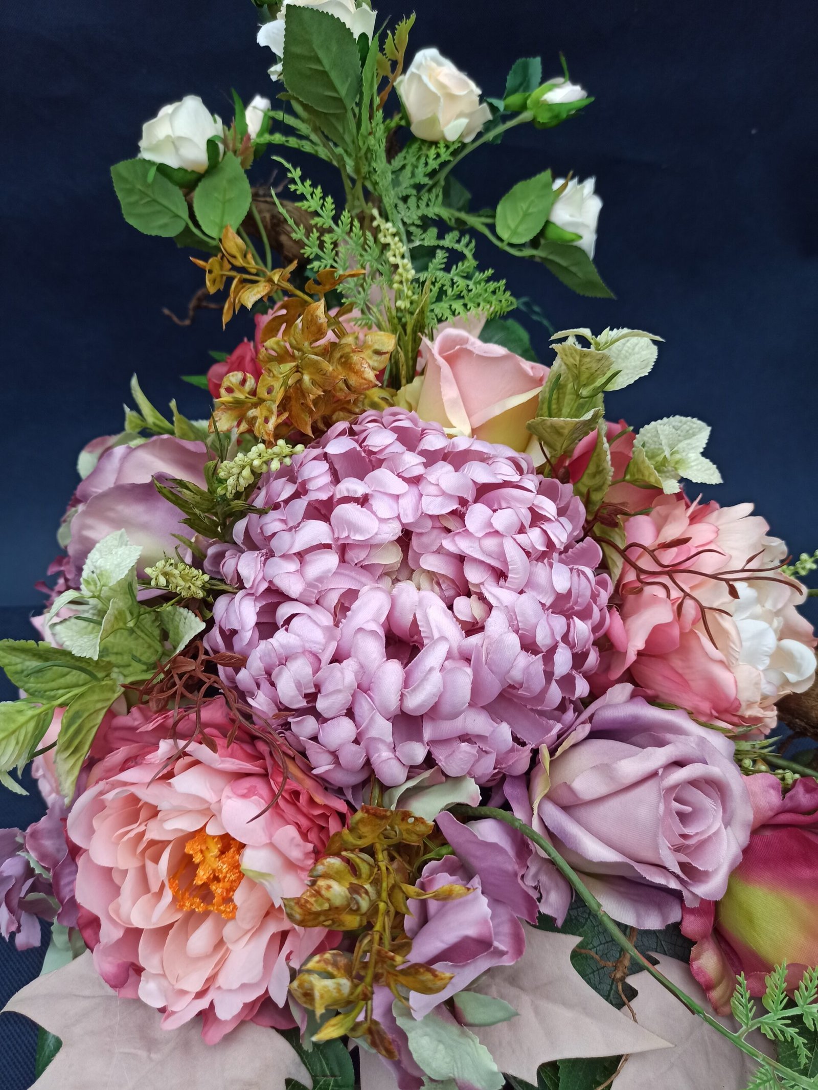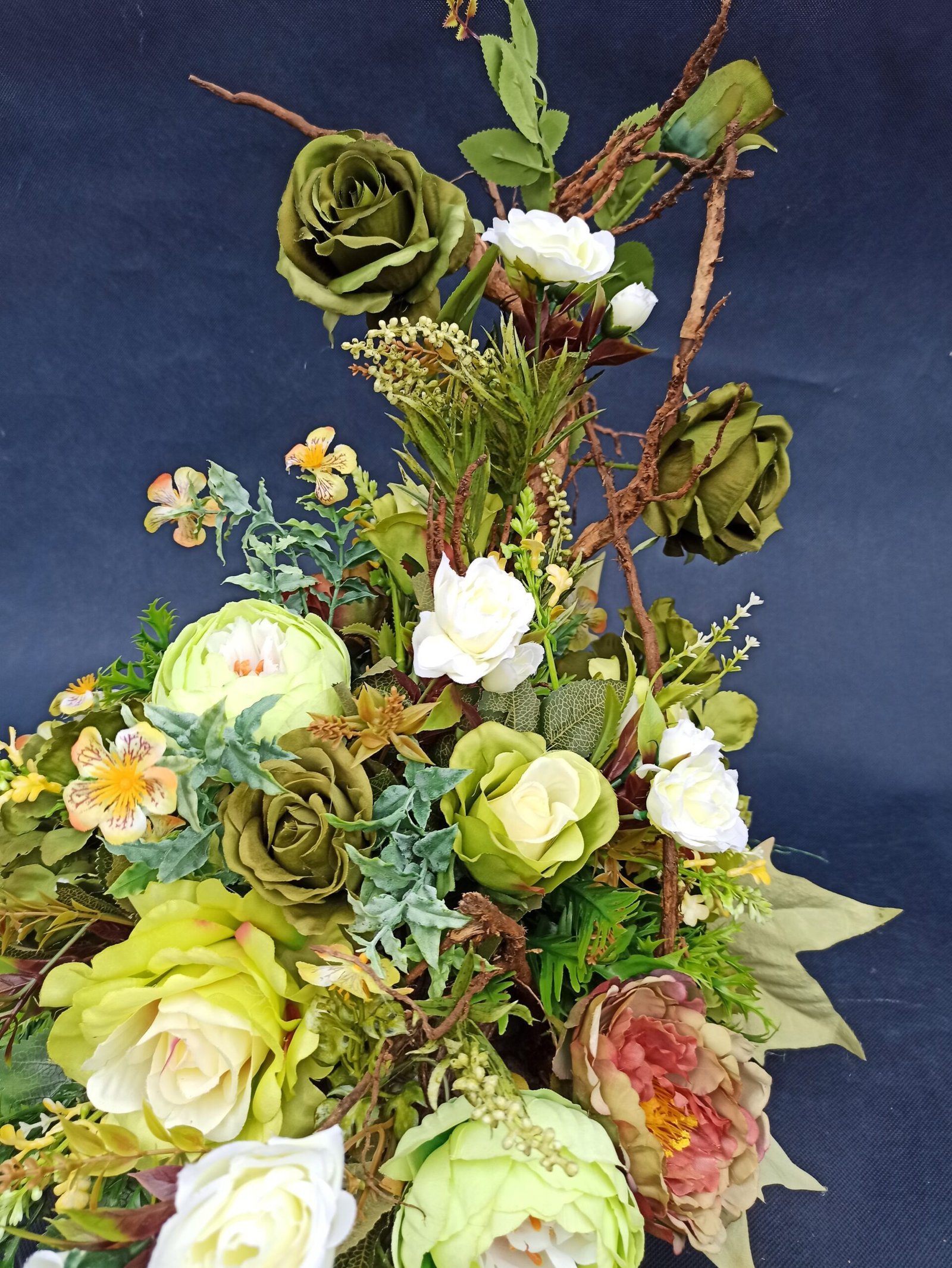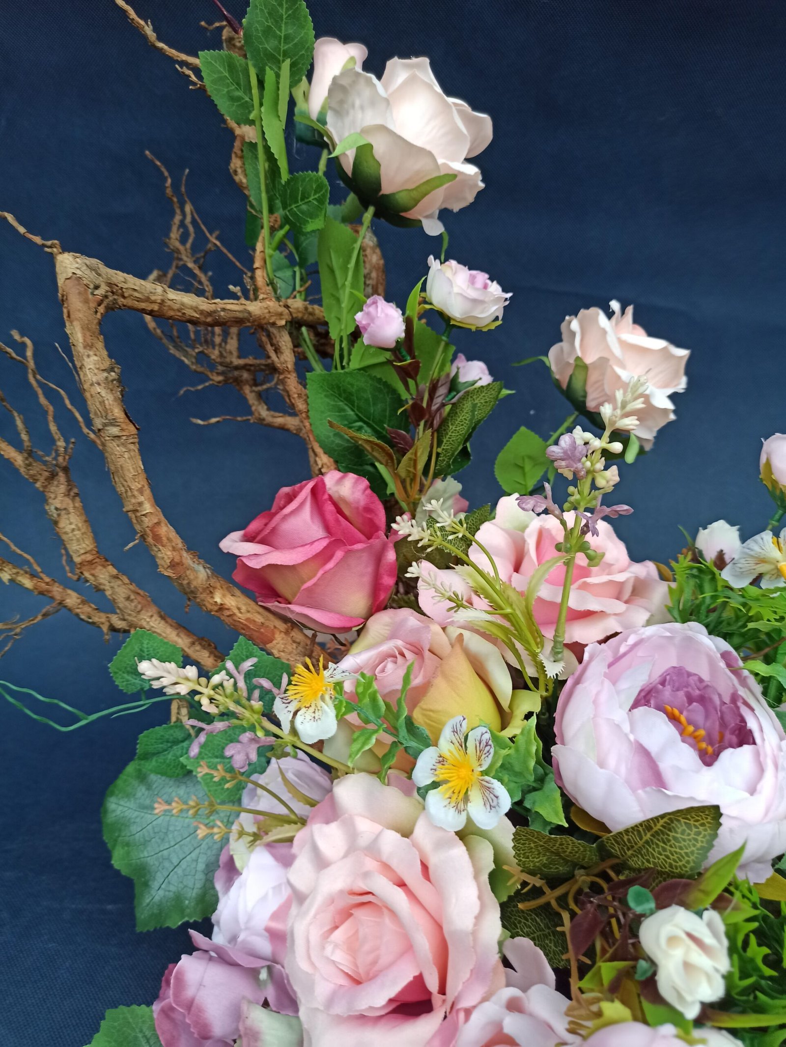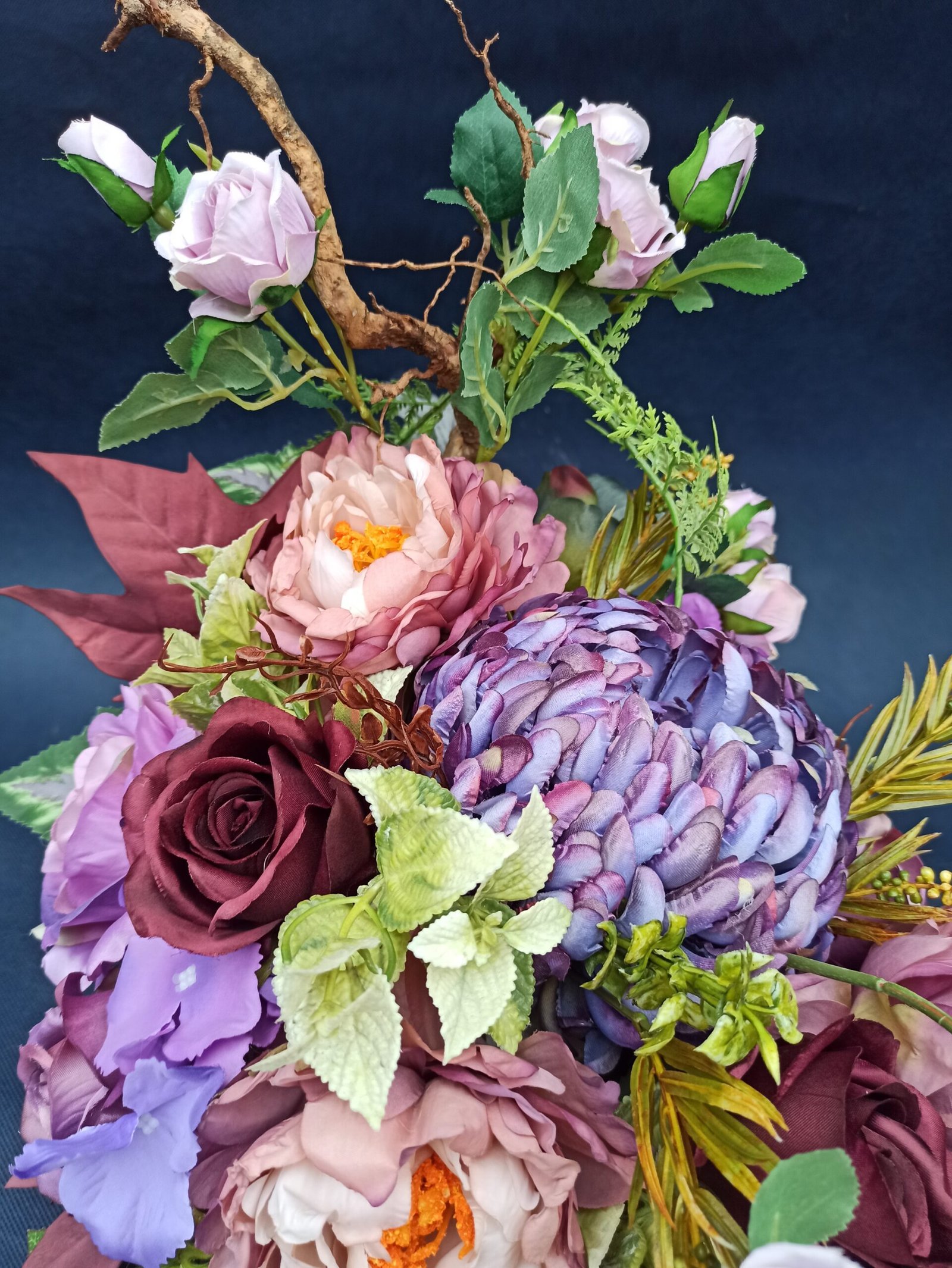 Kompozycja stojąco-leżąca z głównym elementem korzenia, na którym do góry wspinają się piękne kwiaty, róże, dalie, peonie, jak i chryzantemy. Również ku dołowi spływają po korzeniu te kwiaty. Ładne otoczenie zielonych dodatków, liści, paproci i pięknych gałązek, drobnych kwiatków, tworzy piękną kompozycję na wszystkich świętych.
