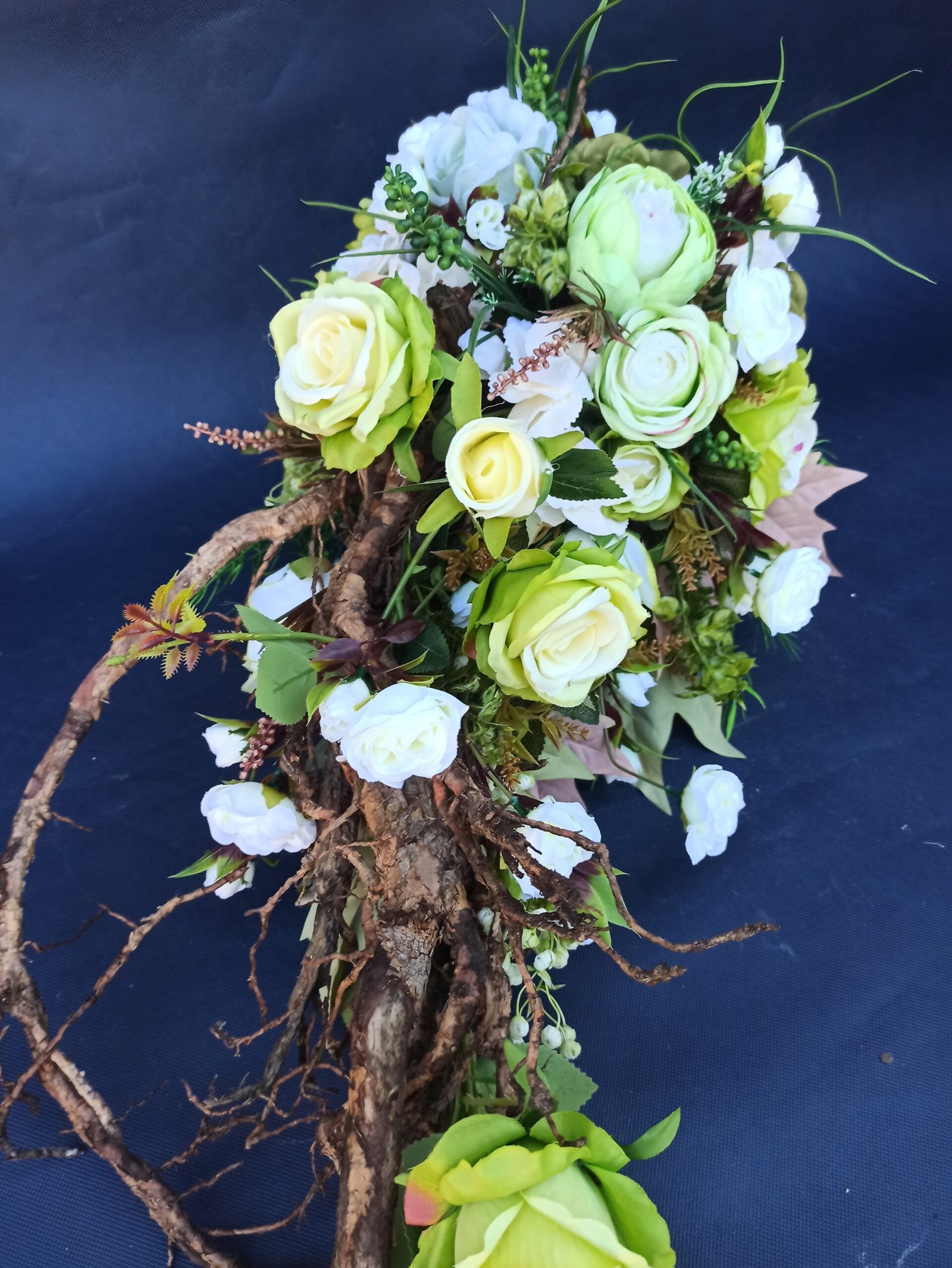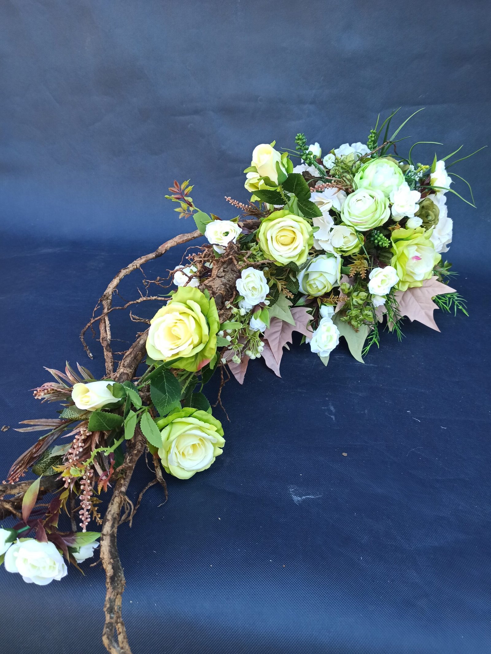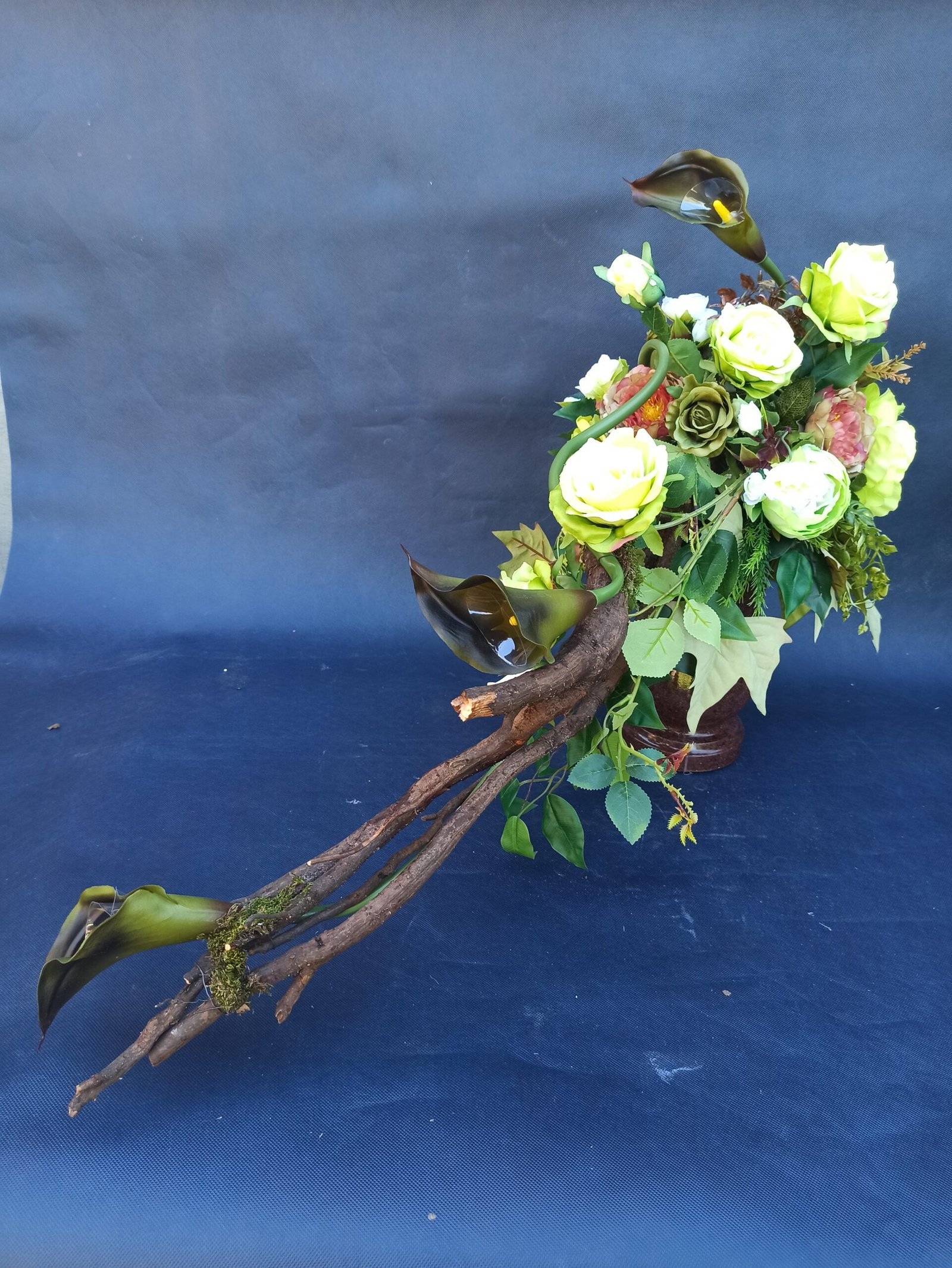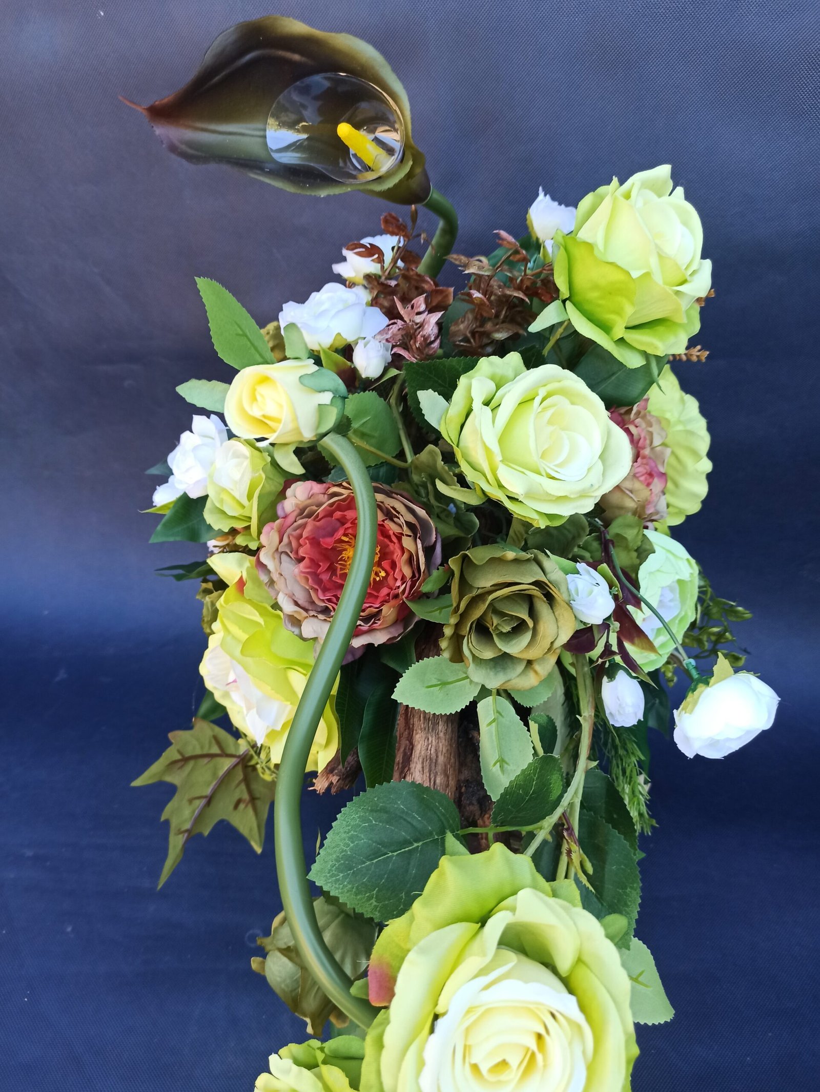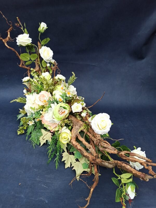 Wazon spływający na pomnik, który głównym elementem jest korzeń, na którym spływają delikatnie kwiaty. Całość bukietu jest z różnorodnych kwiatów otoczonych różnymi dekoracjami pod tytułem listki, trawki i inne dodatki.