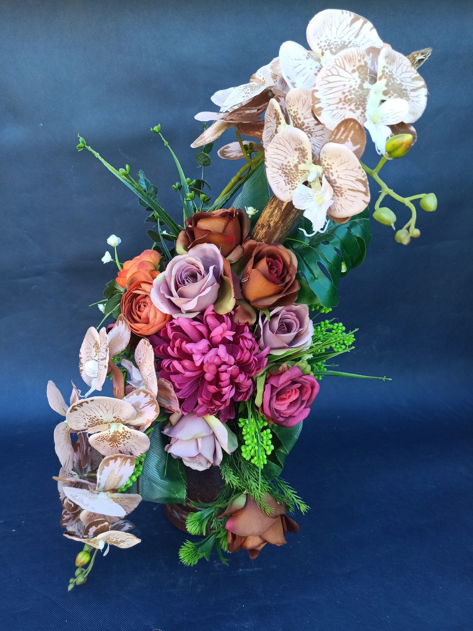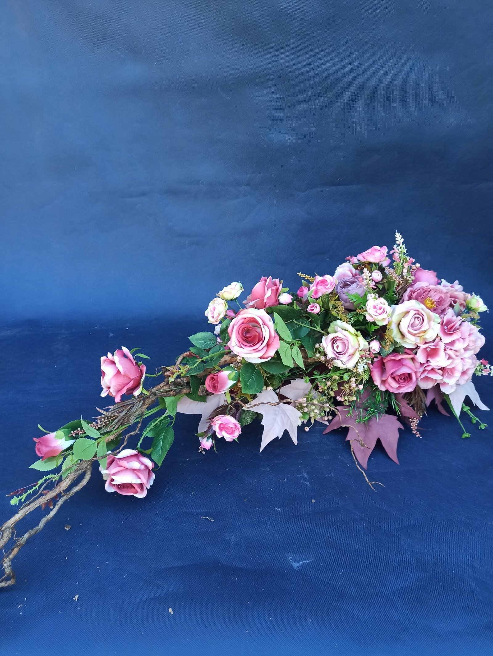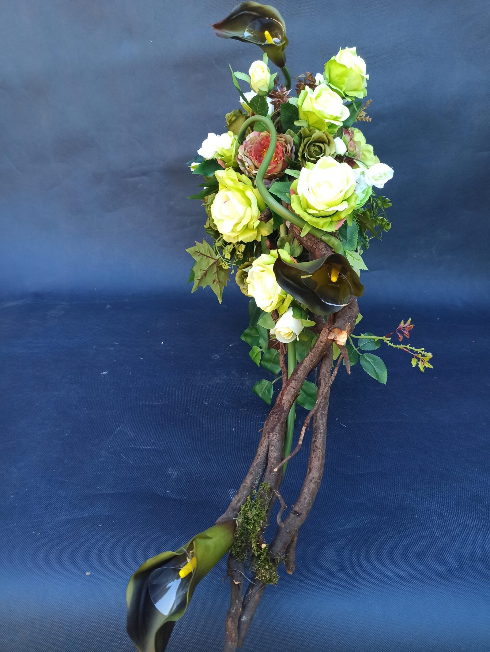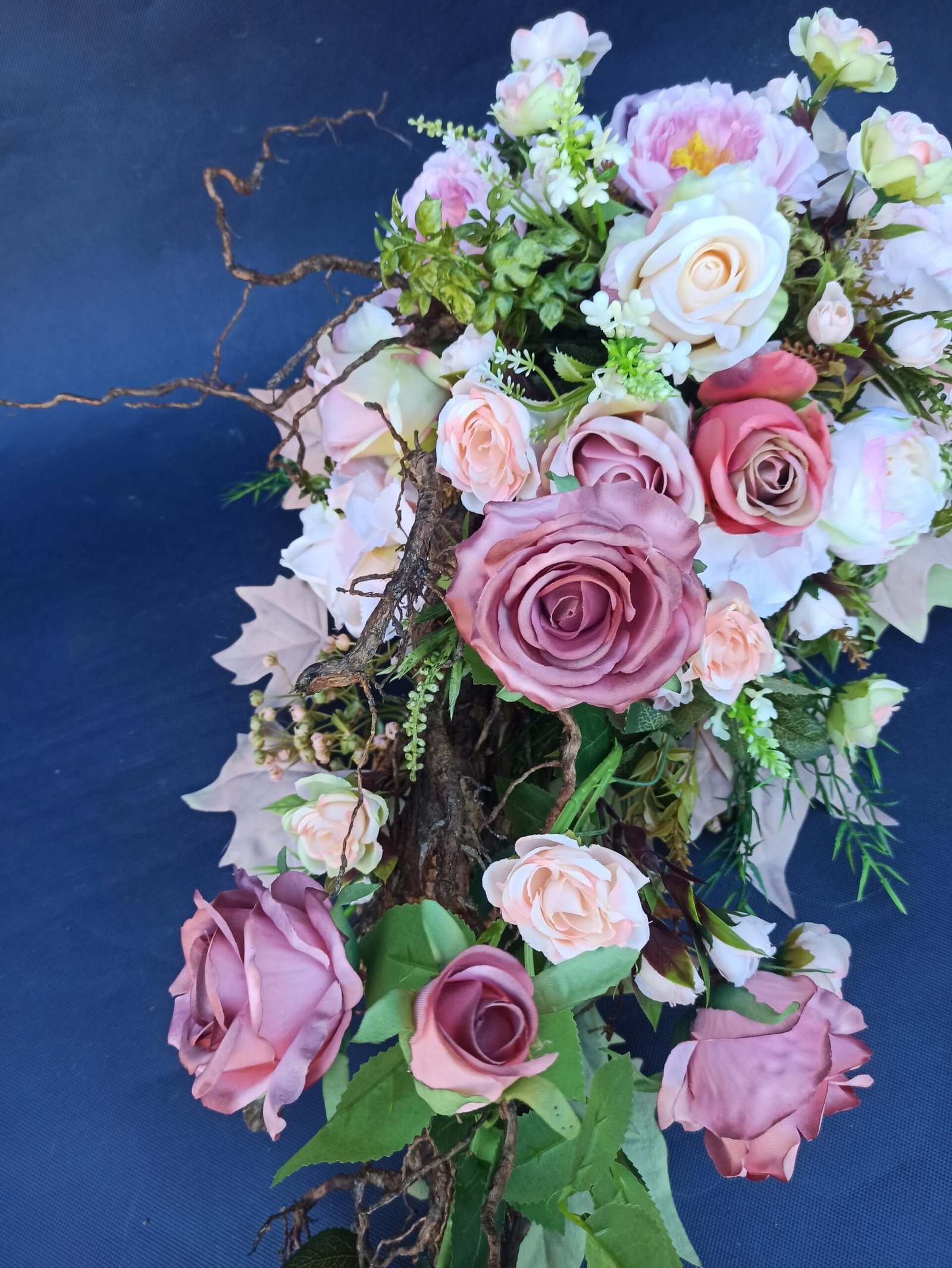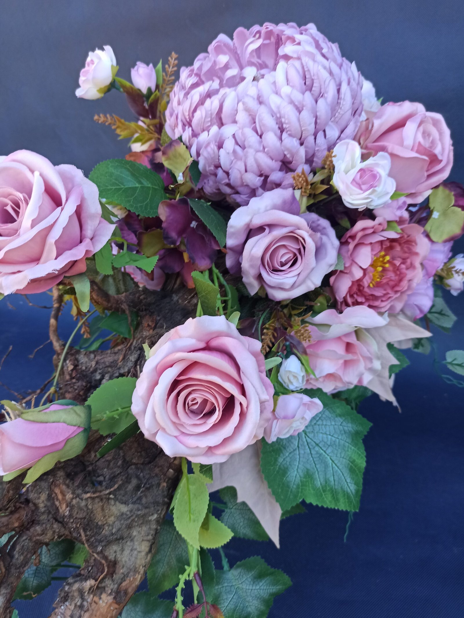 Wazon spływający na pomnik, który głównym elementem jest korzeń, na którym spływają delikatnie kwiaty. Całość bukietu jest z różnorodnych kwiatów otoczonych różnymi dekoracjami pod tytułem listki, trawki i inne dodatki.