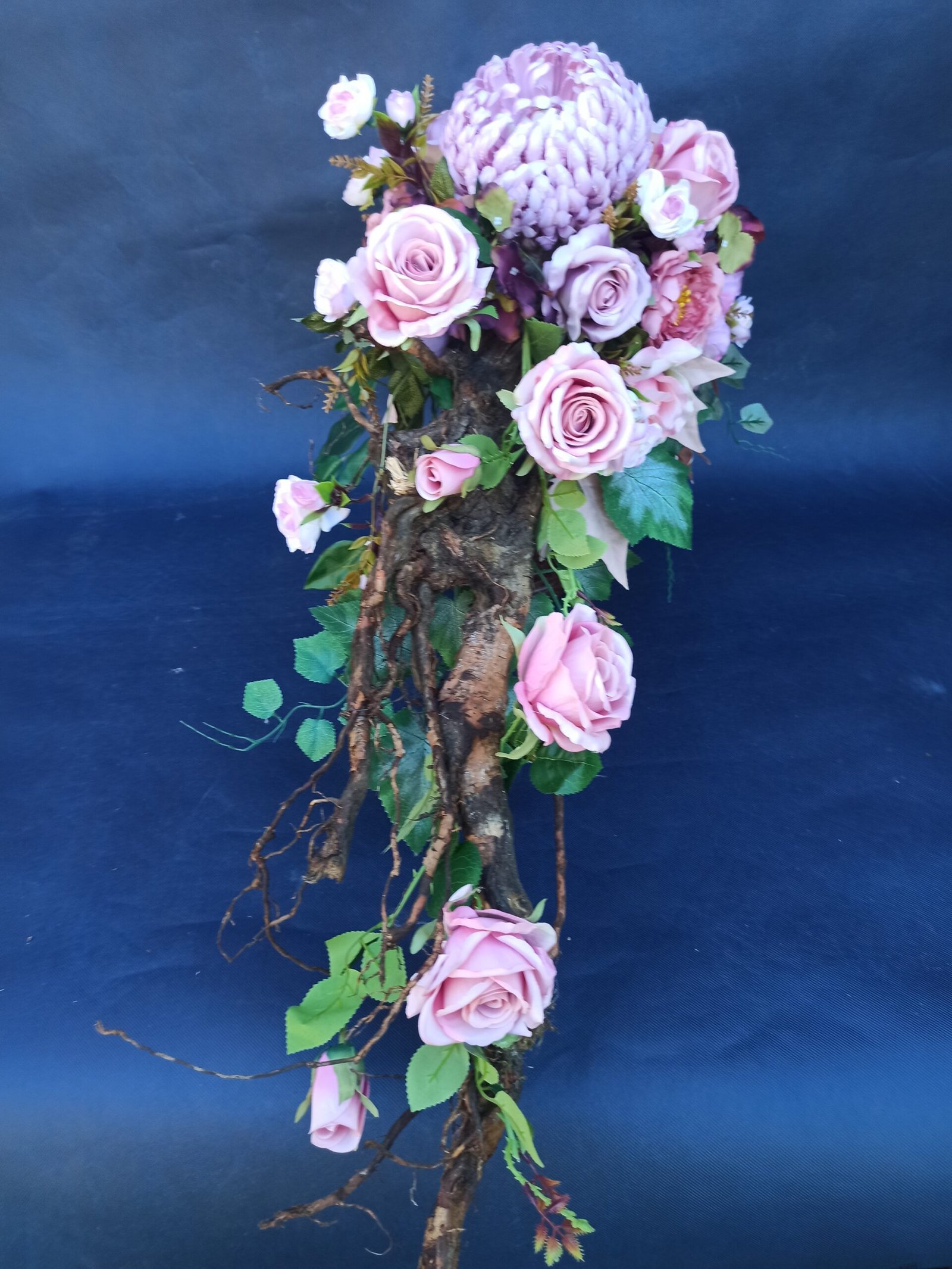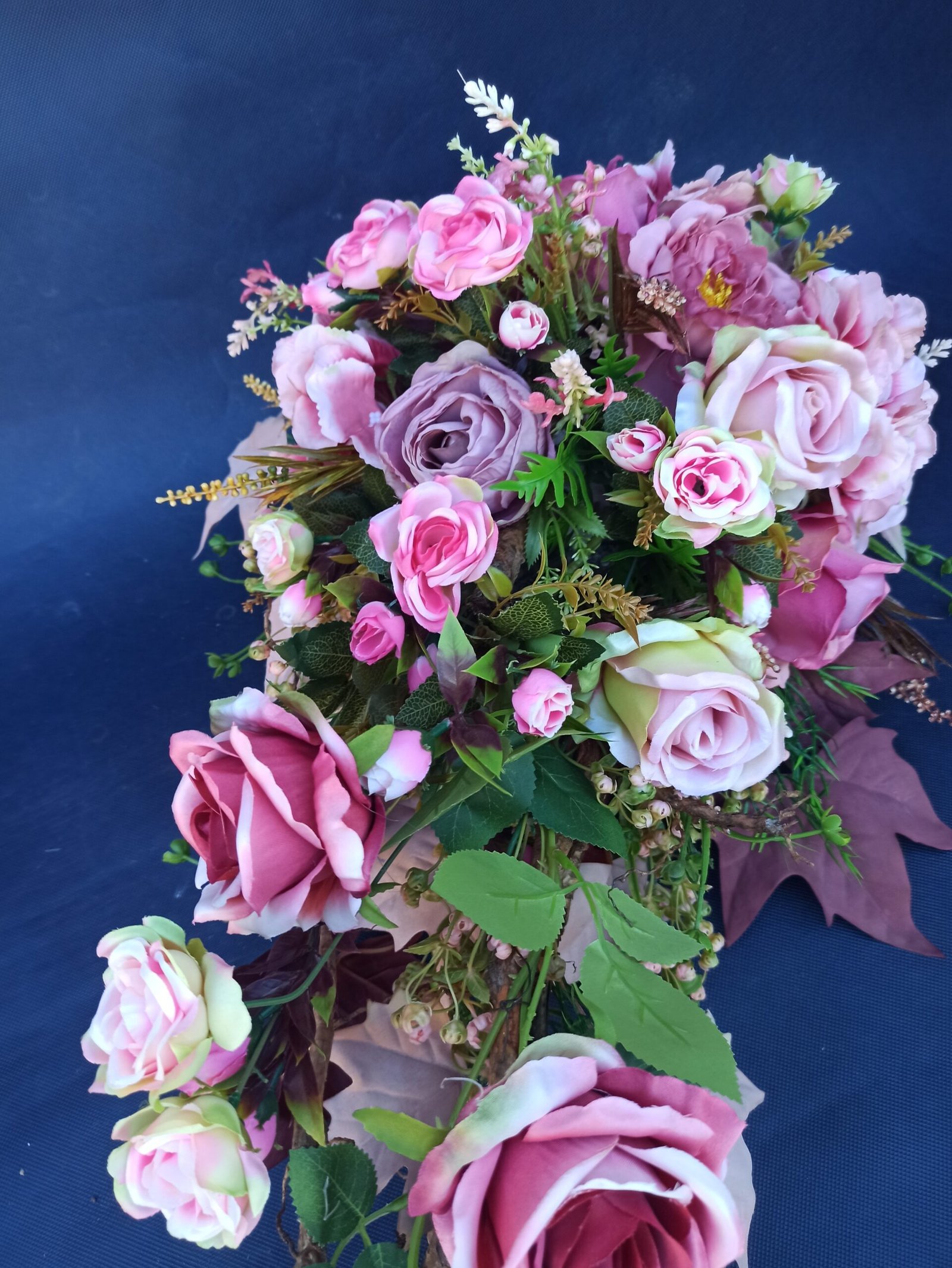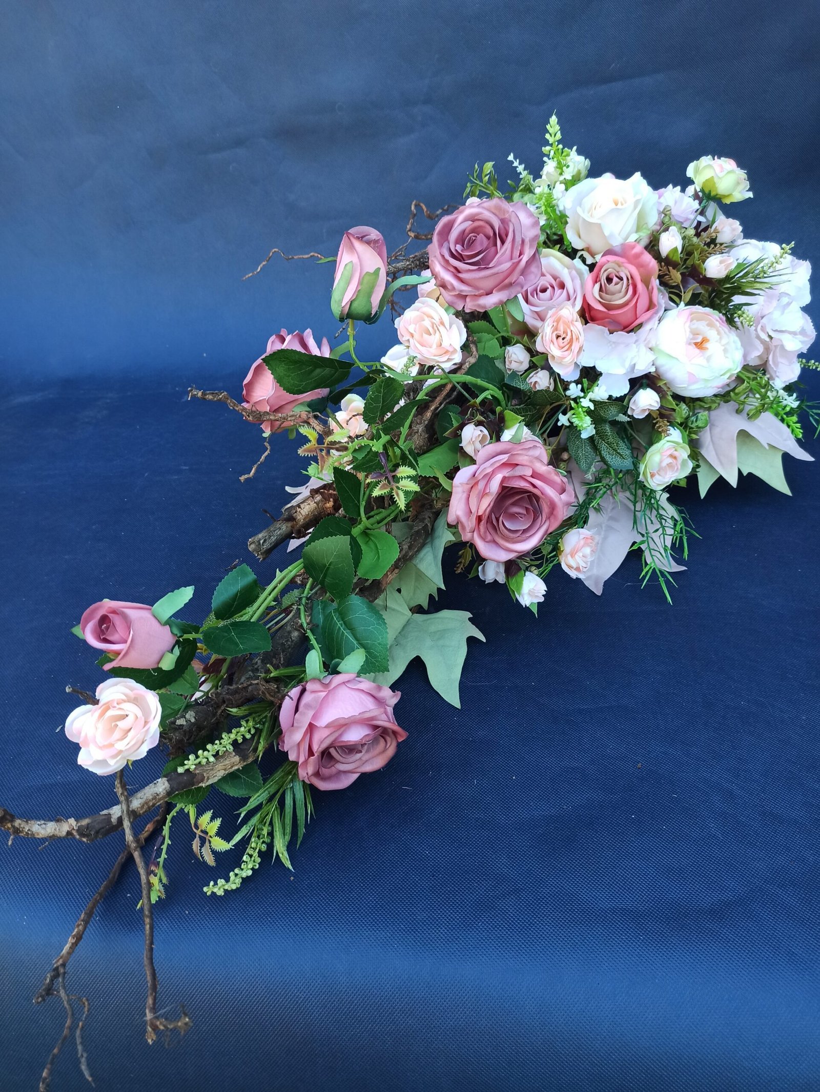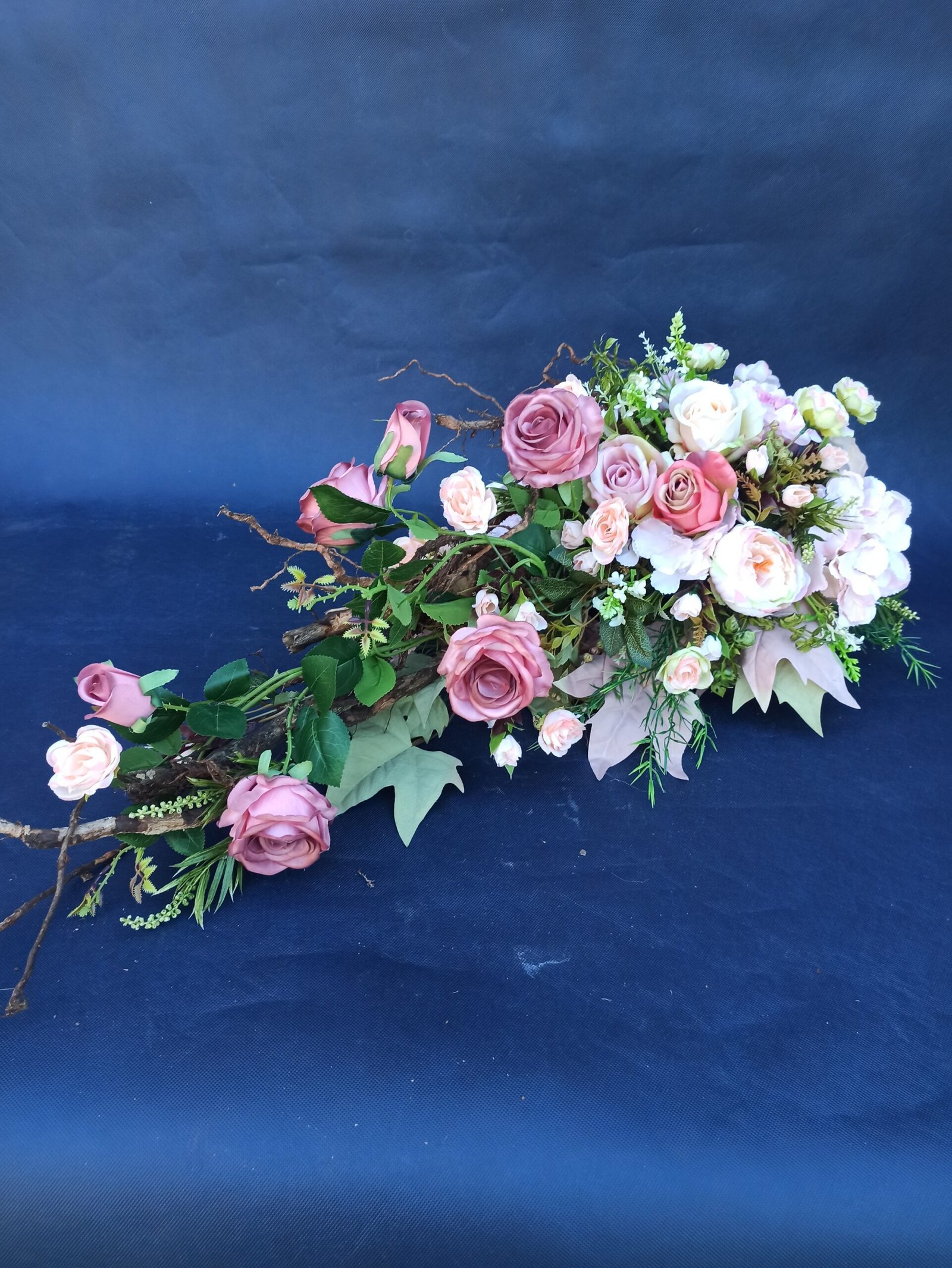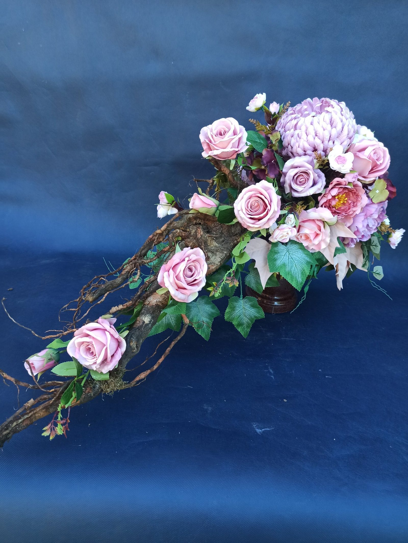 Wazon spływający na pomnik, który głównym elementem jest korzeń, na którym spływają delikatnie kwiaty. Całość bukietu jest z różnorodnych kwiatów otoczonych różnymi dekoracjami pod tytułem listki, trawki i inne dodatki.