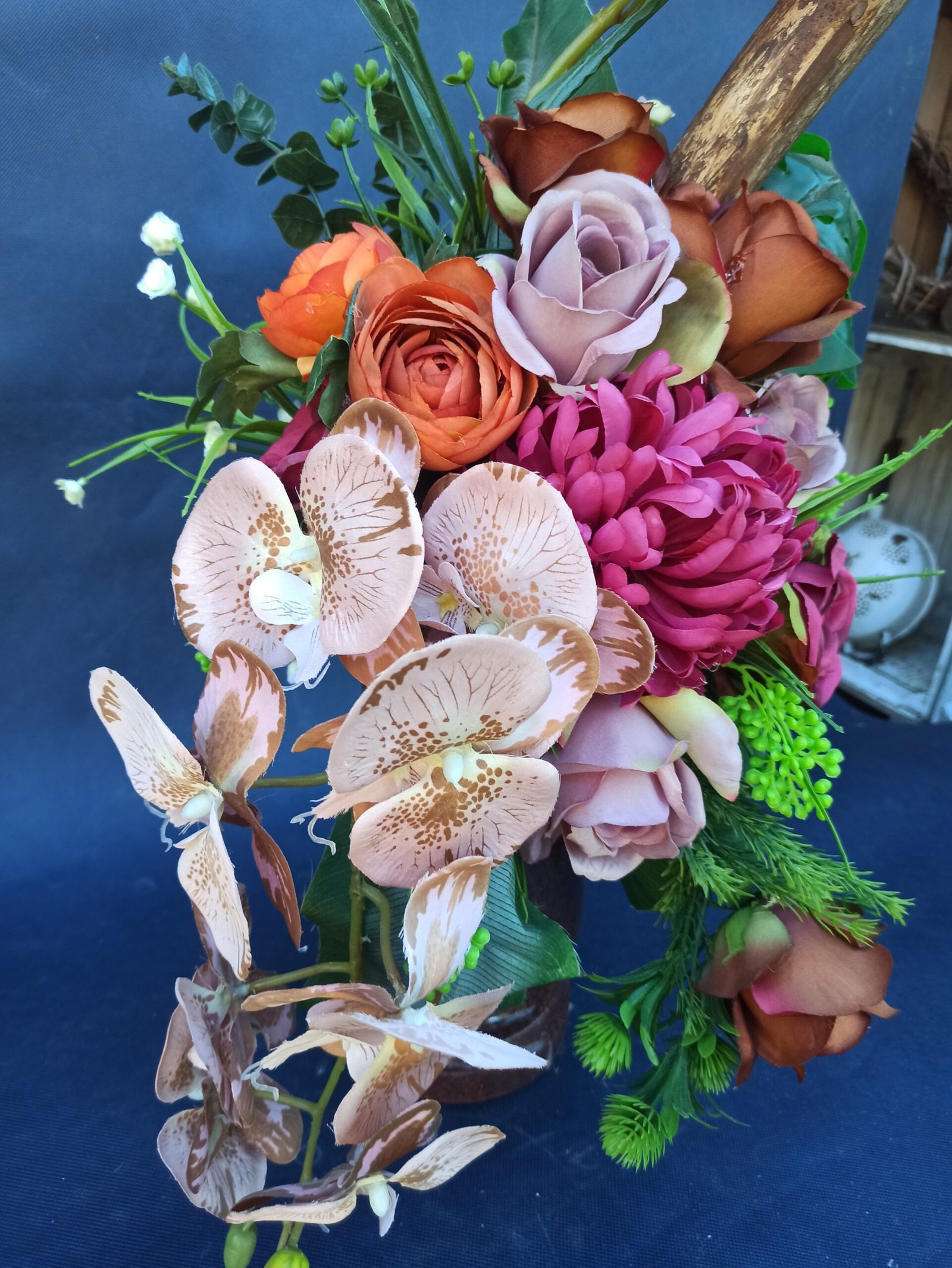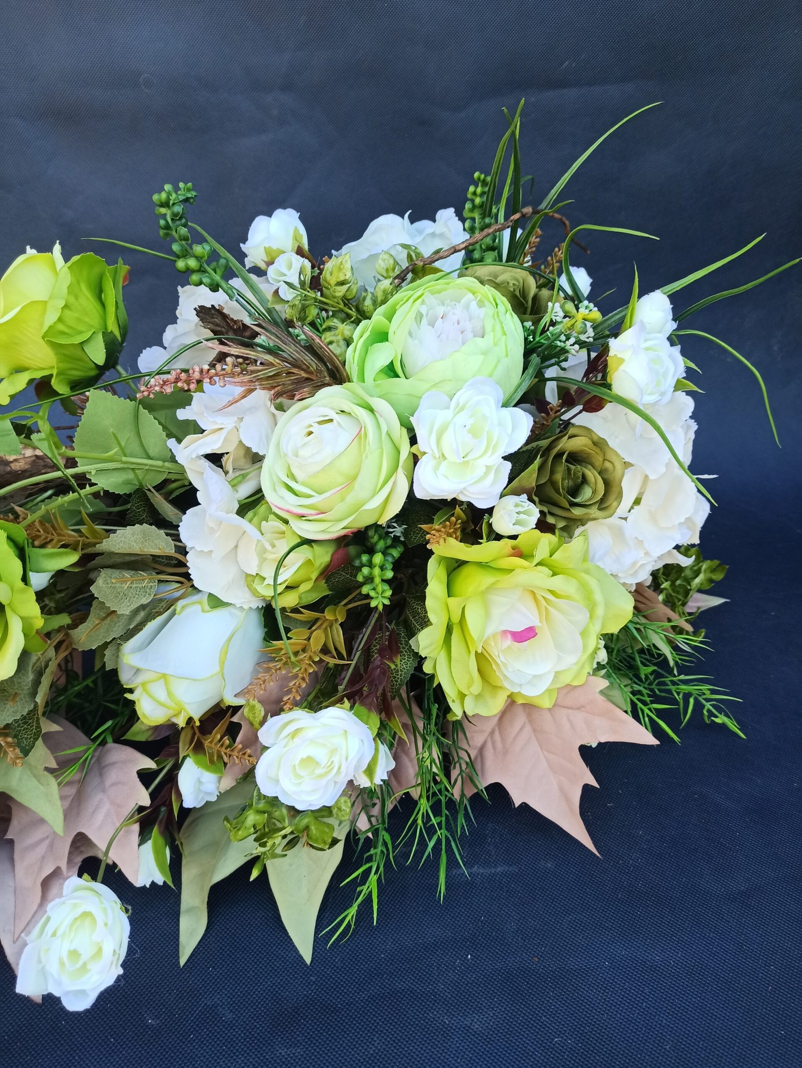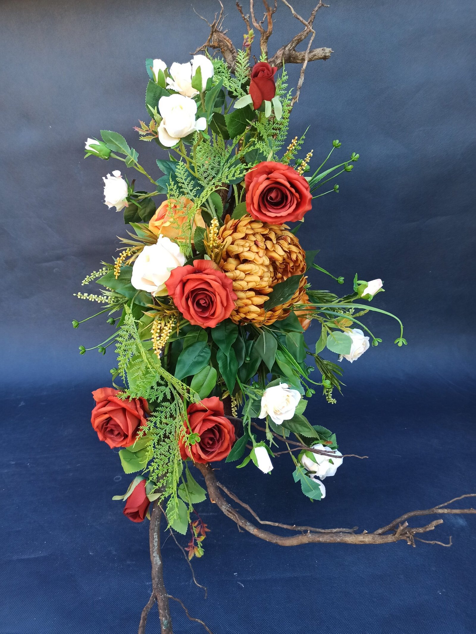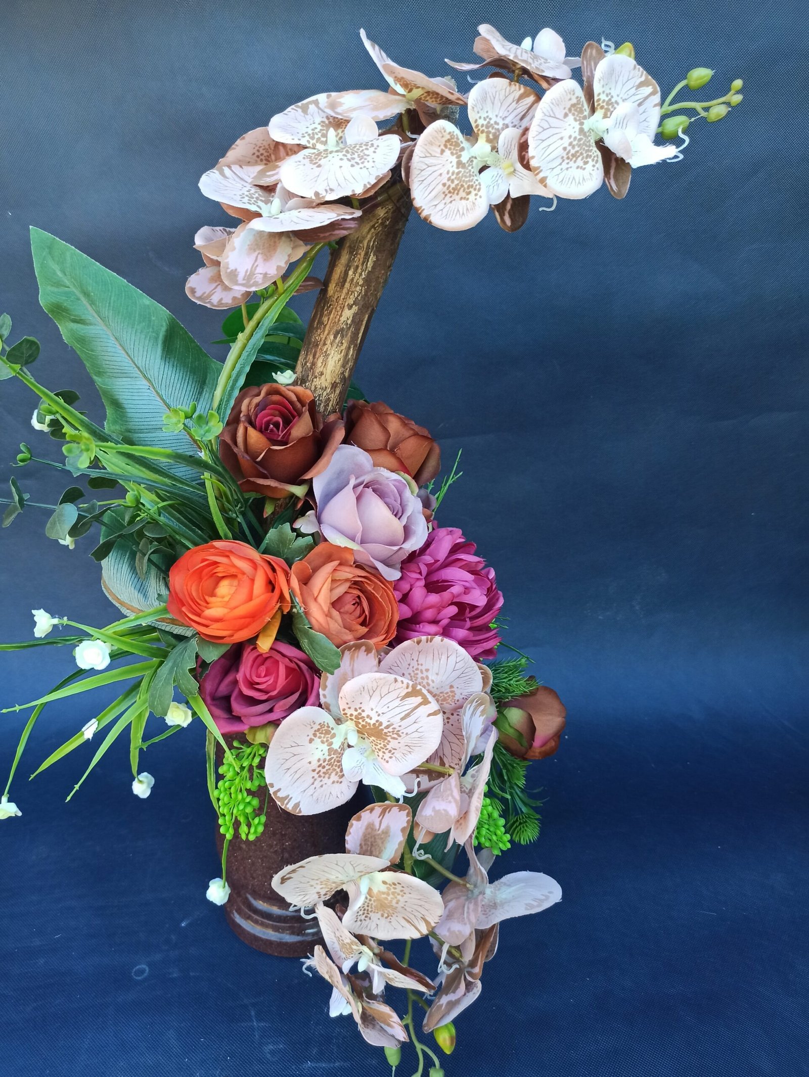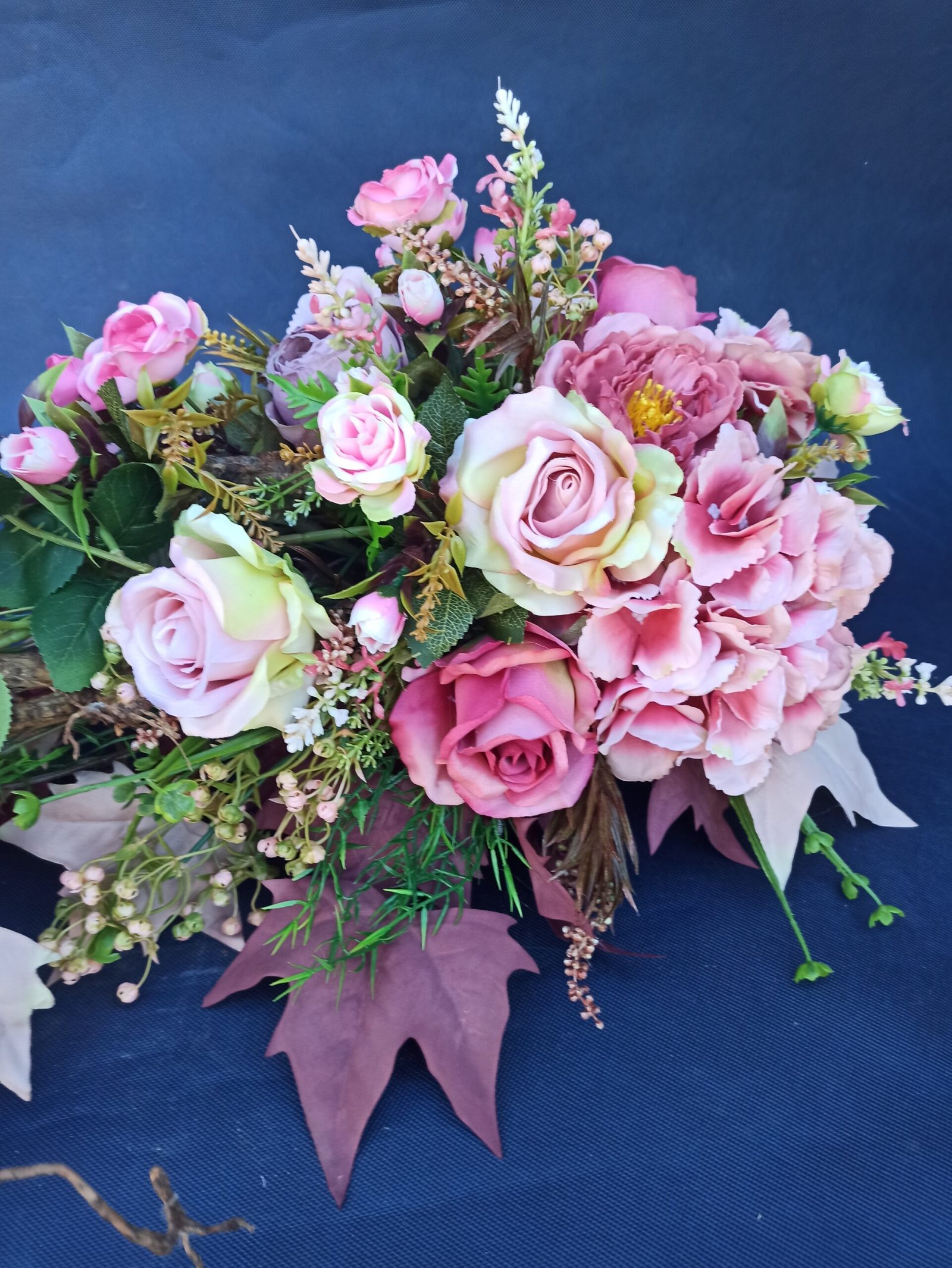 Wazon spływający na pomnik, który głównym elementem jest korzeń, na którym spływają delikatnie kwiaty. Całość bukietu jest z różnorodnych kwiatów otoczonych różnymi dekoracjami pod tytułem listki, trawki i inne dodatki.