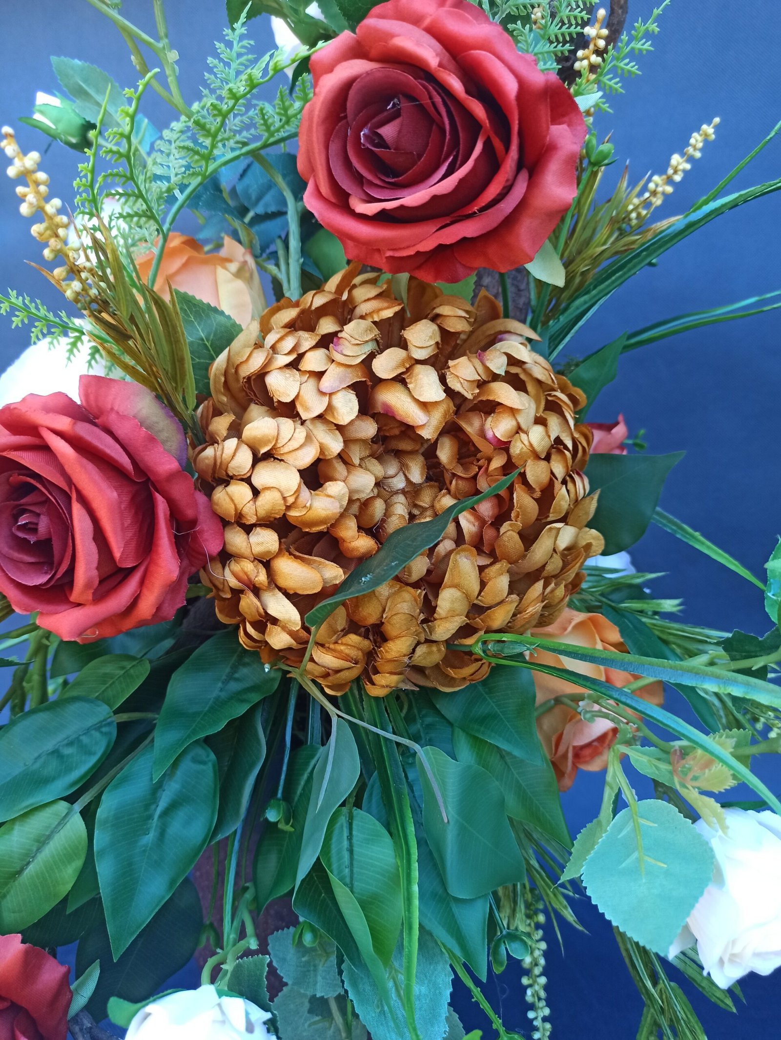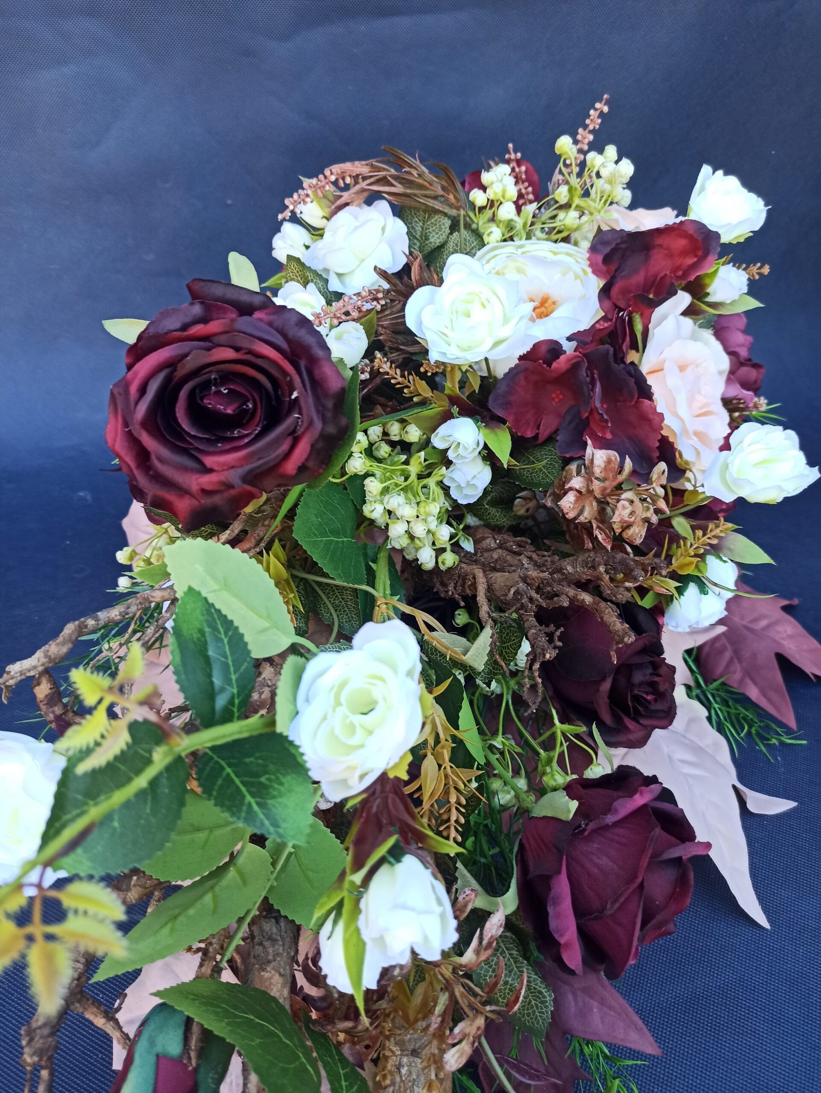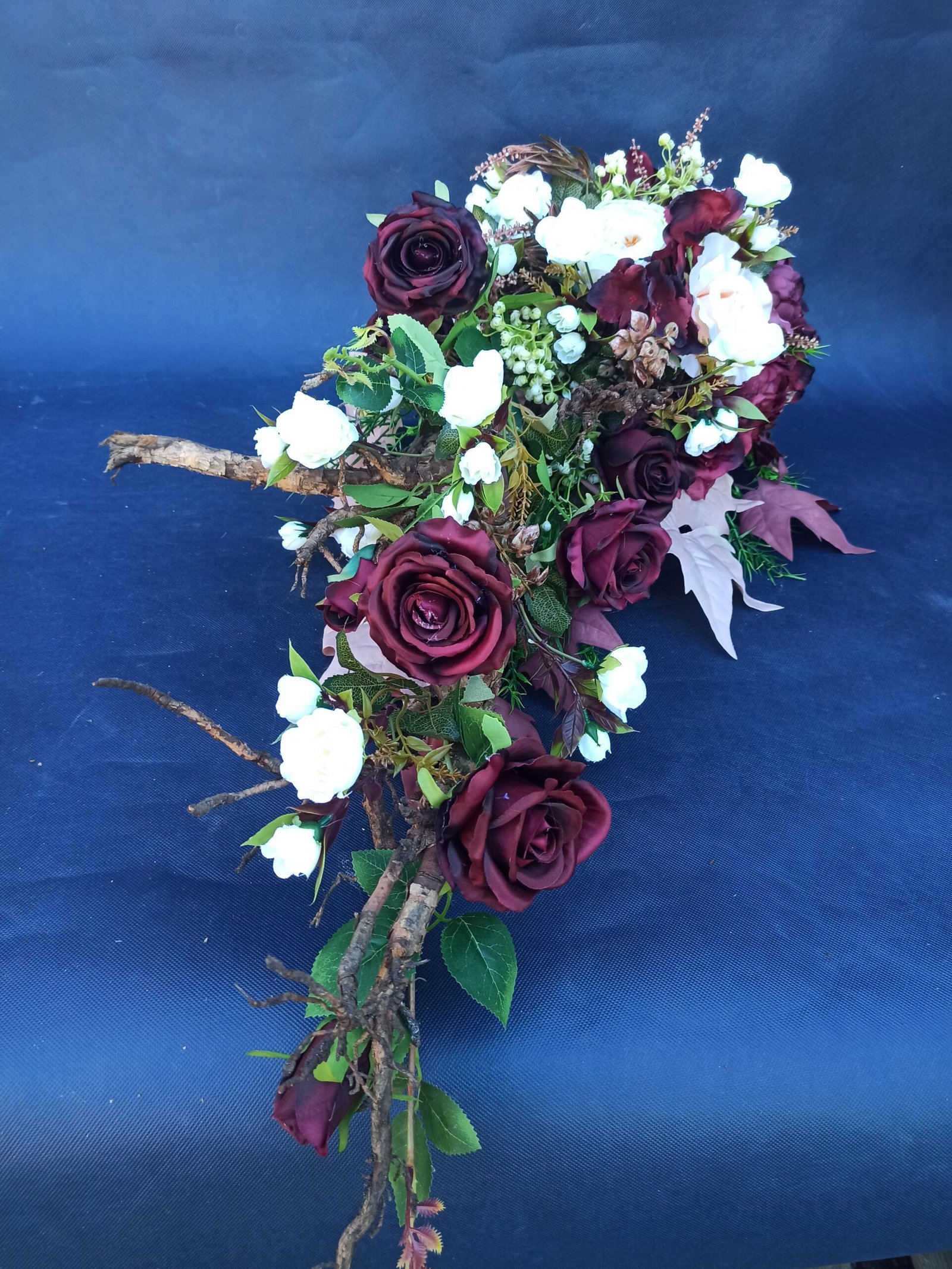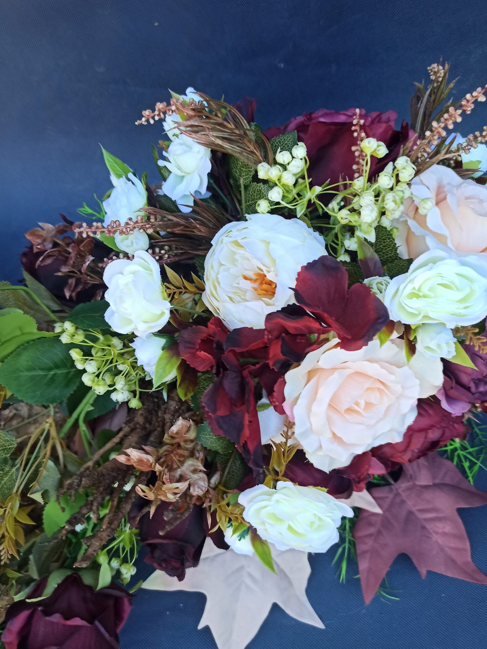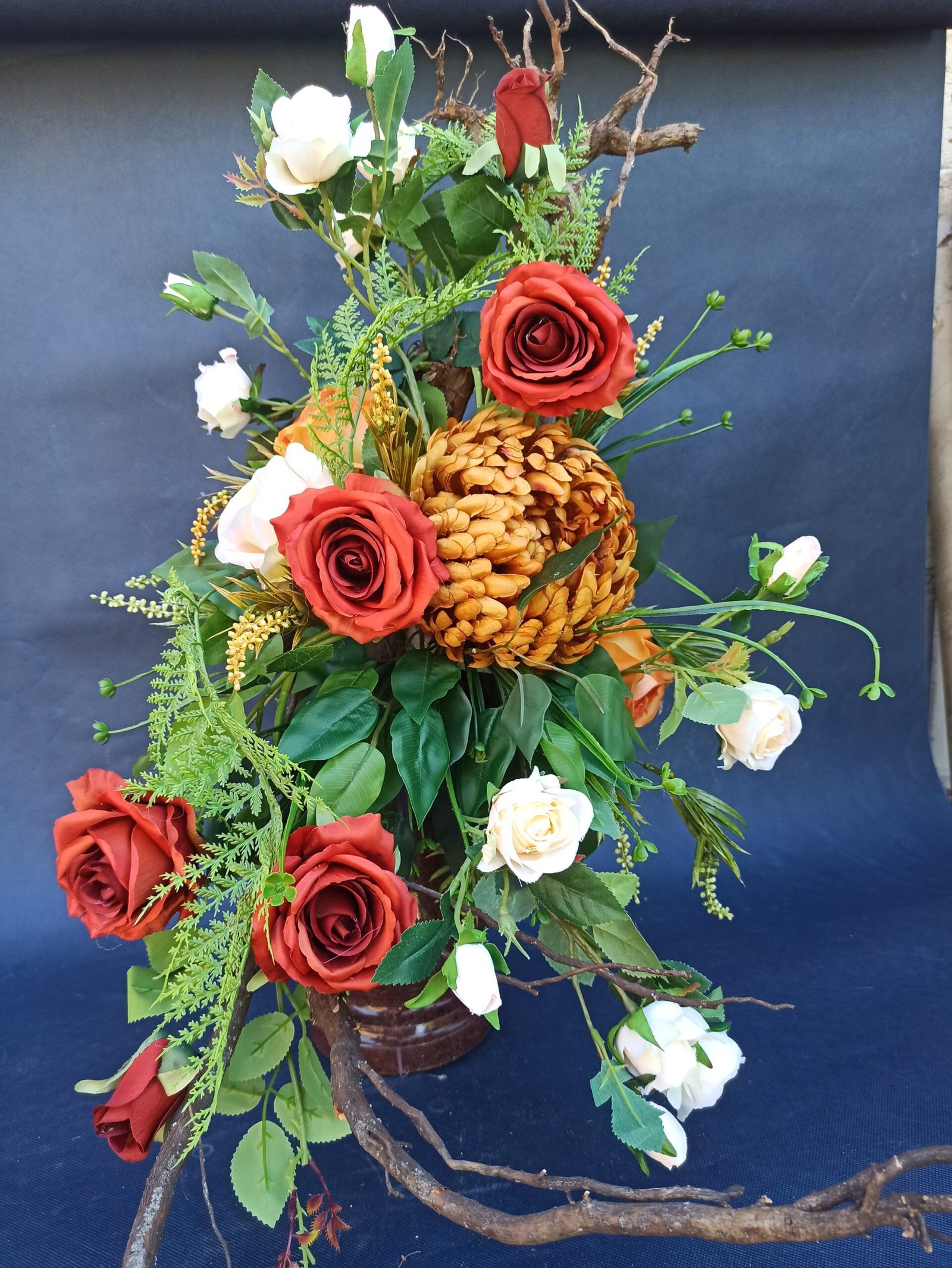 Wazon spływający na pomnik, który głównym elementem jest korzeń, na którym spływają delikatnie kwiaty. Całość bukietu jest z różnorodnych kwiatów otoczonych różnymi dekoracjami pod tytułem listki, trawki i inne dodatki.