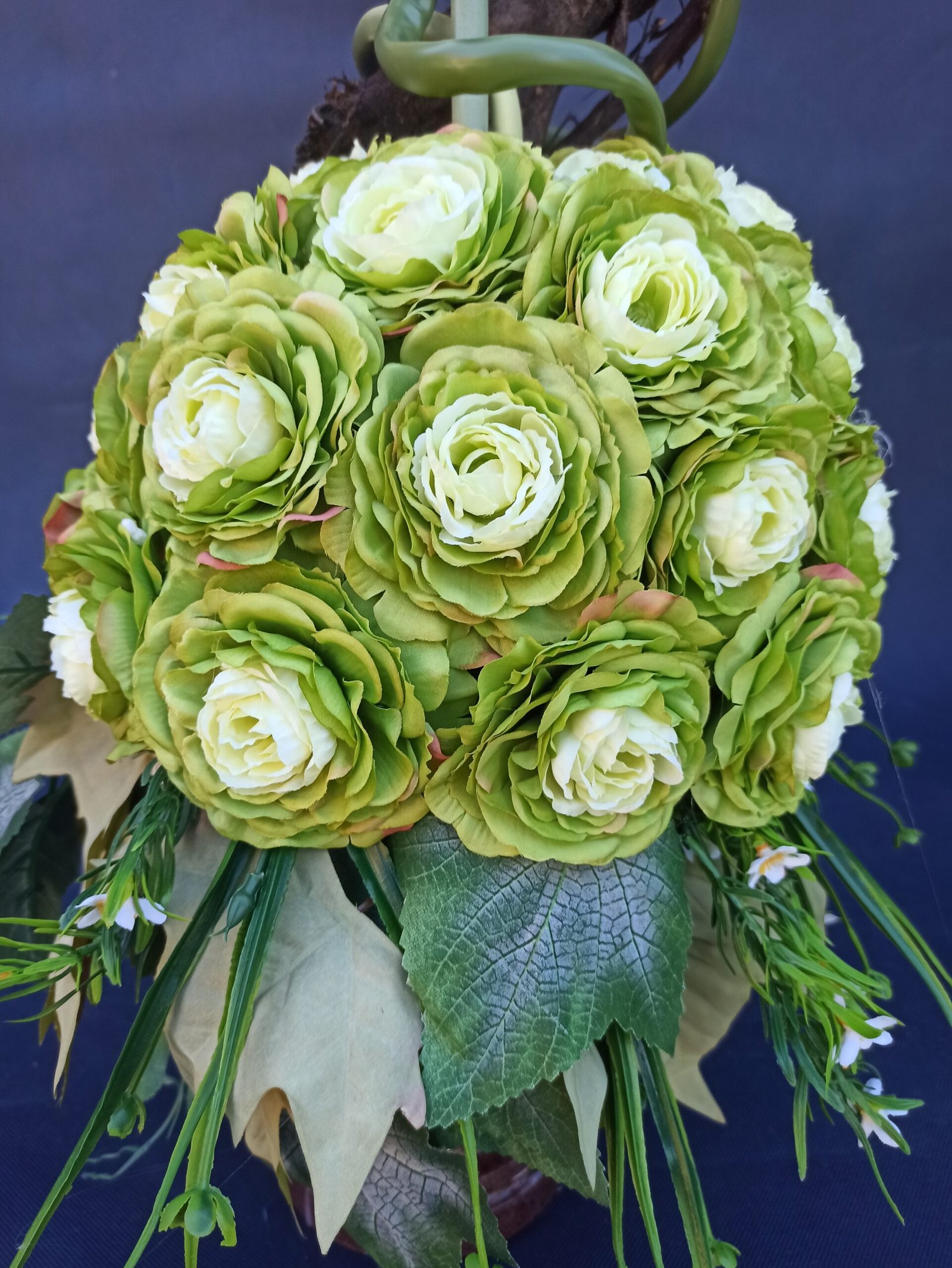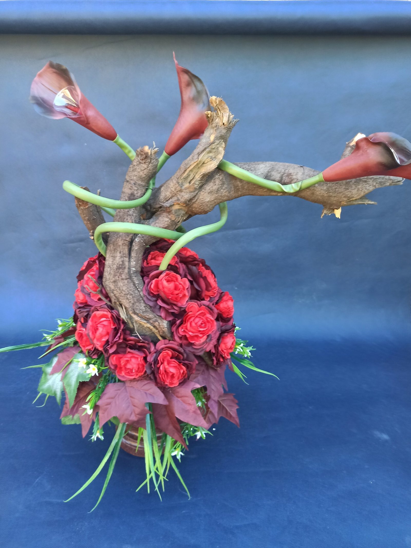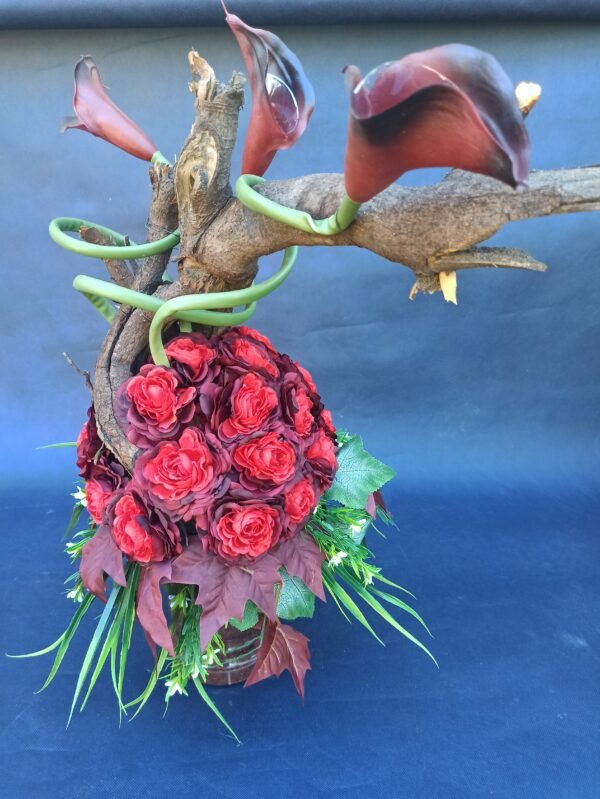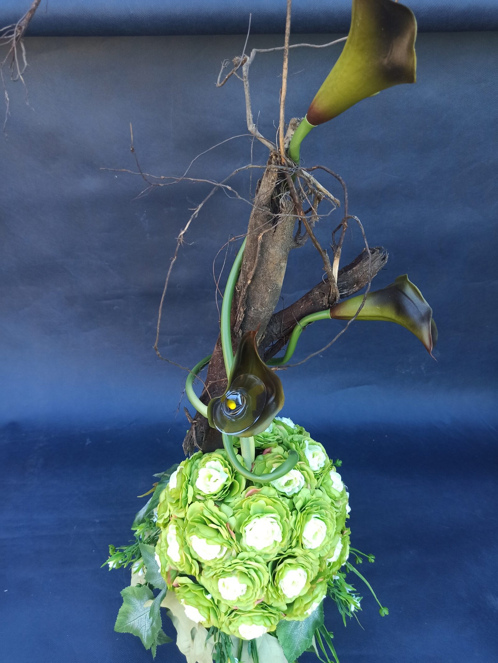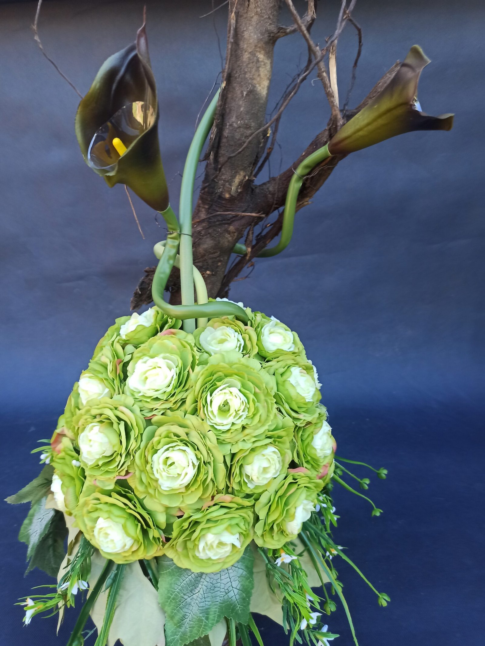 wazon na pomnik, którym elementem głównym są korzenie, po którym się wspinają pięknie kalle. Na dole tworzy się na wazonie piękny bukiet, idealnie utworzony w kule kwiatami i delikatnie spływającą kryzą zielonych dodatków, listków, trawek i małymi pączkami kwiatuszków.