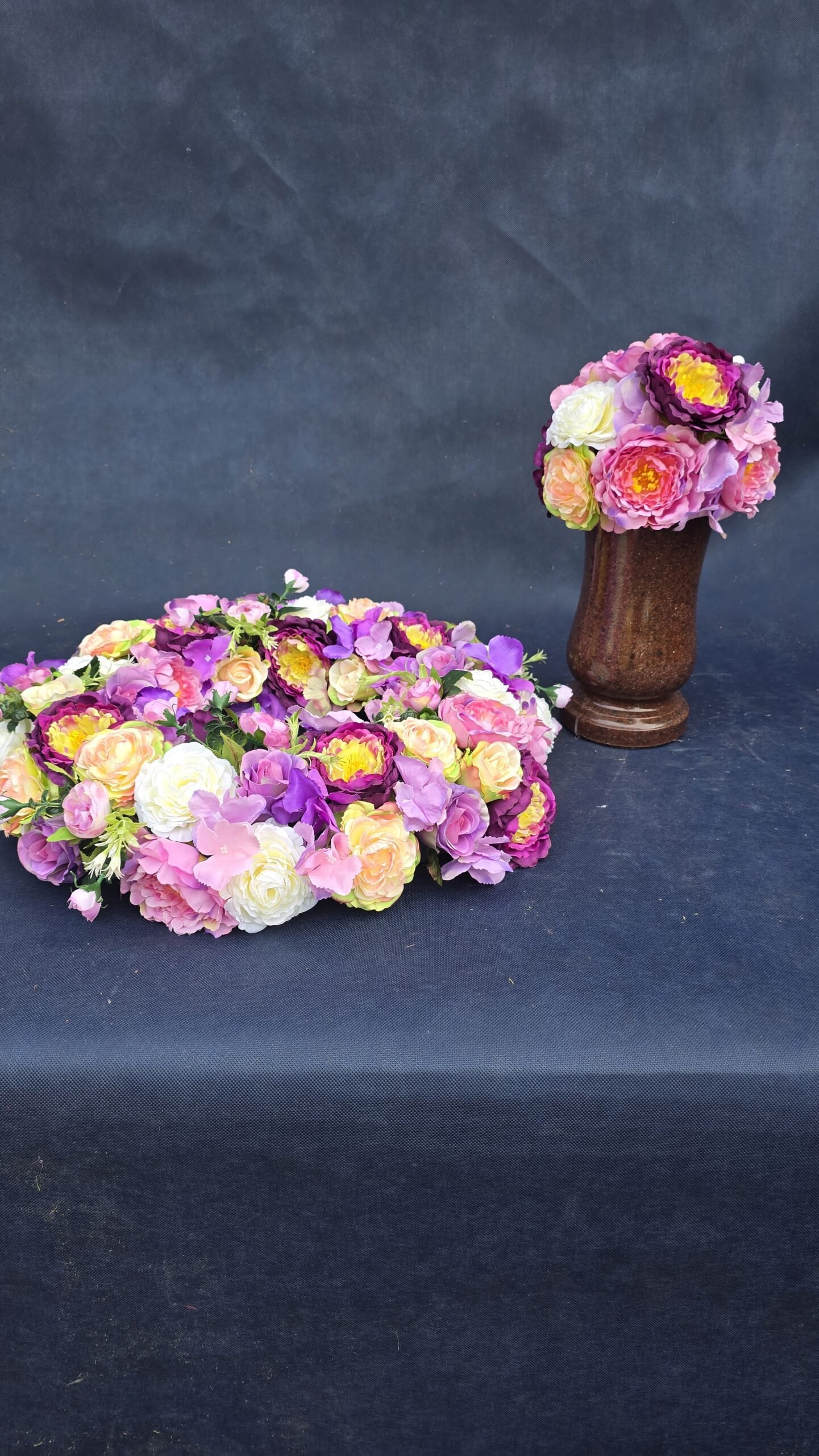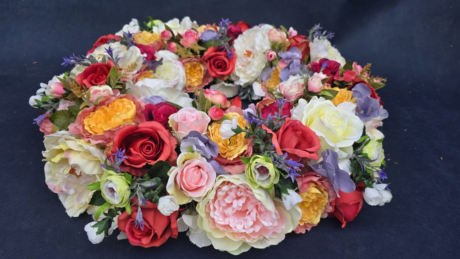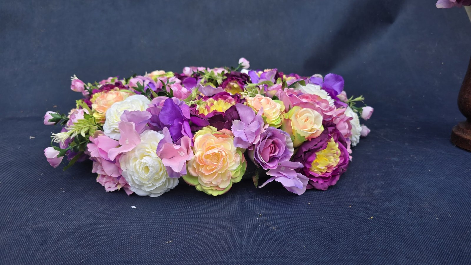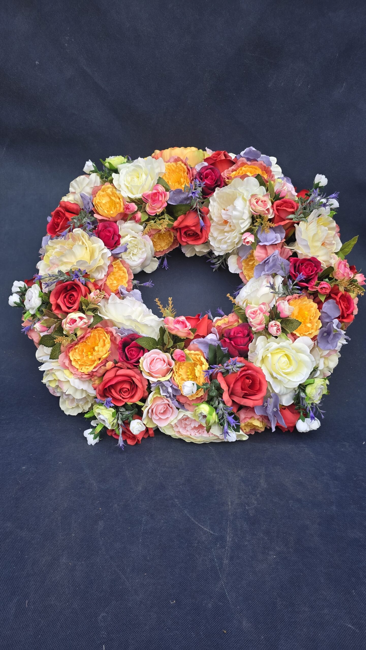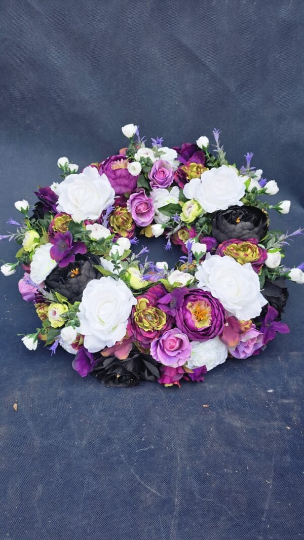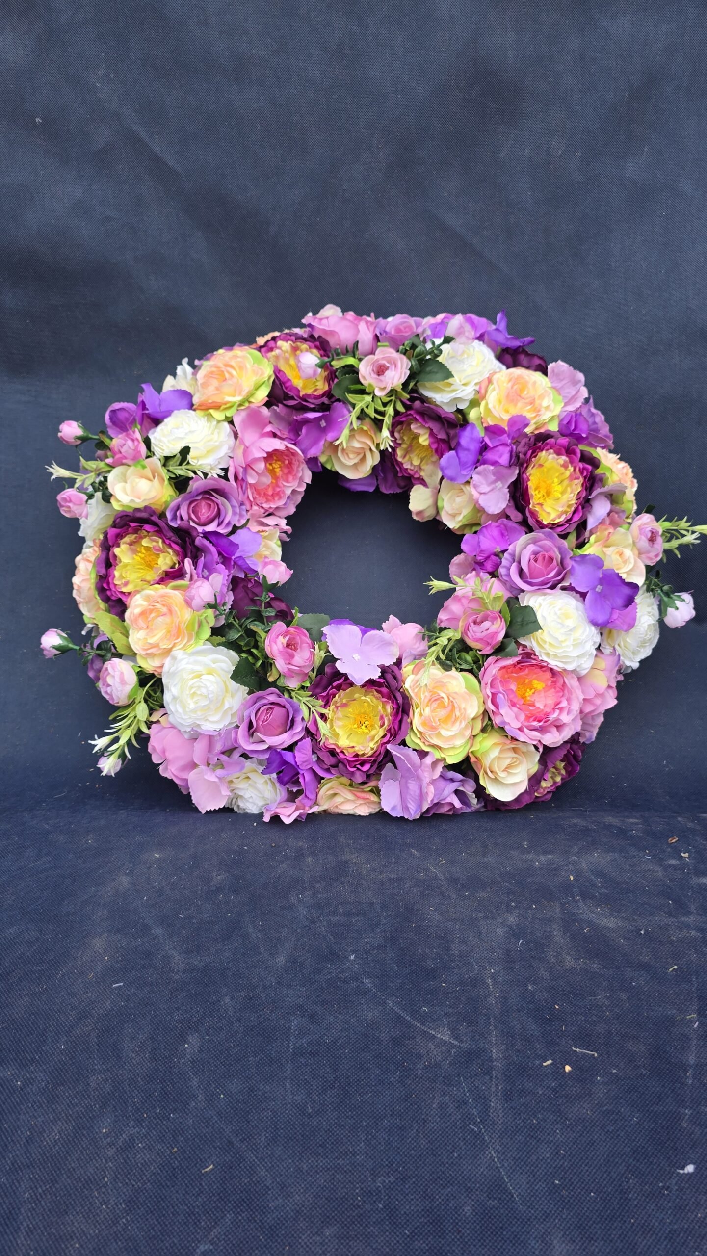 Wianek obtoczony peoniami, różyczkami, hortensjami i drobnymi kwiatuszkami, tworzący wyjątkową, harmonijną kompozycję. Każdy element jest starannie ułożony, a całość przyciąga wzrok. Do wianka można dokupić wazonik w tym samym zestawie kwiatowym, tworząc elegancki komplet.