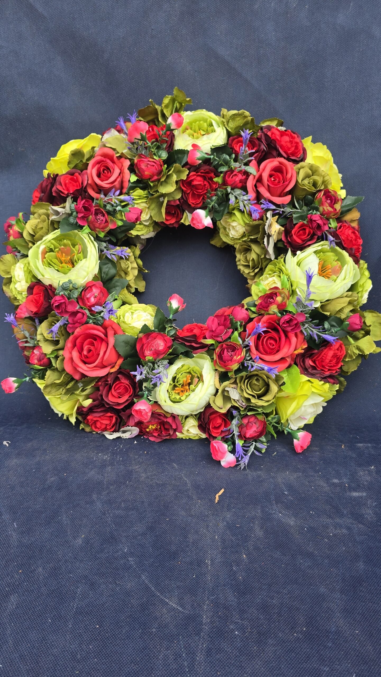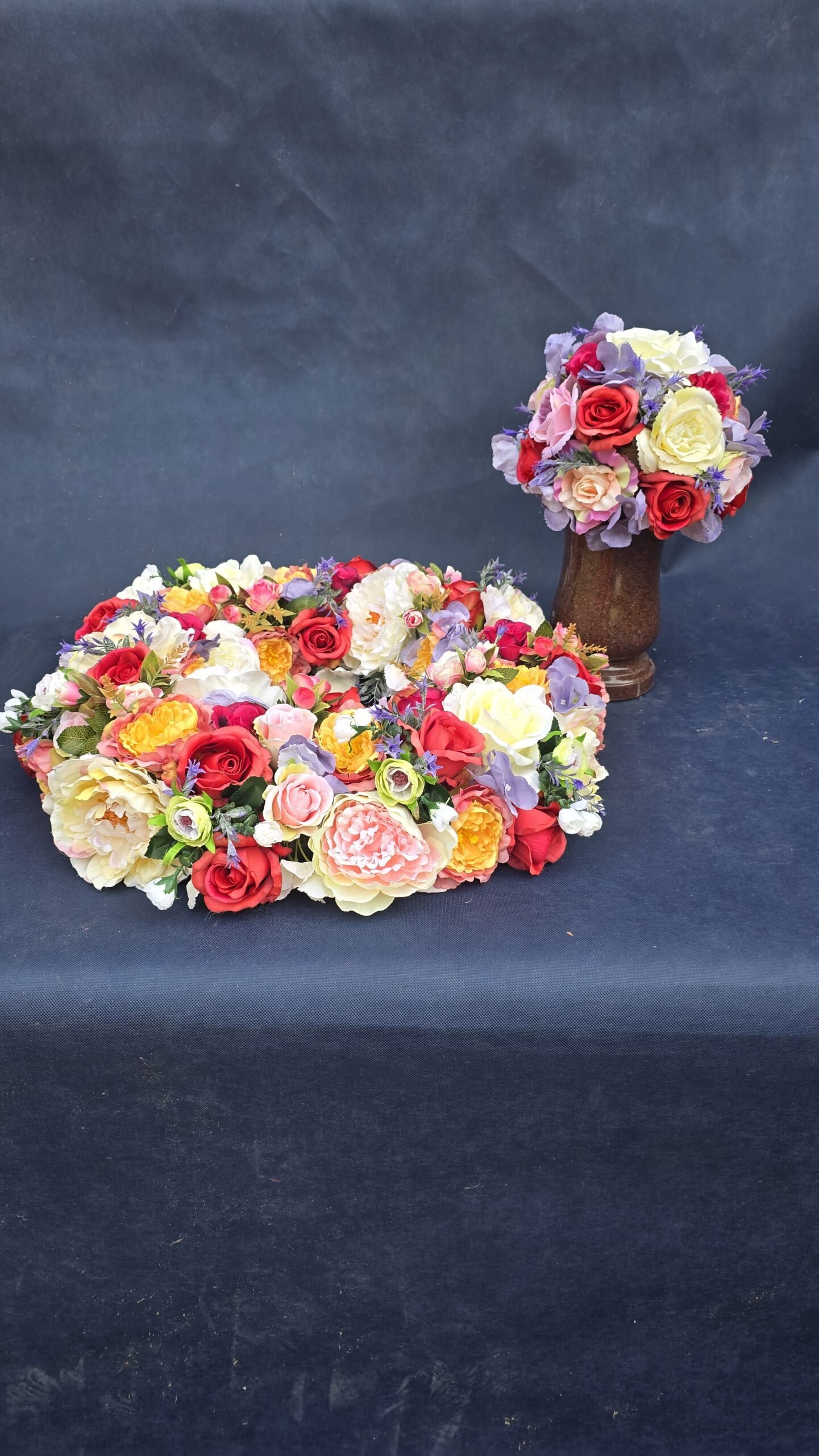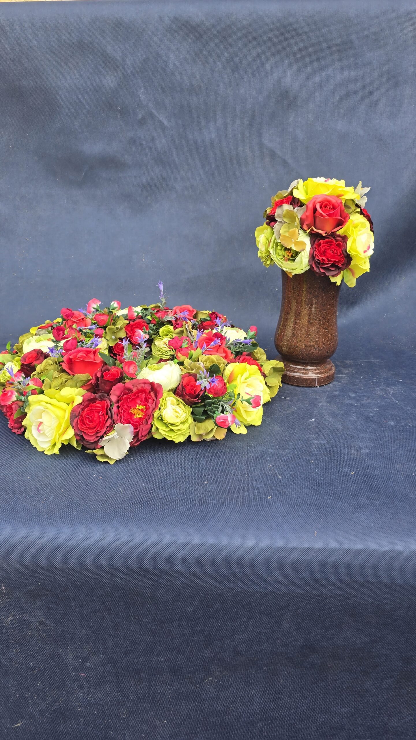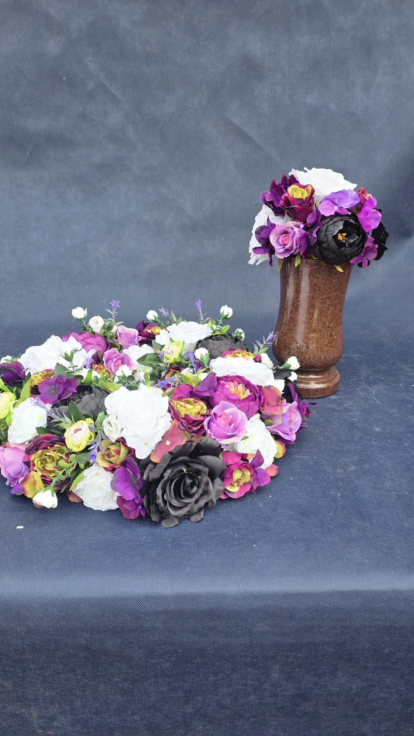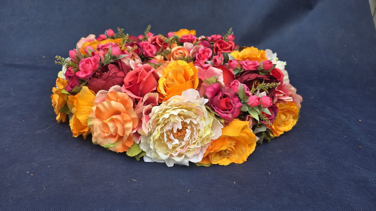 Wianek obtoczony peoniami, różyczkami, hortensjami i drobnymi kwiatuszkami, tworzący wyjątkową, harmonijną kompozycję. Każdy element jest starannie ułożony, a całość przyciąga wzrok. Do wianka można dokupić wazonik w tym samym zestawie kwiatowym, tworząc elegancki komplet.