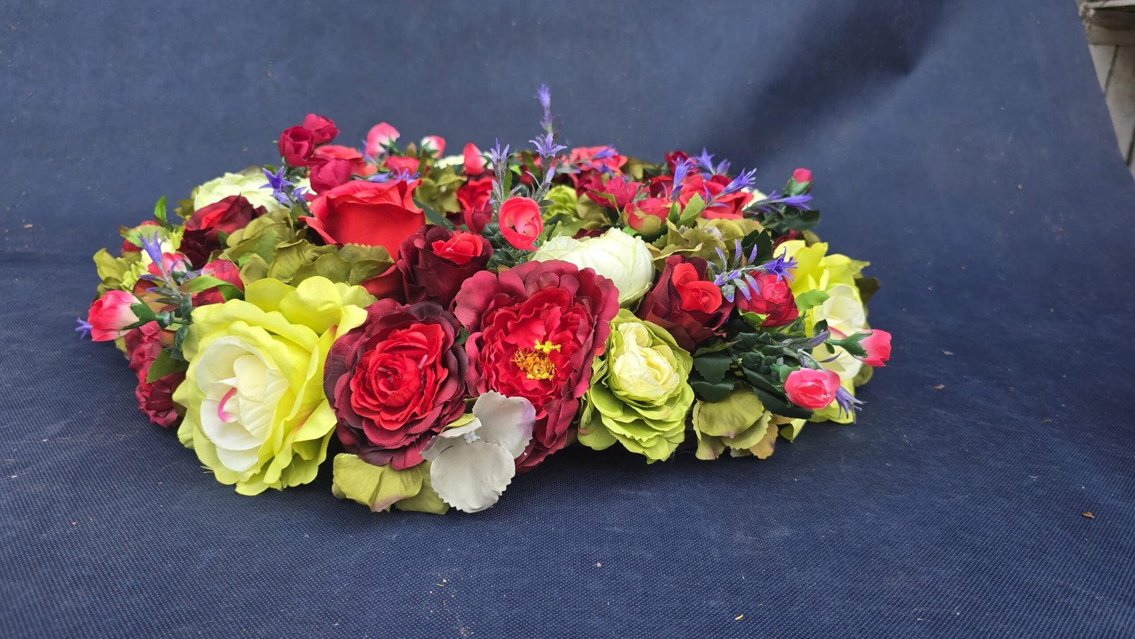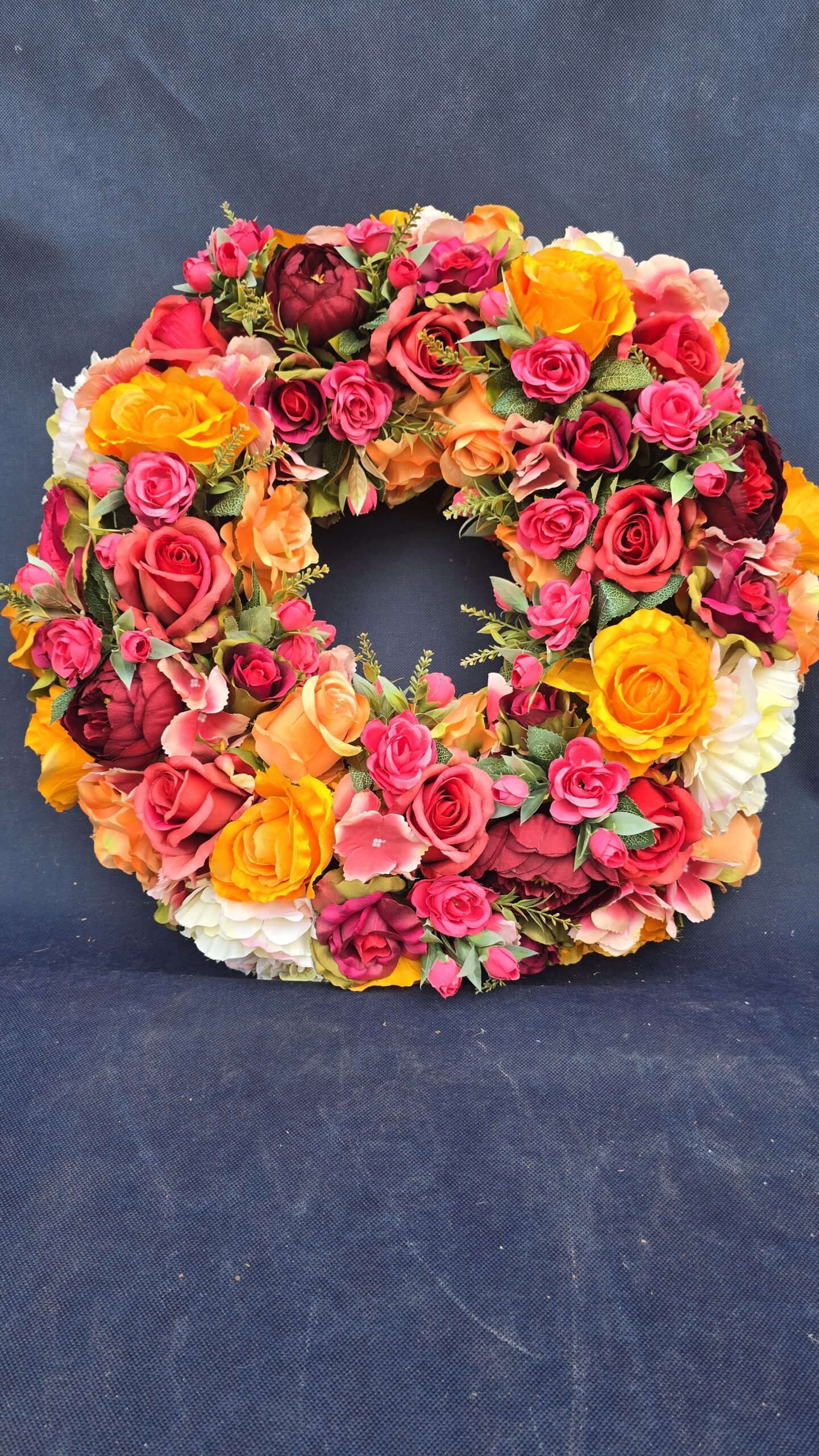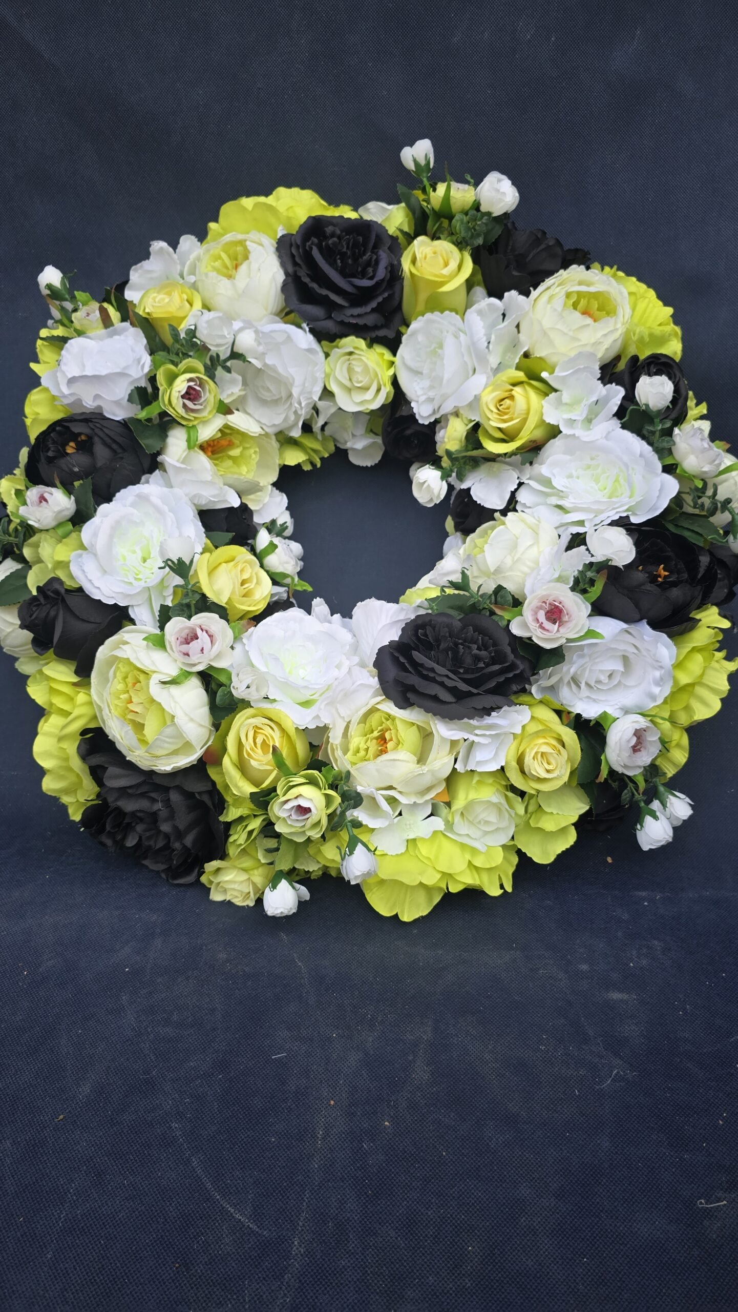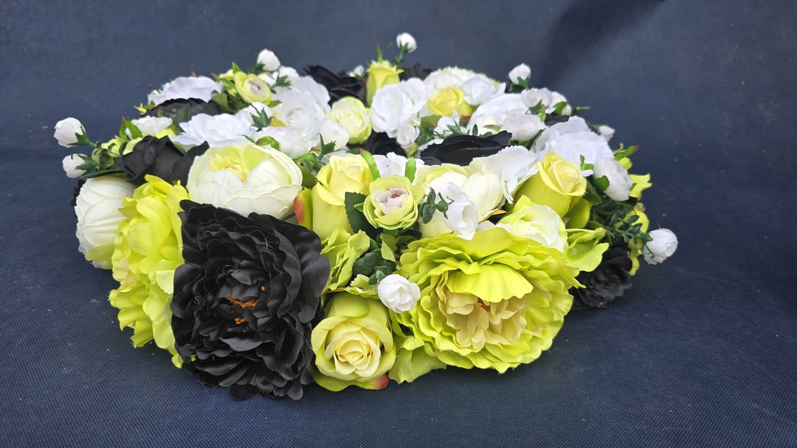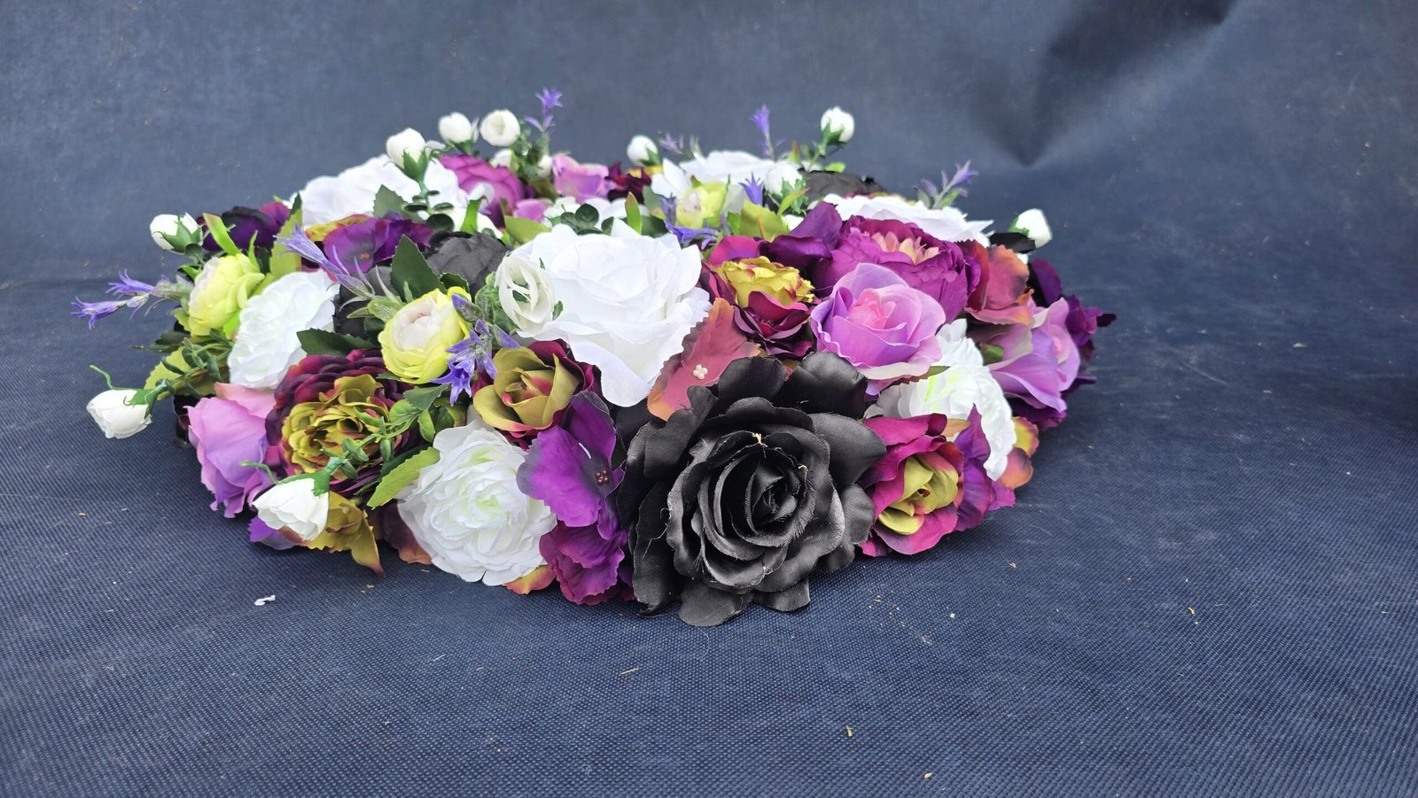 Wianek obtoczony peoniami, różyczkami, hortensjami i drobnymi kwiatuszkami, tworzący wyjątkową, harmonijną kompozycję. Każdy element jest starannie ułożony, a całość przyciąga wzrok. Do wianka można dokupić wazonik w tym samym zestawie kwiatowym, tworząc elegancki komplet.
