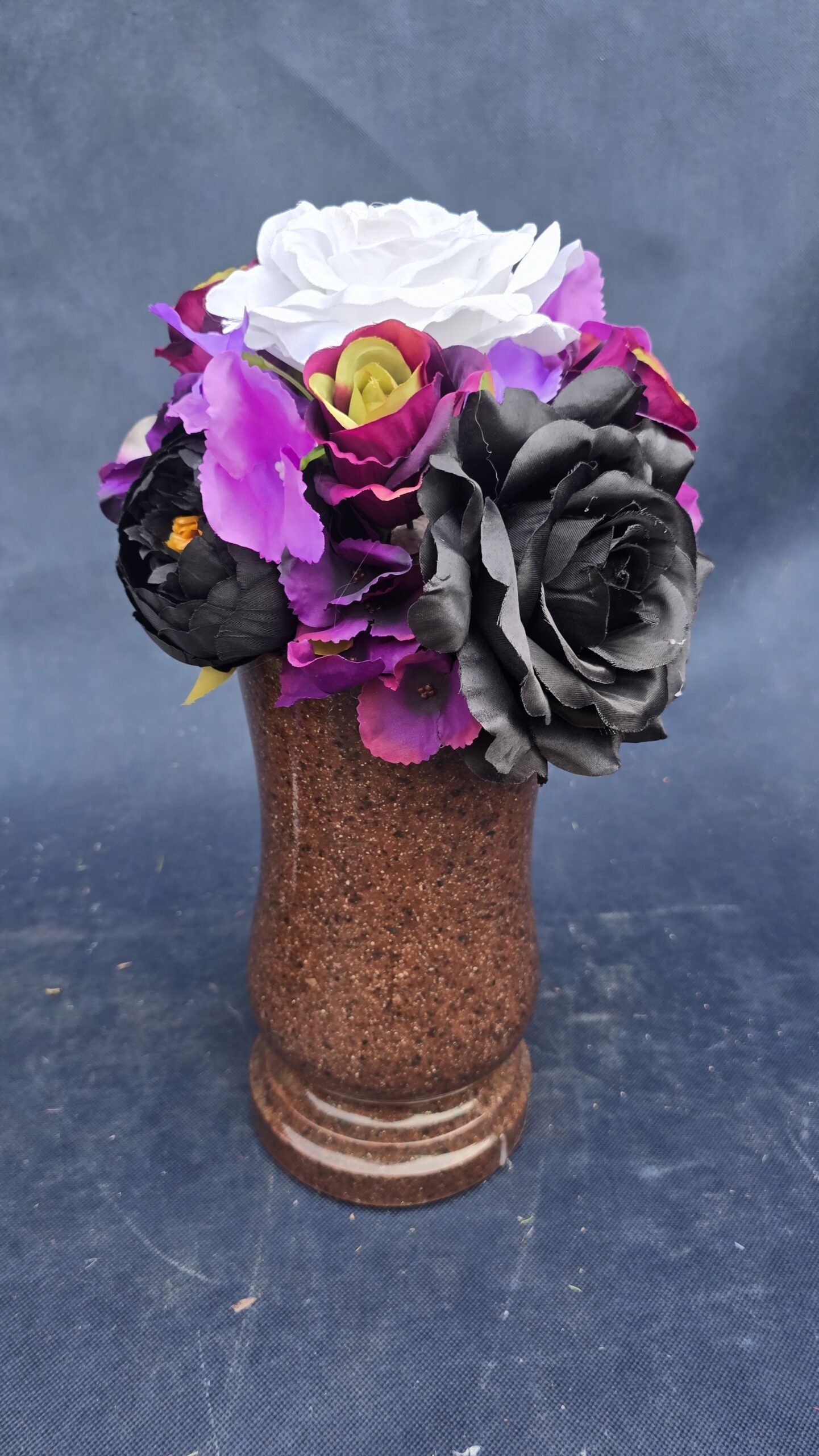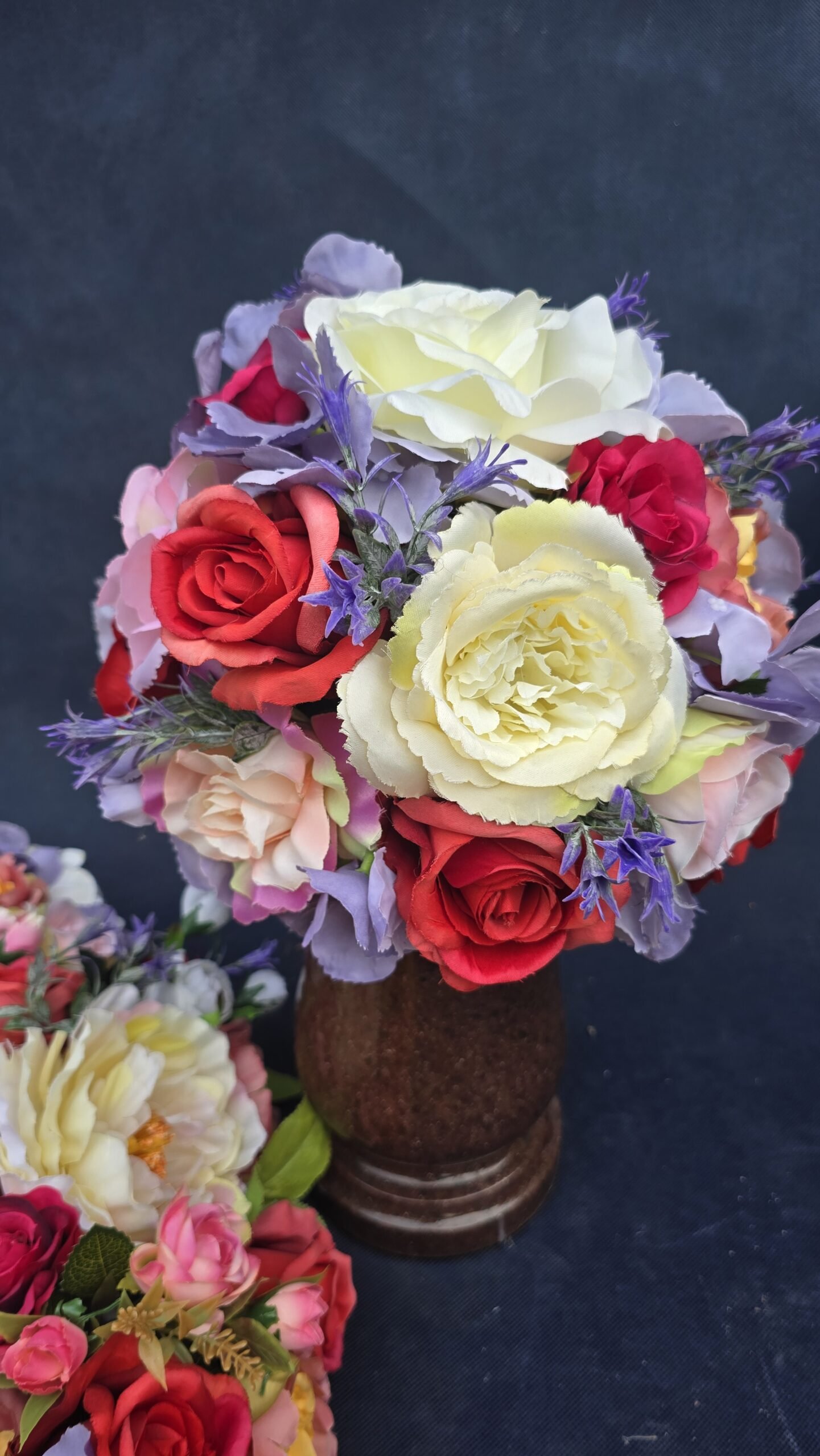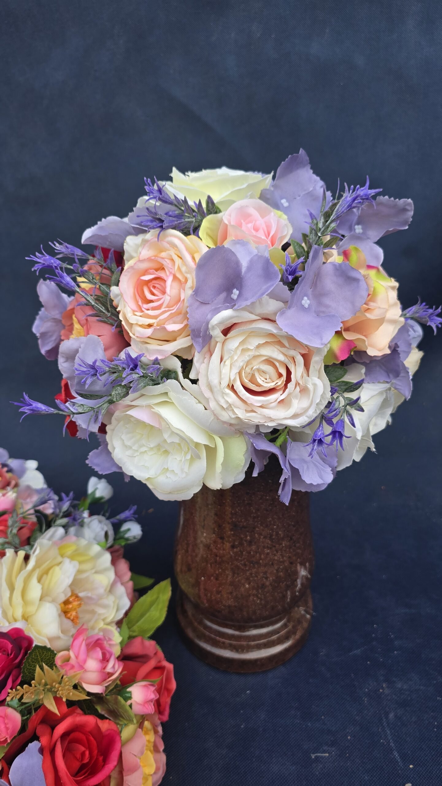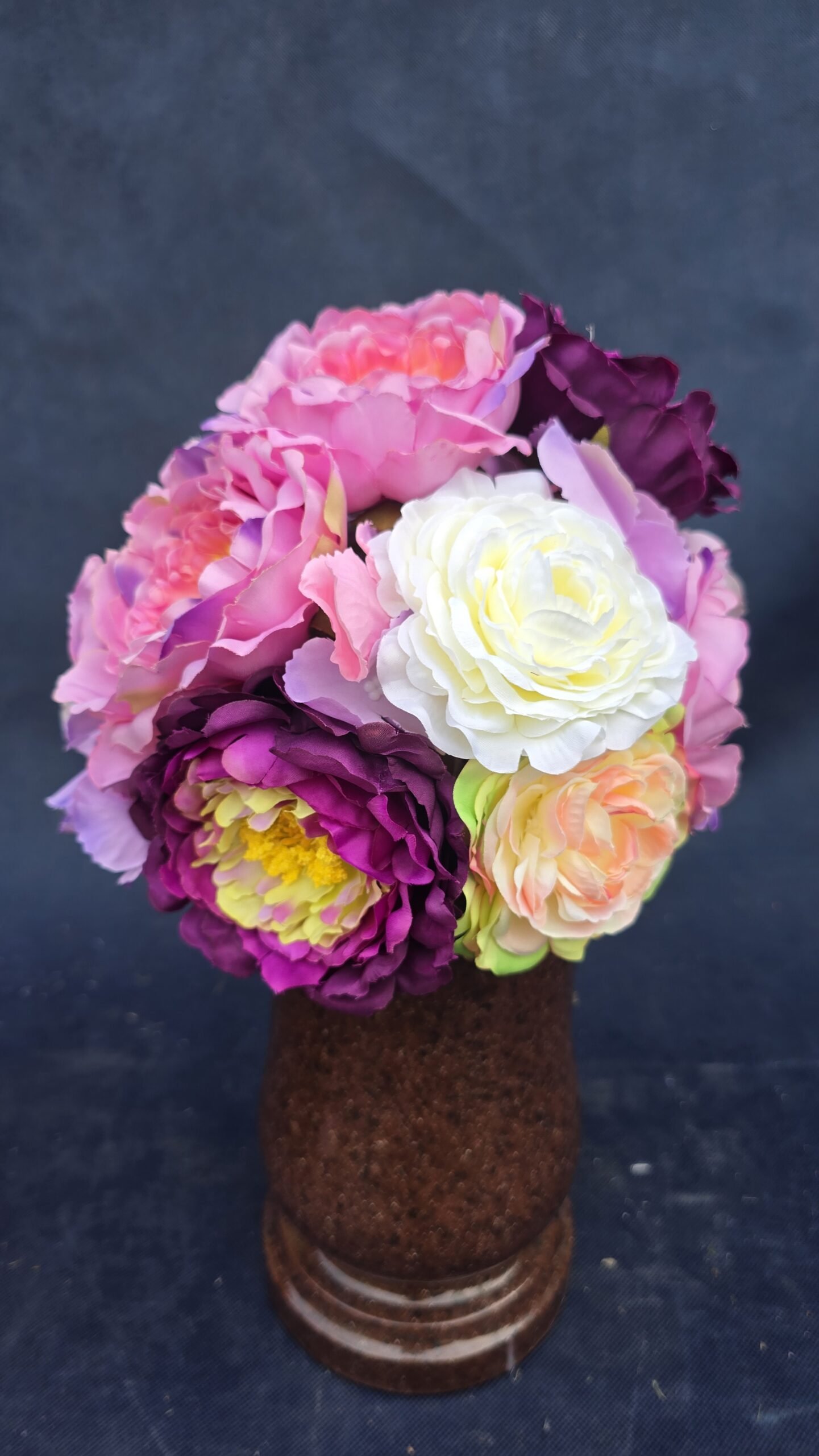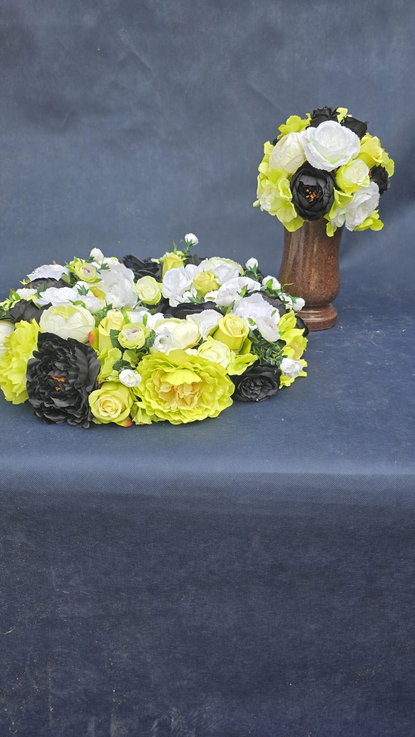 Wianek obtoczony peoniami, różyczkami, hortensjami i drobnymi kwiatuszkami, tworzący wyjątkową, harmonijną kompozycję. Każdy element jest starannie ułożony, a całość przyciąga wzrok. Do wianka można dokupić wazonik w tym samym zestawie kwiatowym, tworząc elegancki komplet.